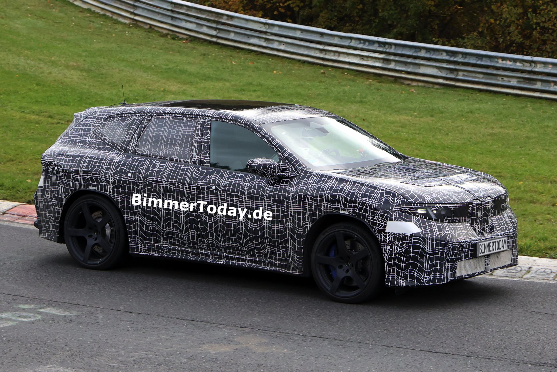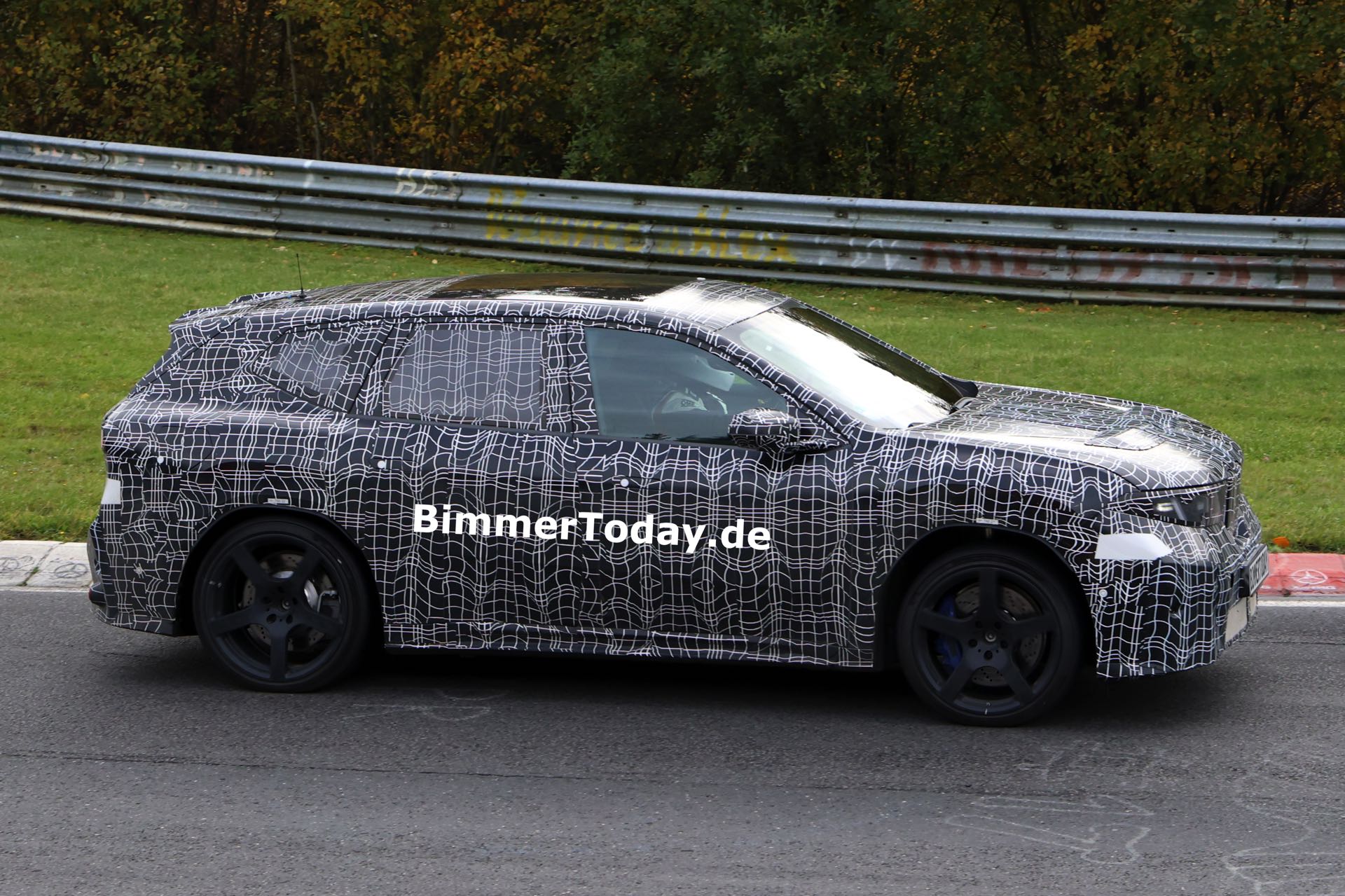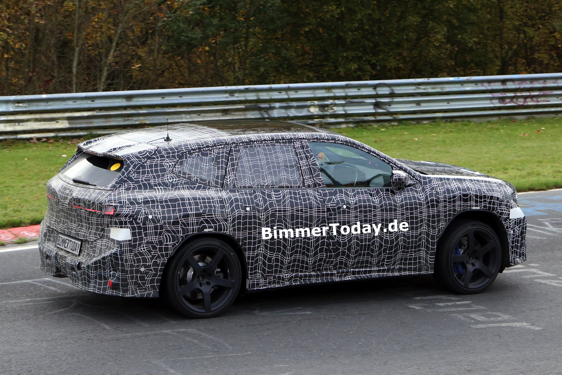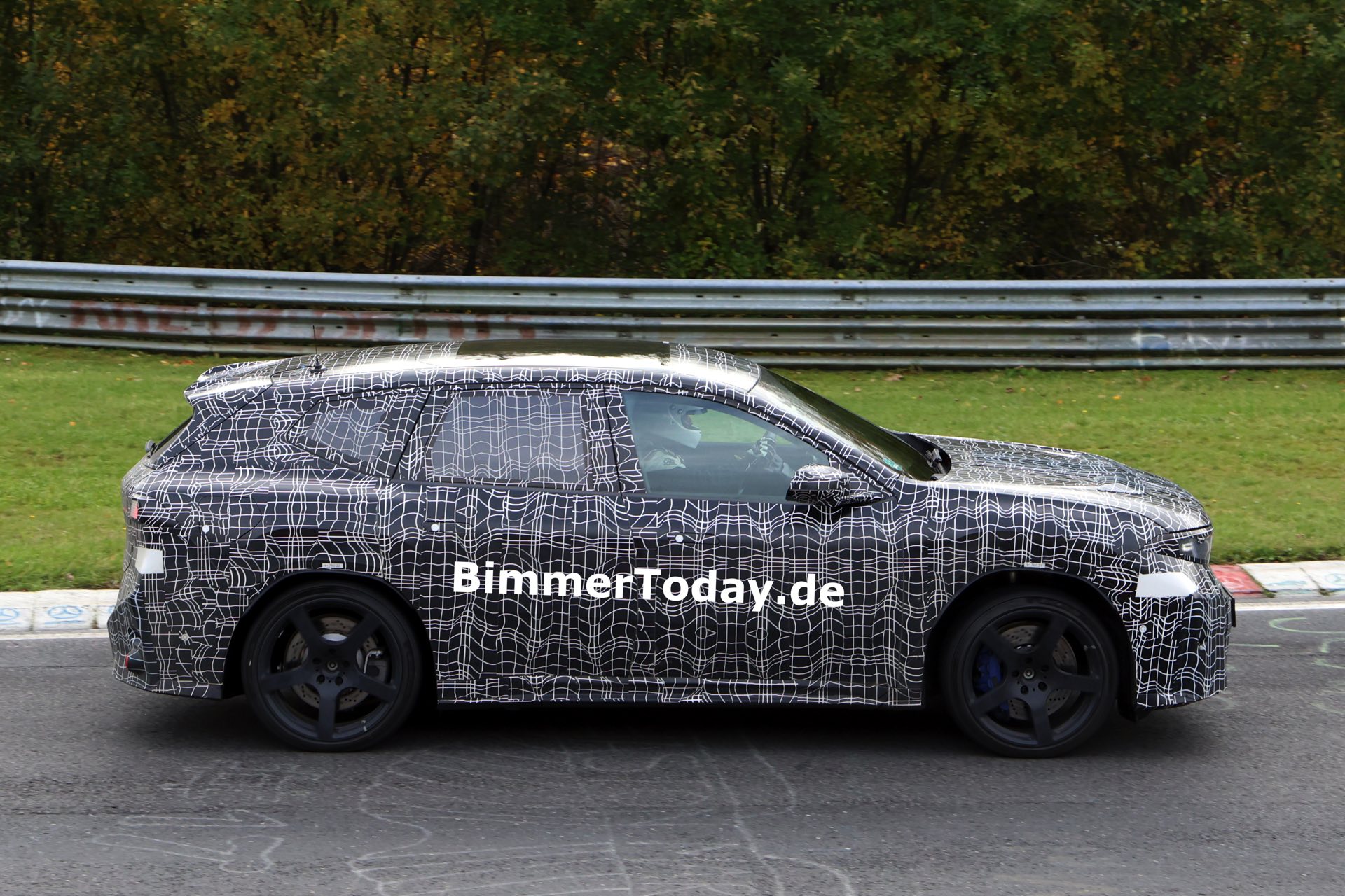 In der Seitenansicht fallen außerdem die vorne und hinten gelochten Bremsscheiben ins Auge, die auf eine extrem standfeste Bremsanlage hinweisen. Die offenbar weit oben im Lastenheft platzierte Hitzebeständigkeit und Ausdauer der Bremsanlage ist auch deshalb bemerkenswert, weil der Elektroantrieb mit der Rekuperationsleistung von voraussichtlich vier E-Maschinen die konventionelle Bremse in den meisten Situationen diesseits der Rennstrecke überflüssig machen dürfte – doch im Fall des BMW iX3 M zählt standhafte Performance unter Extrembedingungen ganz offenbar zum Anspruch.