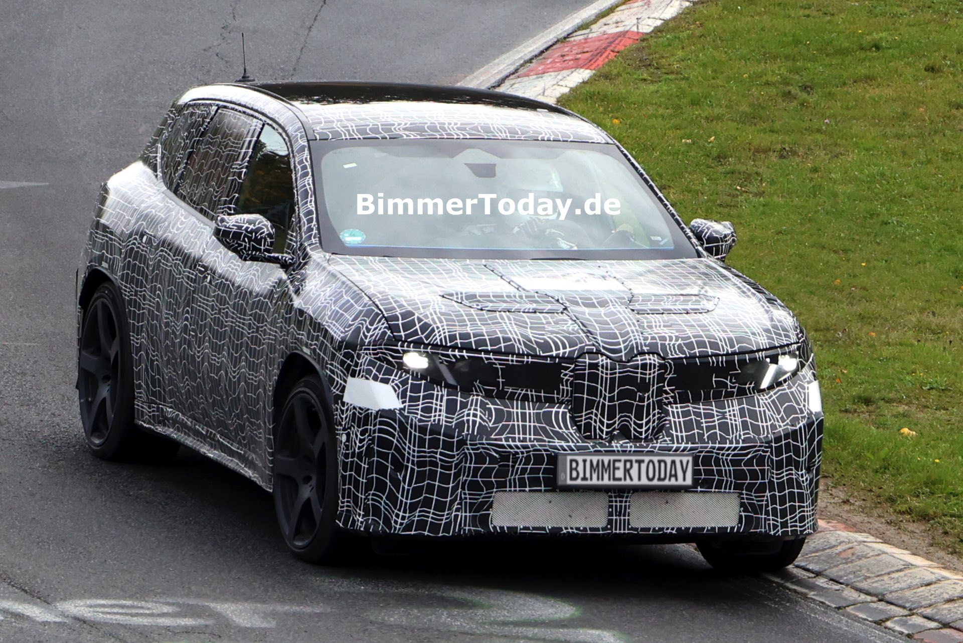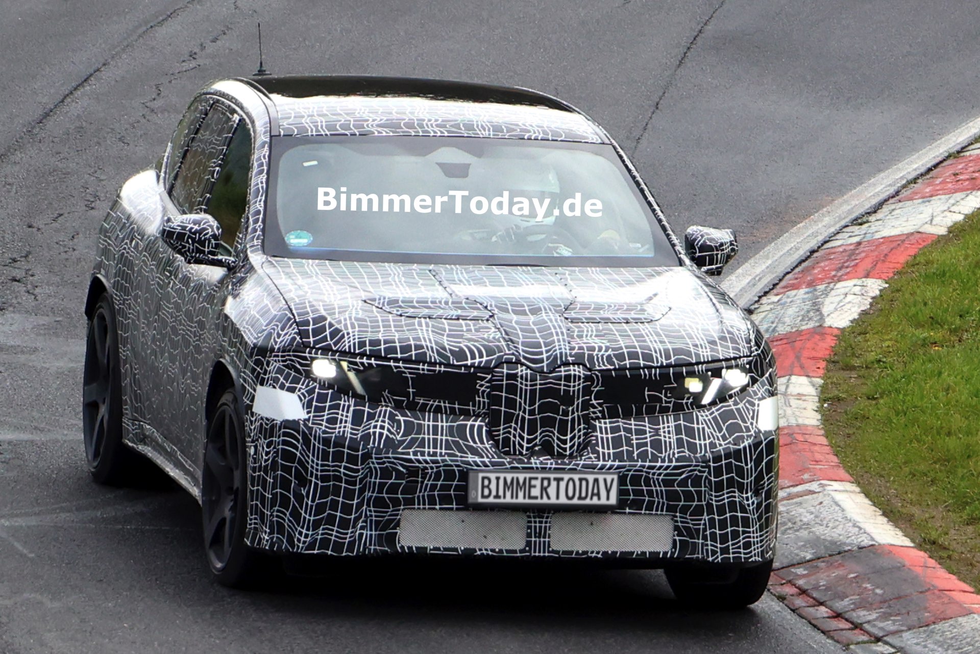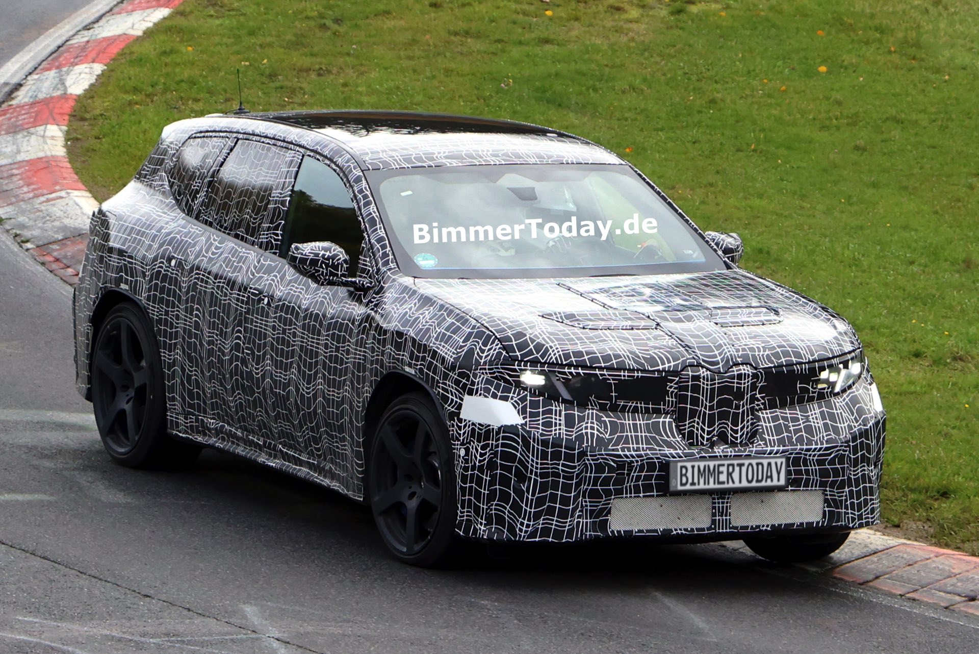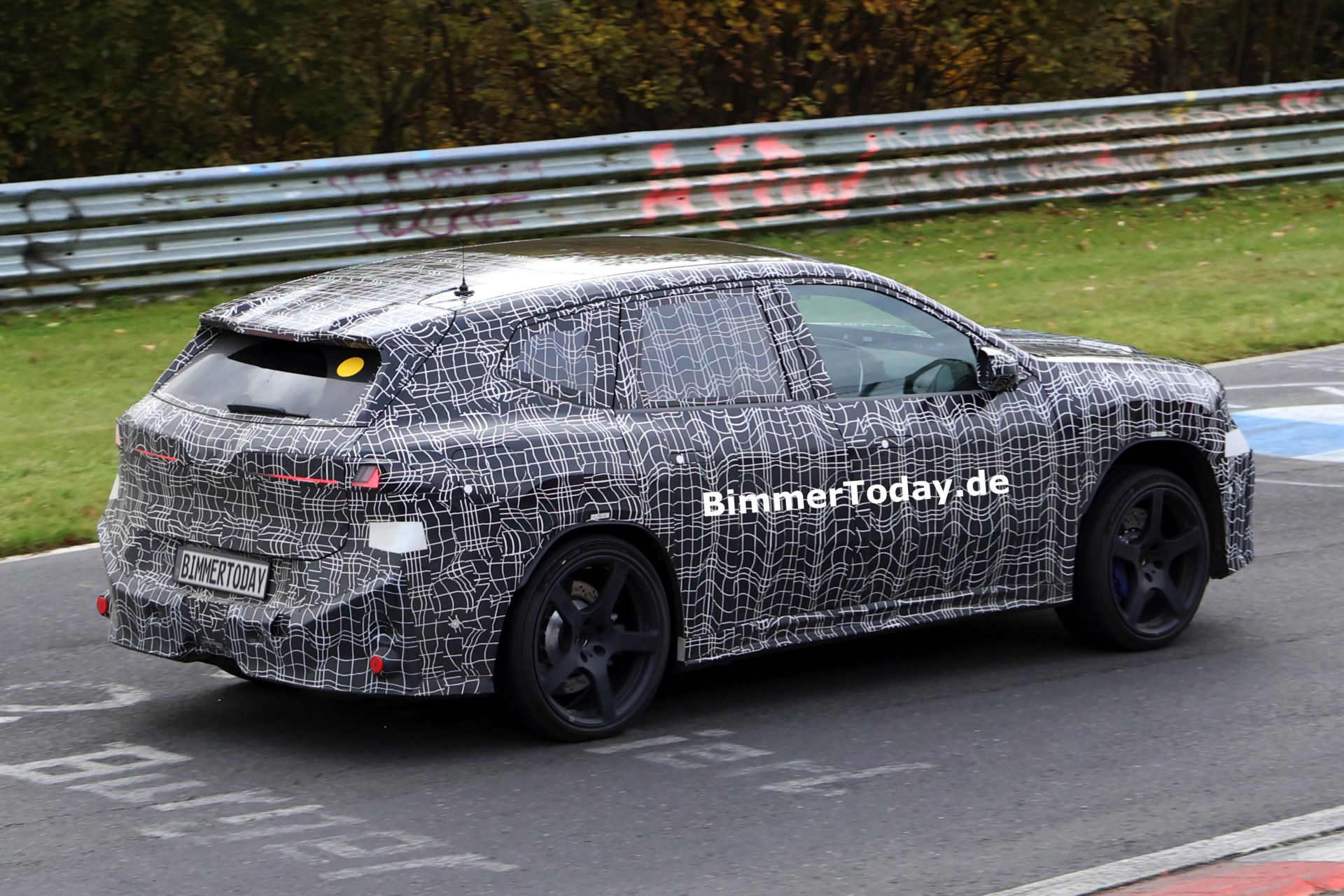 In der Seitenansicht fallen außerdem die vorne und hinten gelochten Bremsscheiben ins Auge, die auf eine extrem standfeste Bremsanlage hinweisen. Die offenbar weit oben im Lastenheft platzierte Hitzebeständigkeit und Ausdauer der Bremsanlage ist auch deshalb bemerkenswert, weil der Elektroantrieb mit der Rekuperationsleistung von voraussichtlich vier E-Maschinen die konventionelle Bremse in den meisten Situationen diesseits der Rennstrecke überflüssig machen dürfte – doch im Fall des BMW iX3 M zählt standhafte Performance unter Extrembedingungen ganz offenbar zum Anspruch.