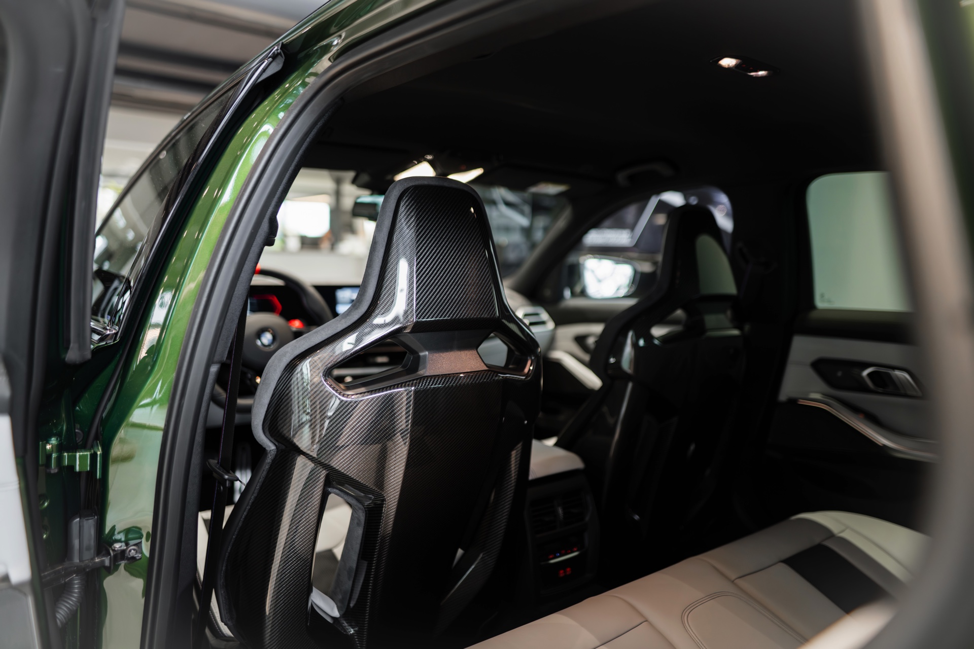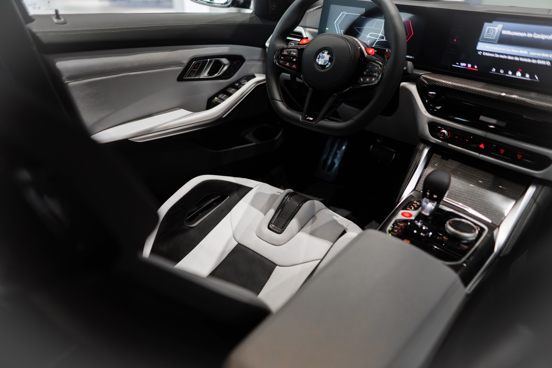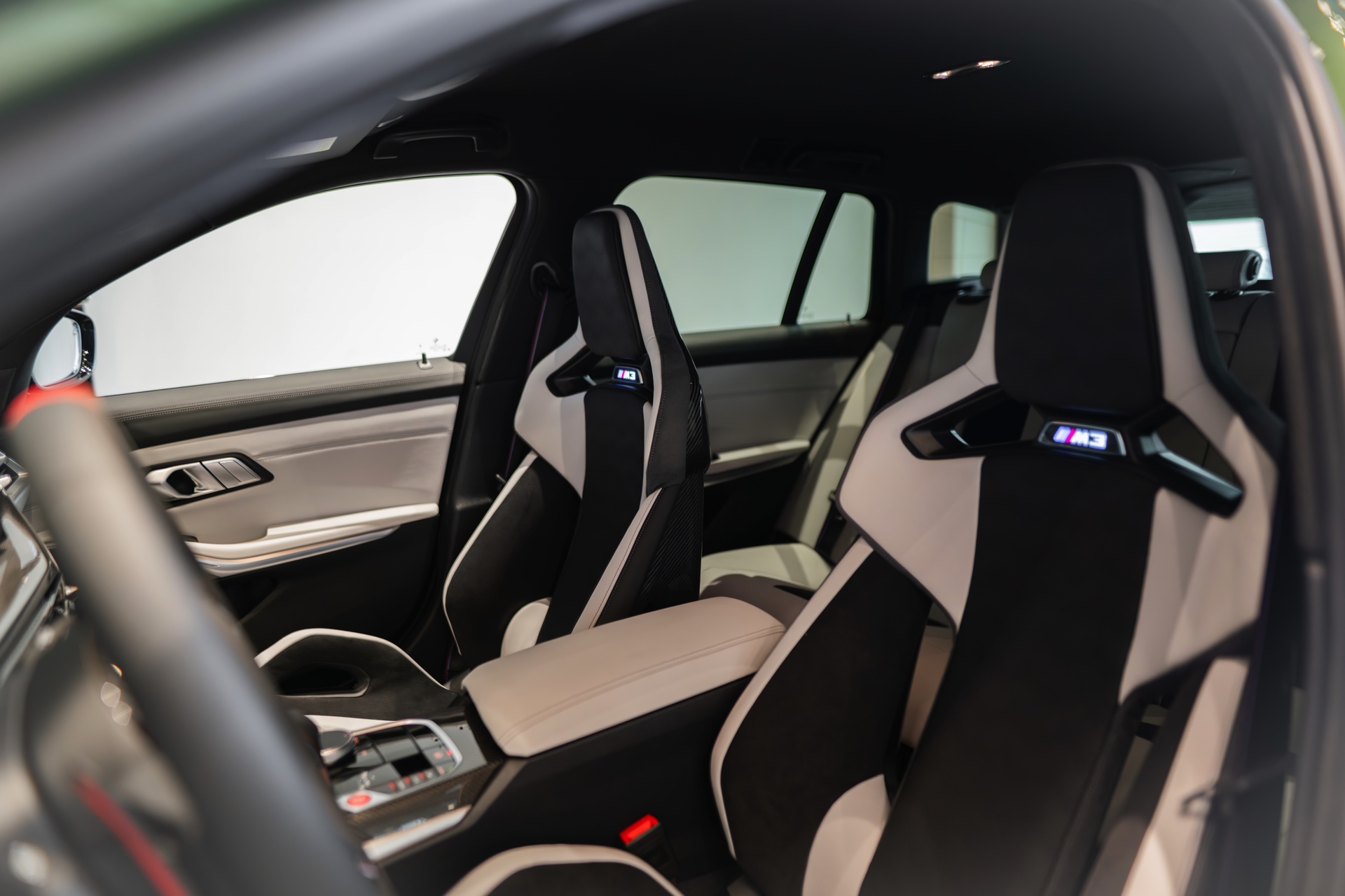 Auch im Innenraum spielt Carbon eine Schlüsselrolle, denn es ist die perfekte Ergänzung zur Bicolor-Lederausstattung Merino in Silverstone und Schwarz: Neben den Interieurleisten rücken dabei vor allem die M Carbon Schalensitze in den Fokus, die mit ihren stark ausgeformten Sitzwangen und der Vorbereitung für Mehrpunktgurte entscheidend zum Rennstrecken-Flair an Bord des M3 Touring beitragen. Außerdem erhalten etwaige Fond-Passagiere in Form der Carbon-Schalen an der Rückseite der Sitze einen echten Hingucker.
