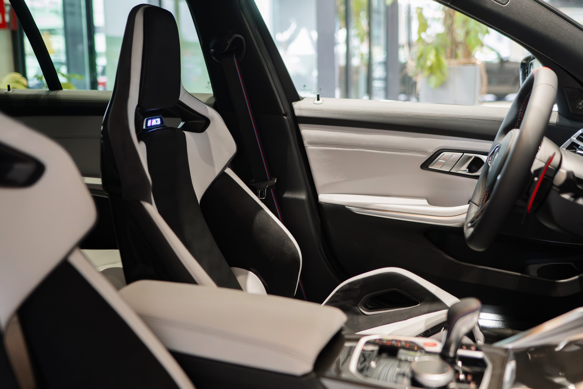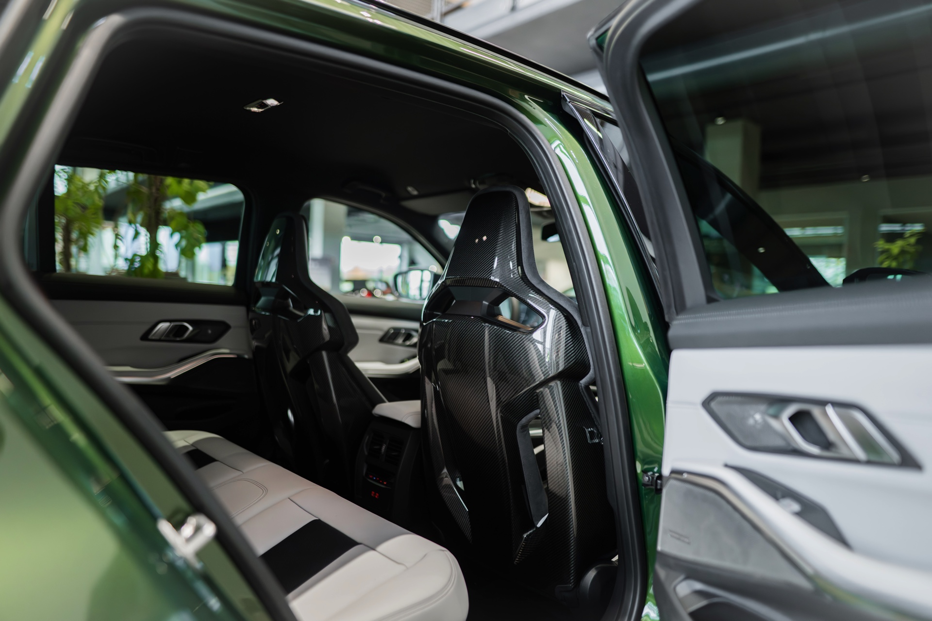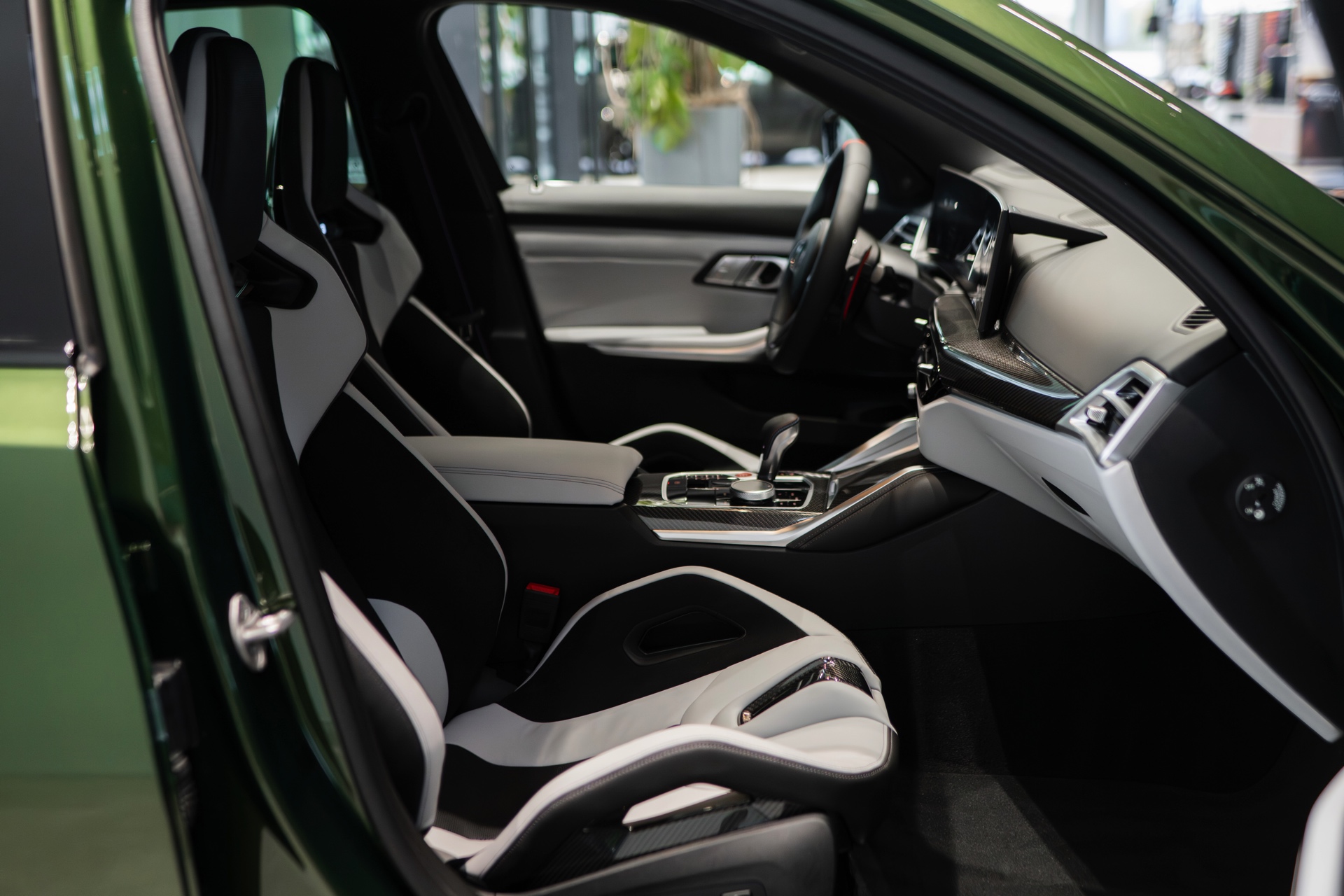 Auch im Innenraum spielt Carbon eine Schlüsselrolle, denn es ist die perfekte Ergänzung zur Bicolor-Lederausstattung Merino in Silverstone und Schwarz: Neben den Interieurleisten rücken dabei vor allem die M Carbon Schalensitze in den Fokus, die mit ihren stark ausgeformten Sitzwangen und der Vorbereitung für Mehrpunktgurte entscheidend zum Rennstrecken-Flair an Bord des M3 Touring beitragen. Außerdem erhalten etwaige Fond-Passagiere in Form der Carbon-Schalen an der Rückseite der Sitze einen echten Hingucker.