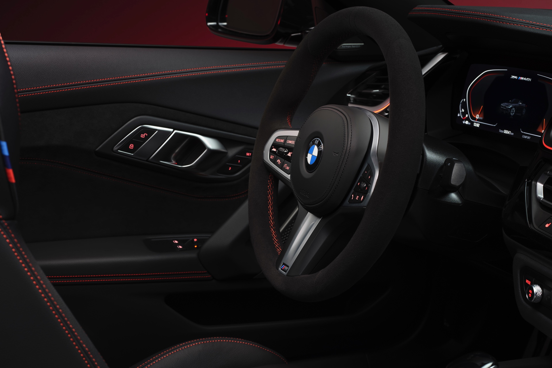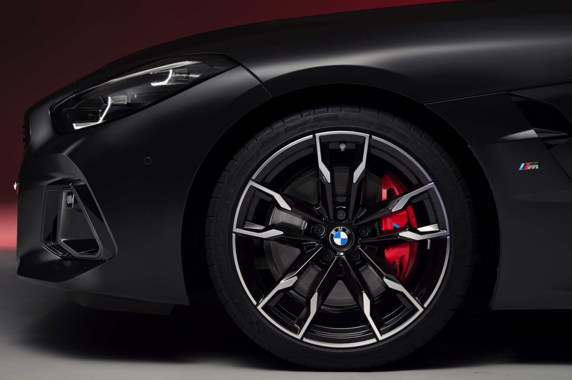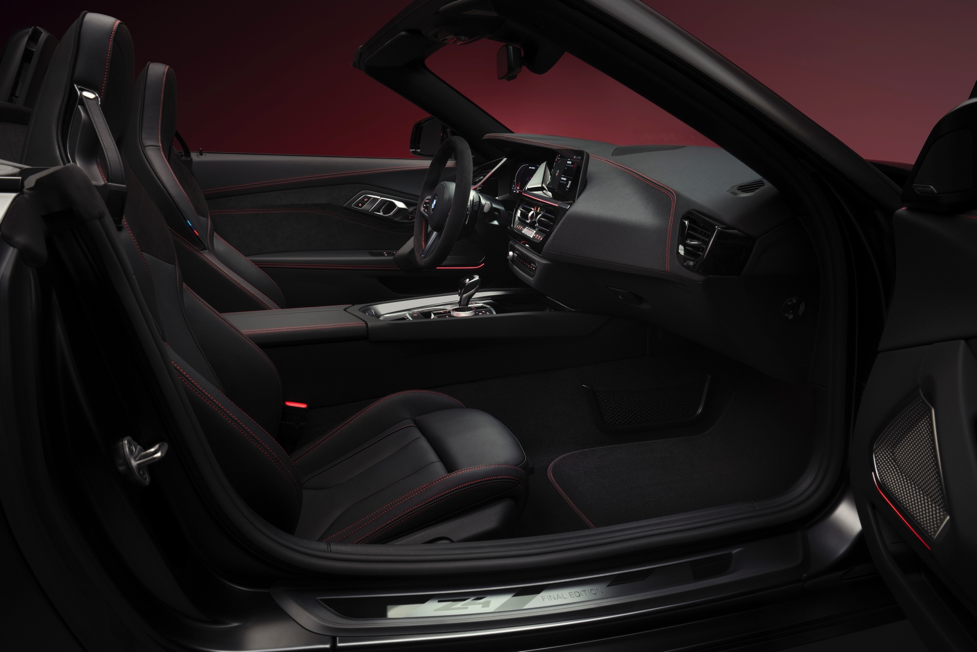 Für glänzende Kontraste zum matten Schwarz sorgen einerseits die glanzgedrehten Oberflächen der vorne 19 und hinten 20 Zoll großen Leichtmetallräder Doppelspeiche 800 M Bicolor, andererseits aber auch die Umfänge der M Hochglanz Shadow Line sowie die rot lackierten Bremssättel. Rot setzt auch im Innenraum sportliche Akzente, denn die BMW Z4 Final Edition kommt mit roten Kontrastnähten an Sportsitzen und Lenkrad sowie Instrumententafel, Mittelkonsole und Türverkleidungen. Die dunklen Flächen des Cockpits sind mit Leder und Alcantara bezogen, sodass sich die Besitzer auch an der Haptik erfreuen können. Zu einem exklusiven Einstieg tragen die gravierten Einstiegsleisten mit Final Edition-Schriftzug bei.