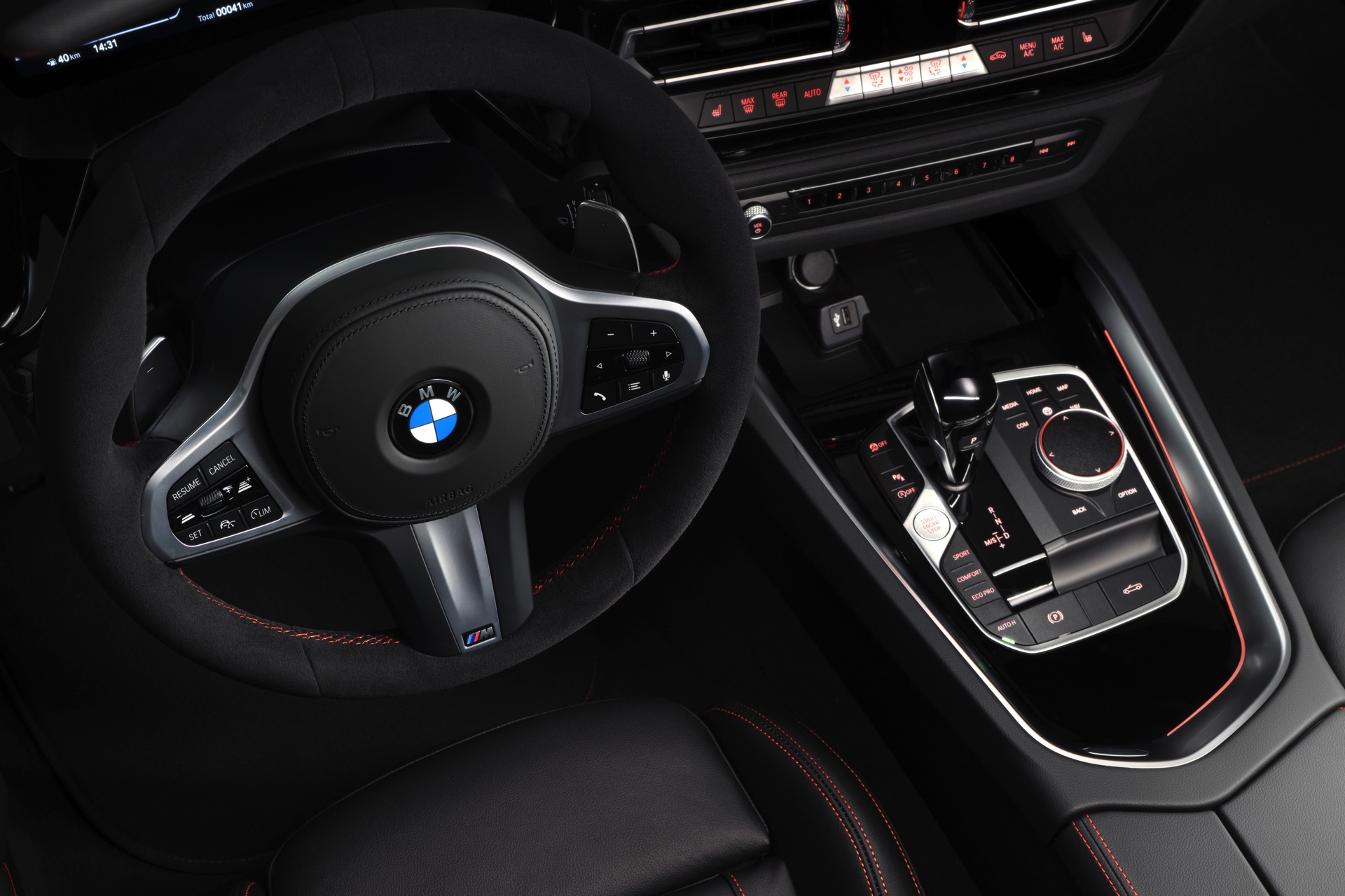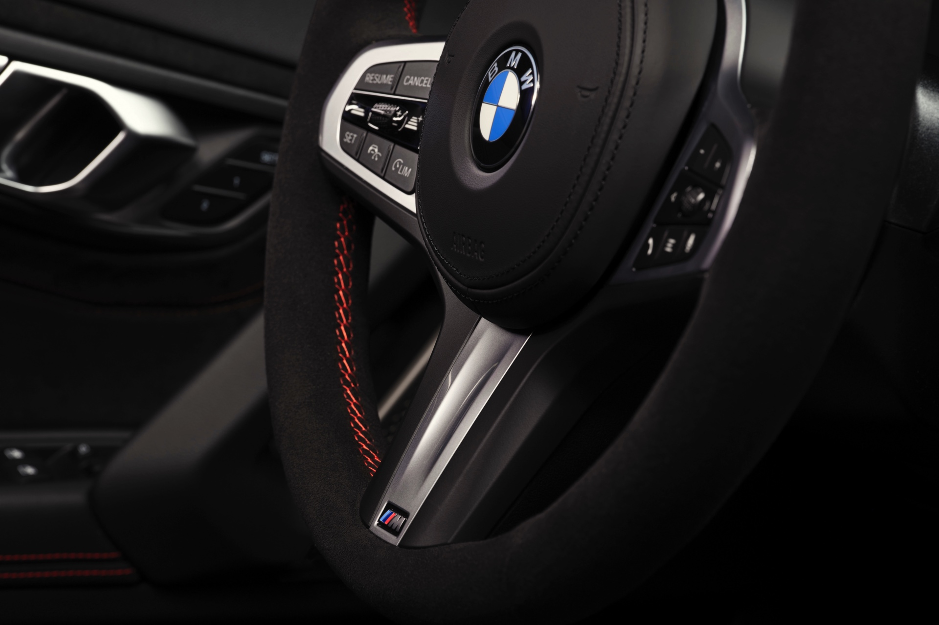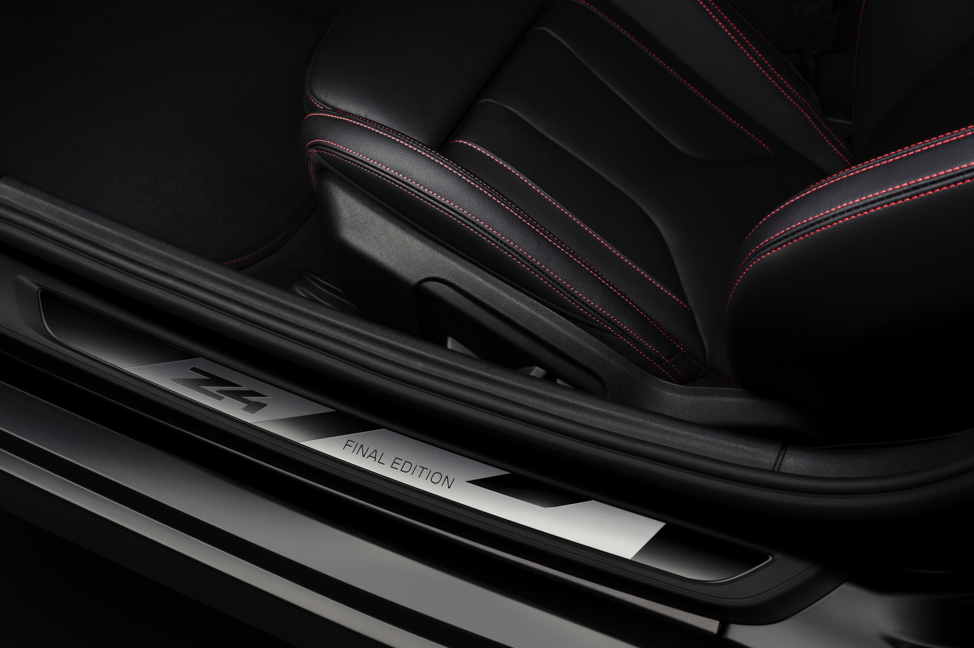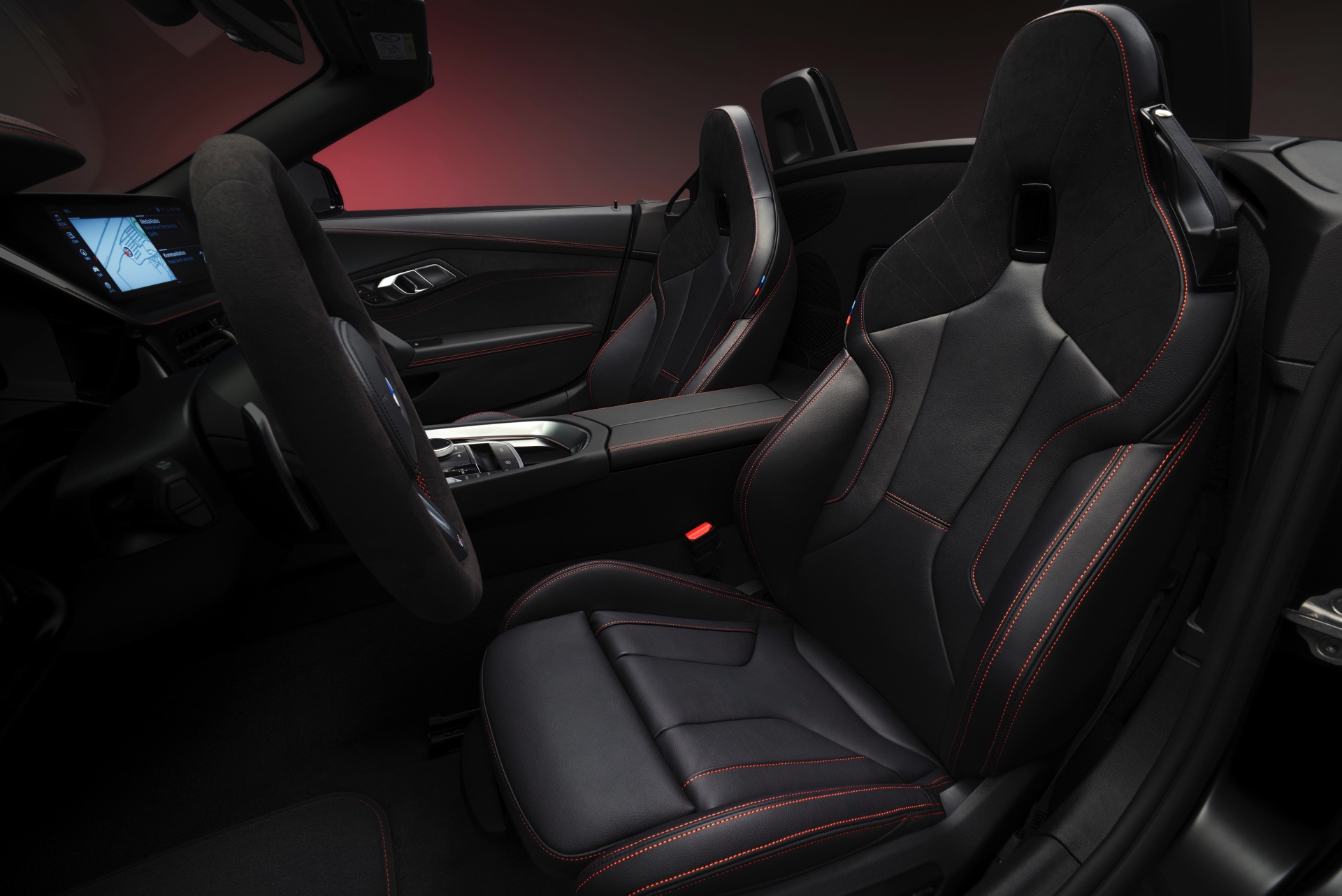 Für glänzende Kontraste zum matten Schwarz sorgen einerseits die glanzgedrehten Oberflächen der vorne 19 und hinten 20 Zoll großen Leichtmetallräder Doppelspeiche 800 M Bicolor, andererseits aber auch die Umfänge der M Hochglanz Shadow Line sowie die rot lackierten Bremssättel. Rot setzt auch im Innenraum sportliche Akzente, denn die BMW Z4 Final Edition kommt mit roten Kontrastnähten an Sportsitzen und Lenkrad sowie Instrumententafel, Mittelkonsole und Türverkleidungen. Die dunklen Flächen des Cockpits sind mit Leder und Alcantara bezogen, sodass sich die Besitzer auch an der Haptik erfreuen können. Zu einem exklusiven Einstieg tragen die gravierten Einstiegsleisten mit Final Edition-Schriftzug bei.