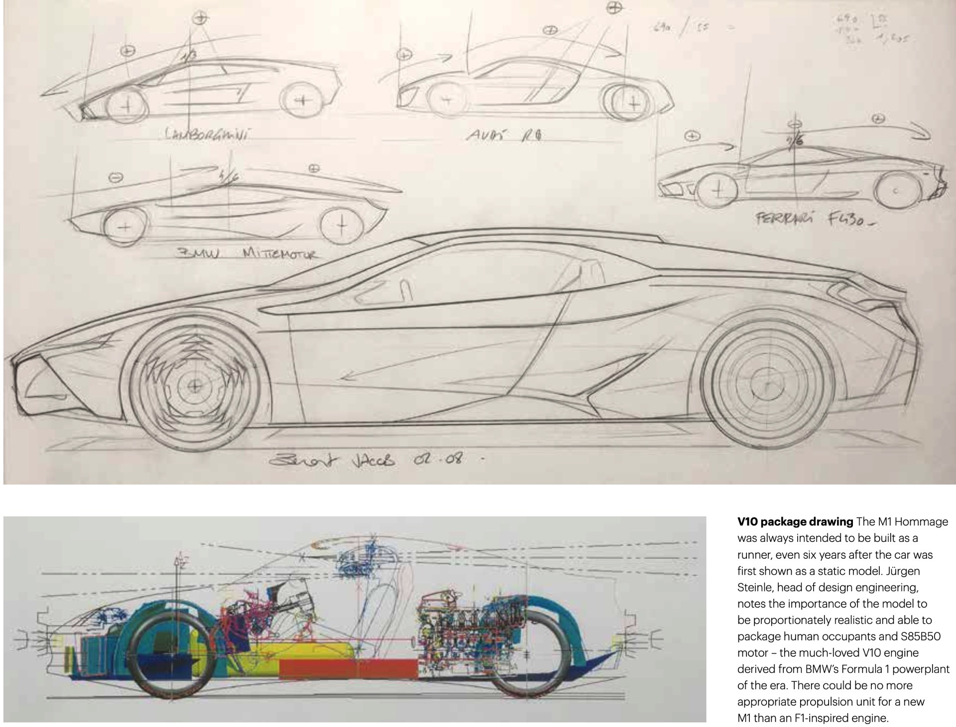Der Auftritt des BMW M1 Hommage am Comer See wurde ein sensationeller Erfolg. Prompt fragten Presse und Besucher, wann BMW einen neuen M1 bauen würde. Hinter den Kulissen begannen Package-Studien, um den V10 aus der damaligen Generation von BMW M5 und M6 einzubauen. Doch das S85-Triebwerk passte schlicht nicht in die Karosserie: Um neben zwei Insassen auch den mächtigen Motor unterzubringen und zudem alle gesetzlichen Vorgaben in Sachen Sicherheit einhalten zu können, hätte das gesamte Design von Grund auf neu entstehen müssen.