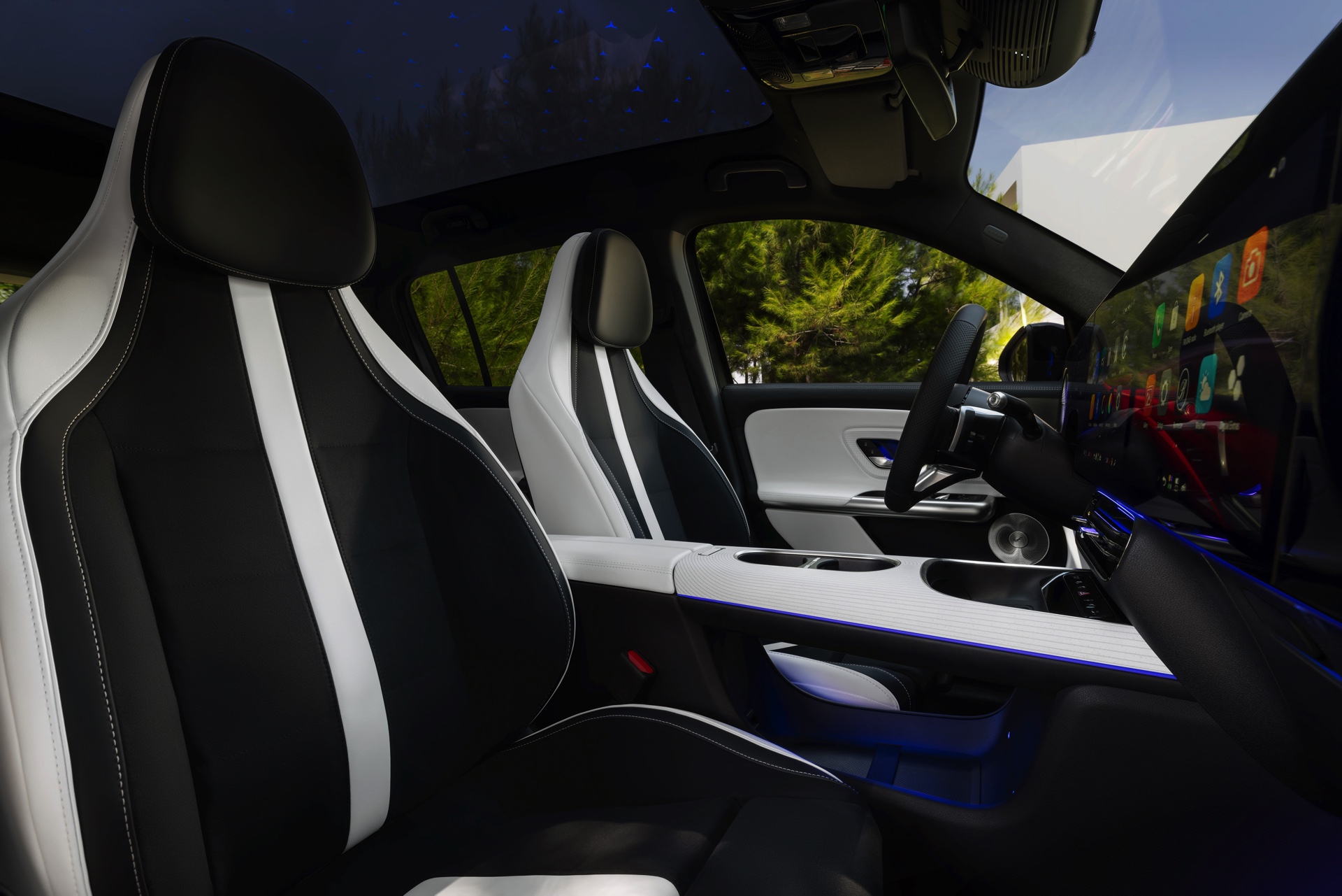 Das Cockpit des Mercedes GLB mit EQ-Technologie entspricht dem aktuellen Standard von Mercedes, wird also von einem XXL-Display auf voller Breite des Armaturenbretts dominiert. Klassische Knöpfe und Schalter gibt es nur noch für wenige Basisfunktionen, die meisten Inhalte des Infotainments werden wie bei BMW iDrive X mittels Touchscreen und Spracheingabe gesteuert.