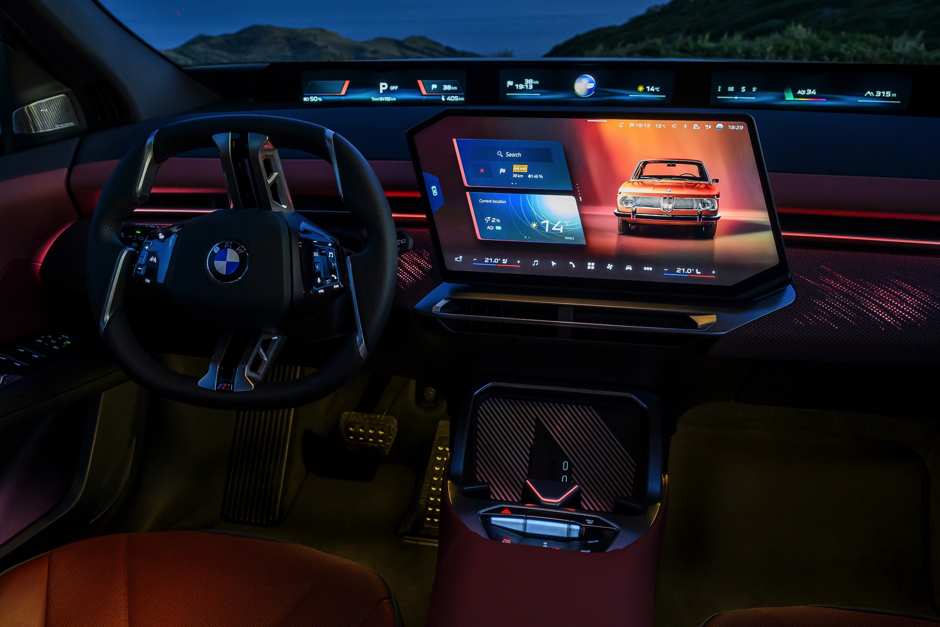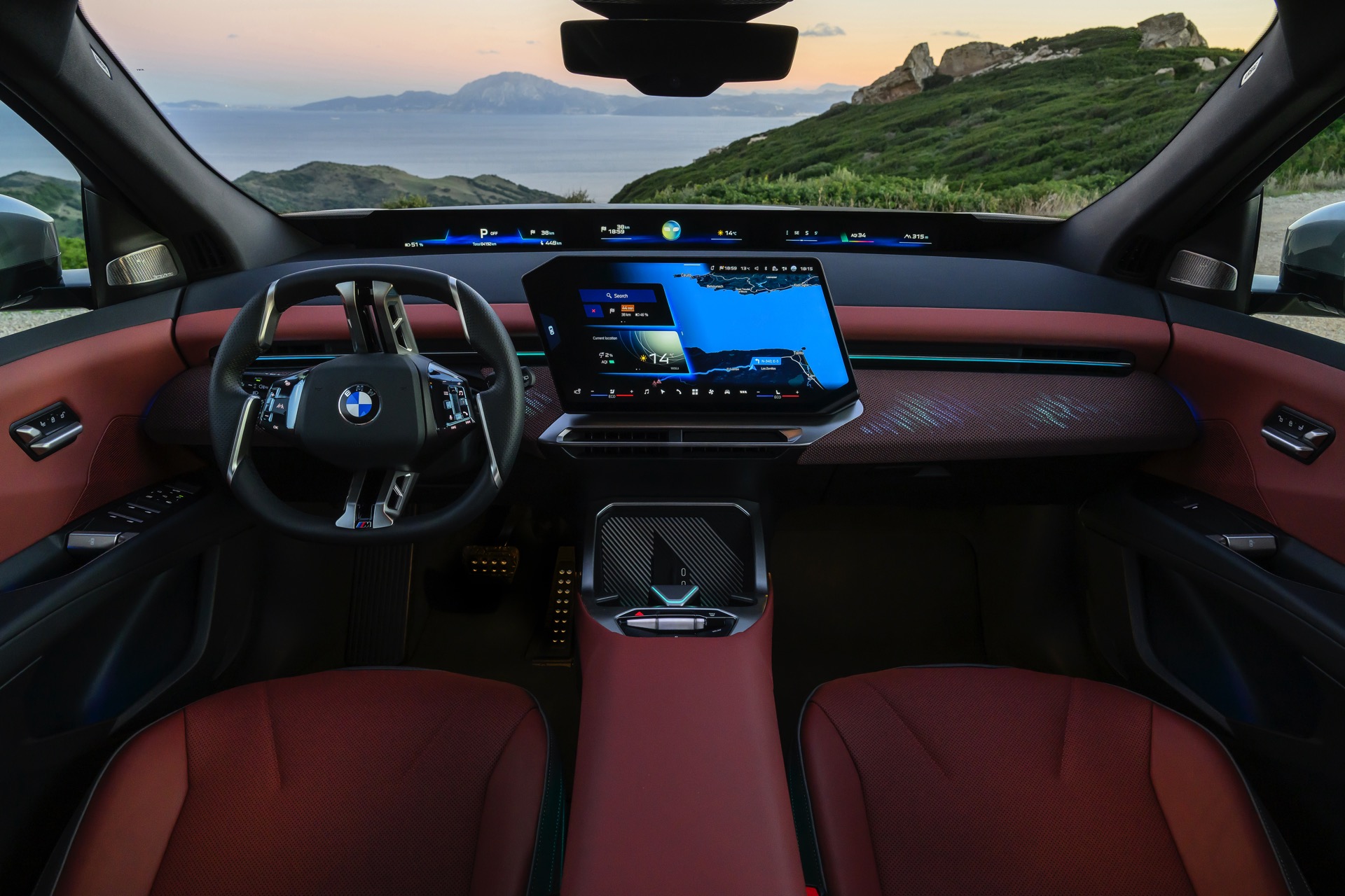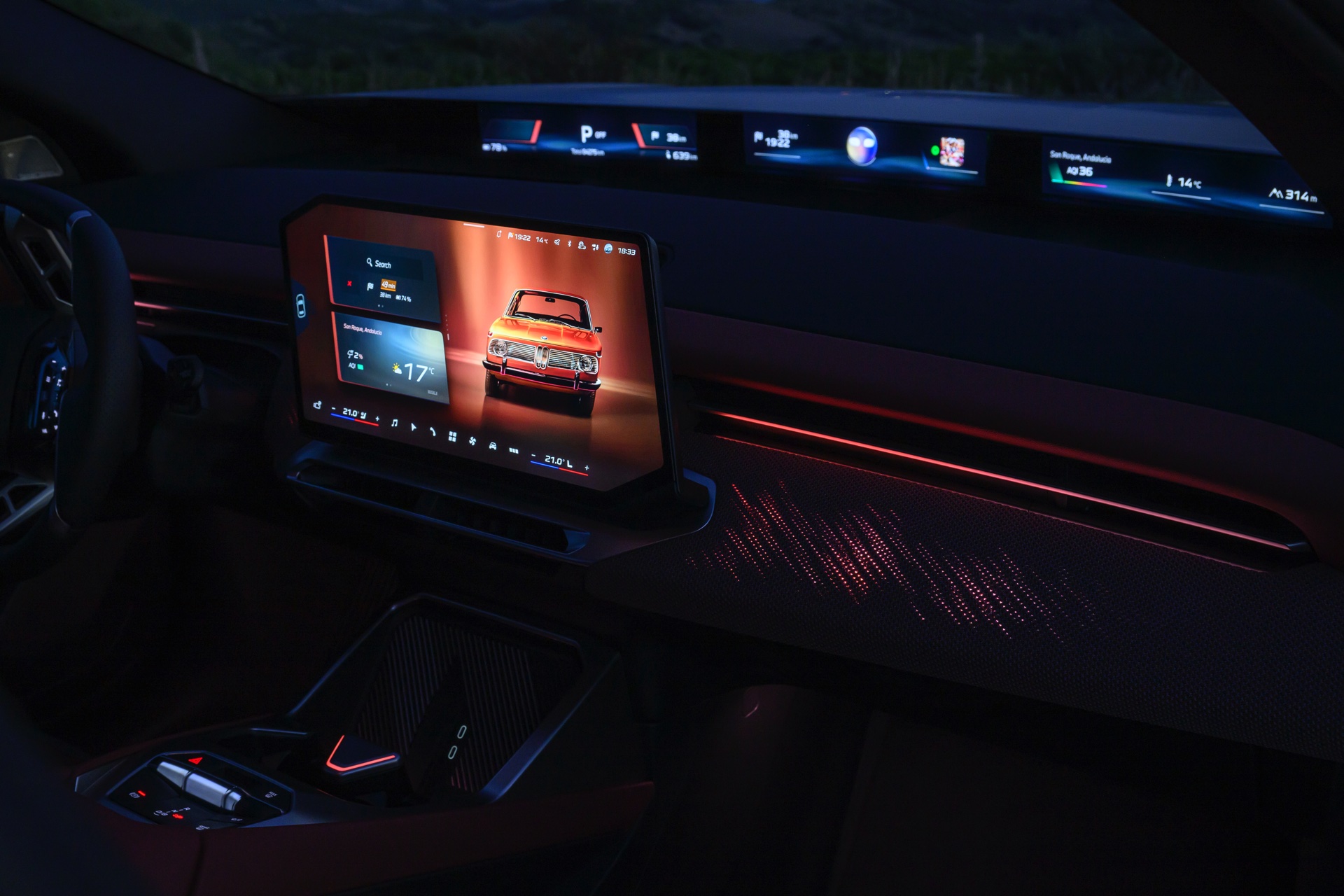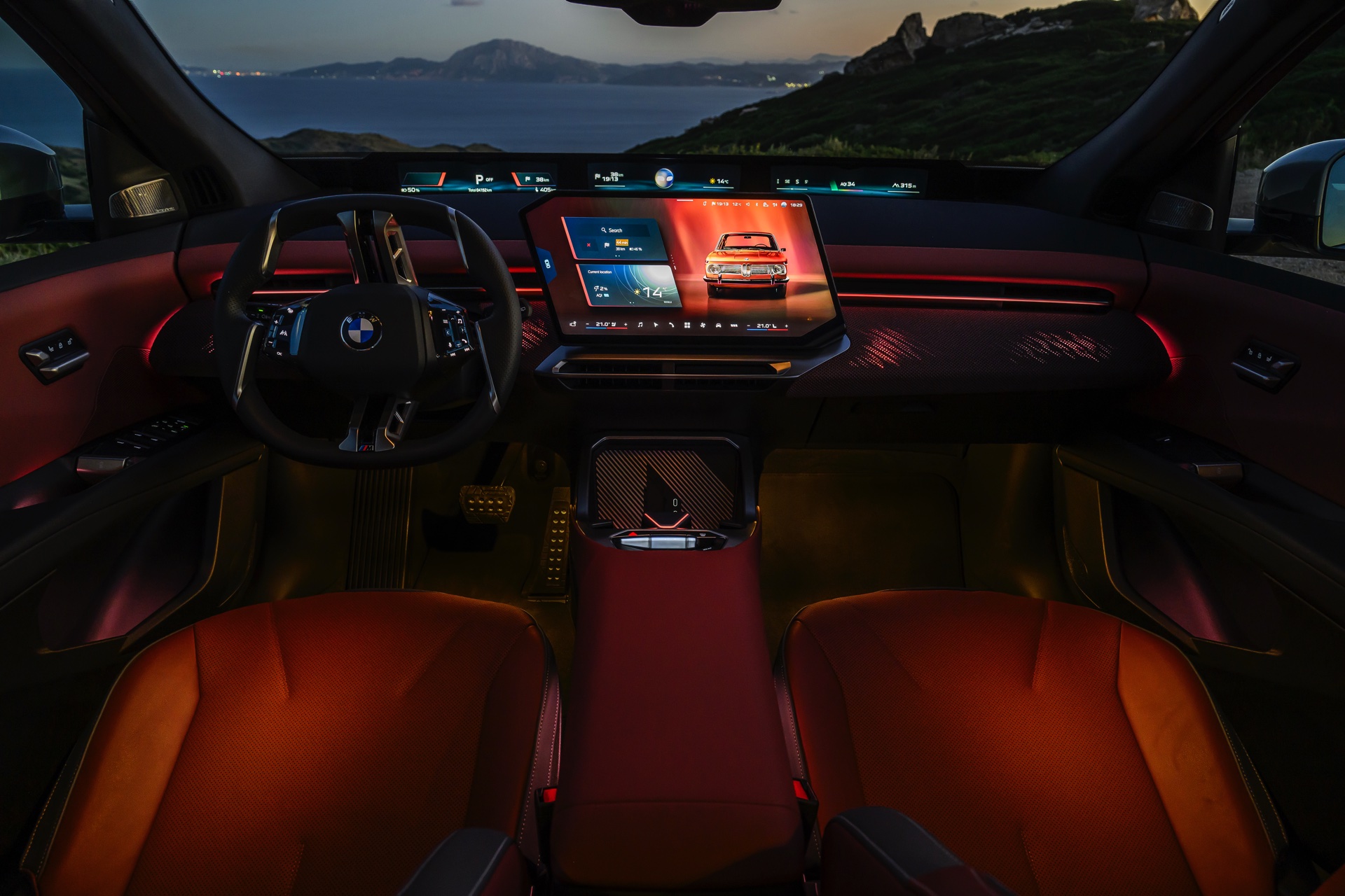 Die Fotos sind zwar offenbar an der Südspitze Spaniens nahe Gibraltar entstanden, wurden aber erst jetzt von BMW Nordamerika im Rahmen der CES veröffentlicht. Neben dem Panoramic Vision Display am Fuß der Frontscheibe und dem fast 18 Zoll großen, zum Fahrer geneigten Zentraldisplay fällt in der Nacht vor allem auch die Ambiente-Beleuchtung mit ihren durchleuchteten Textil-Bezügen ins Auge. Gerade im Bereich vor dem Beifahrer, aber auch hinter dem Lenkrad tragen die dezent beleuchteten Stoffe zu einem hochwertigen Wohlfühl-Ambiente bei.