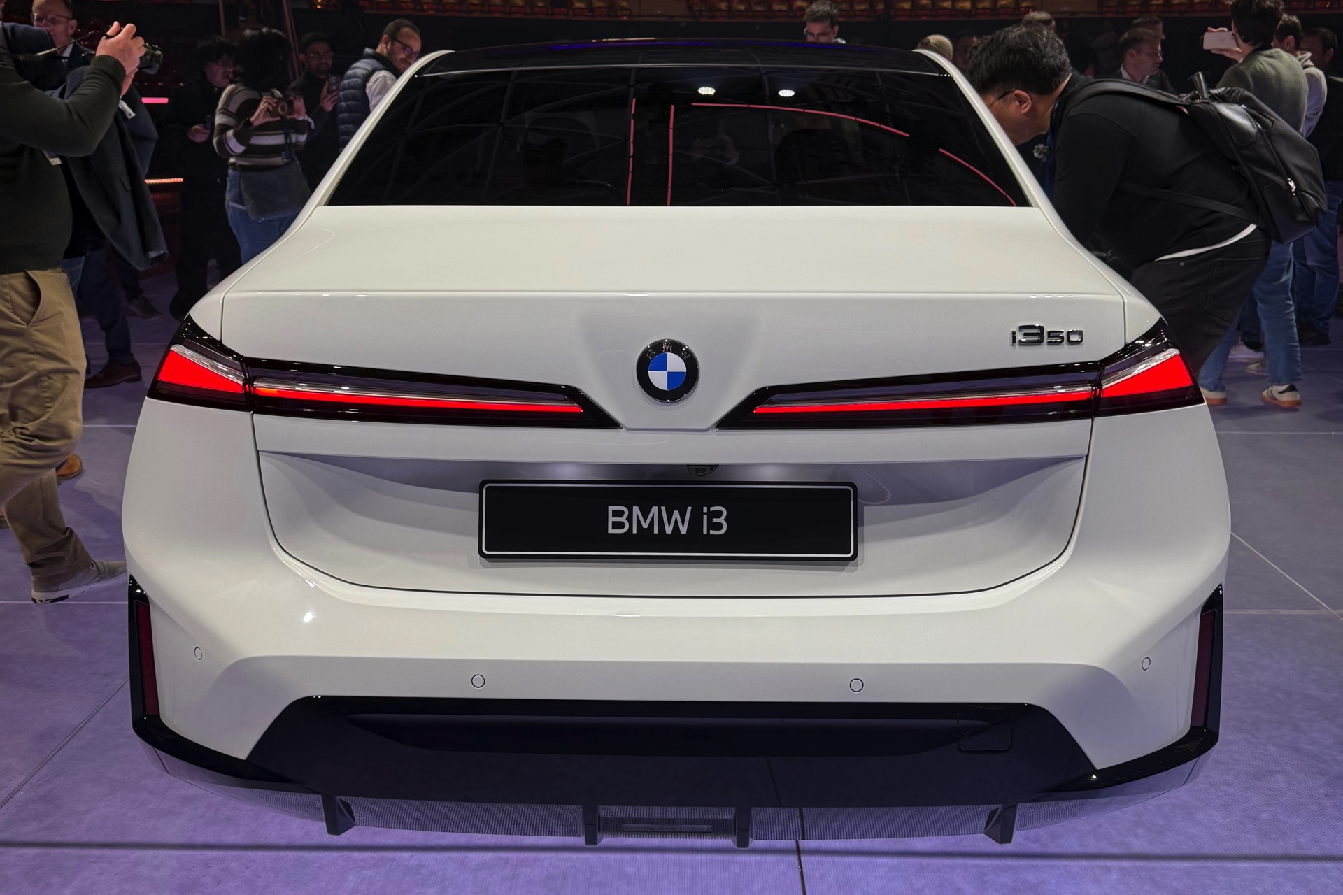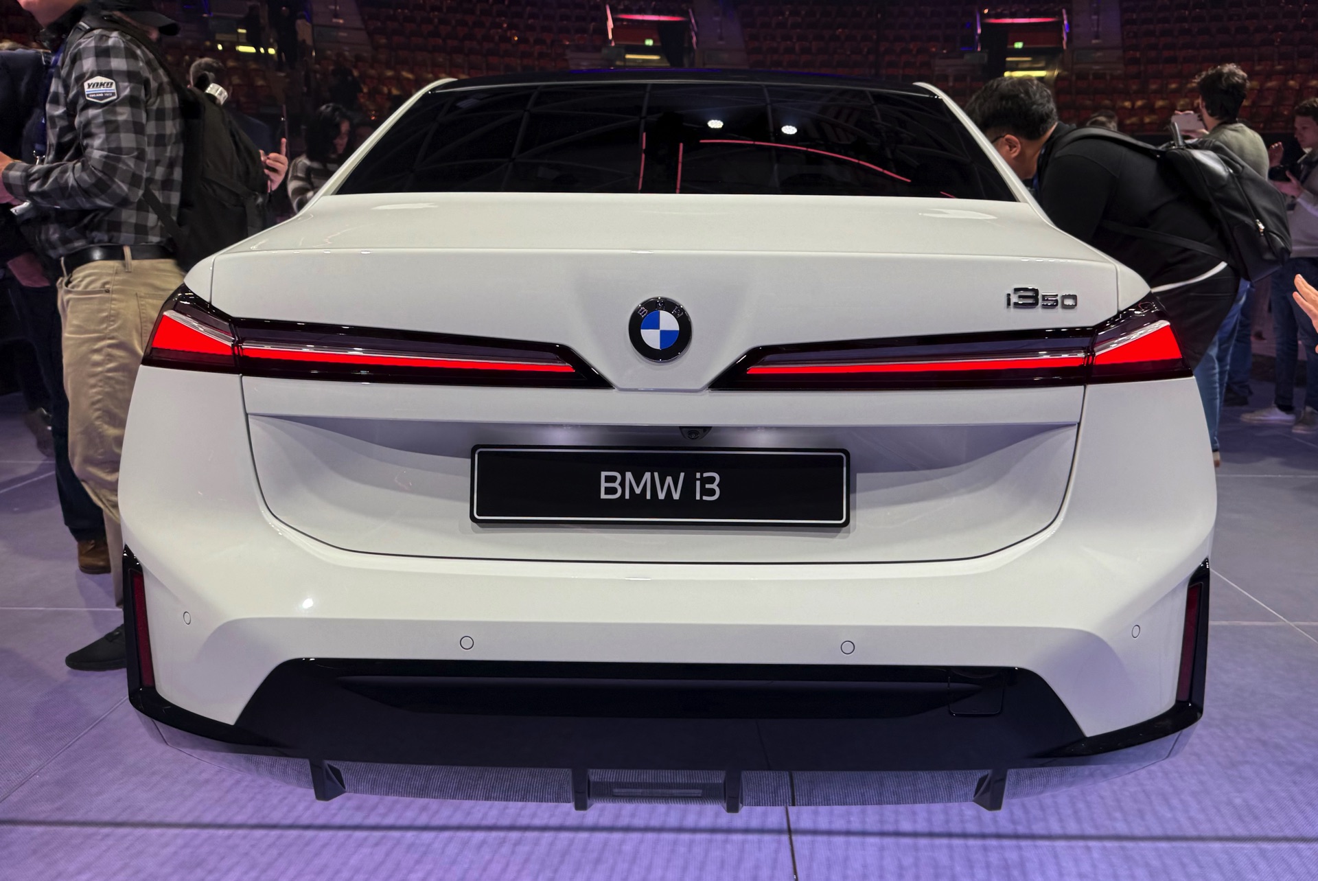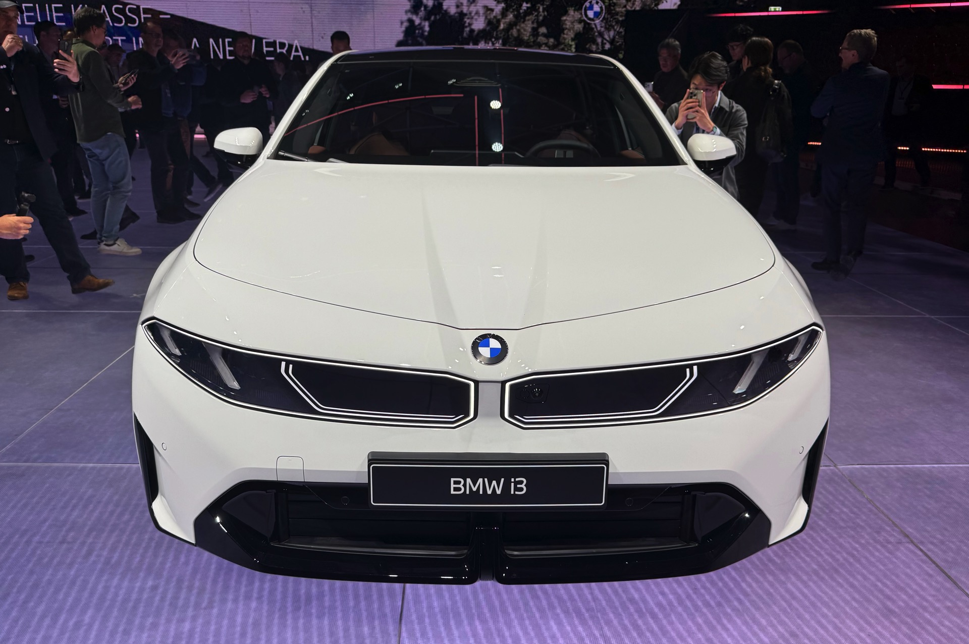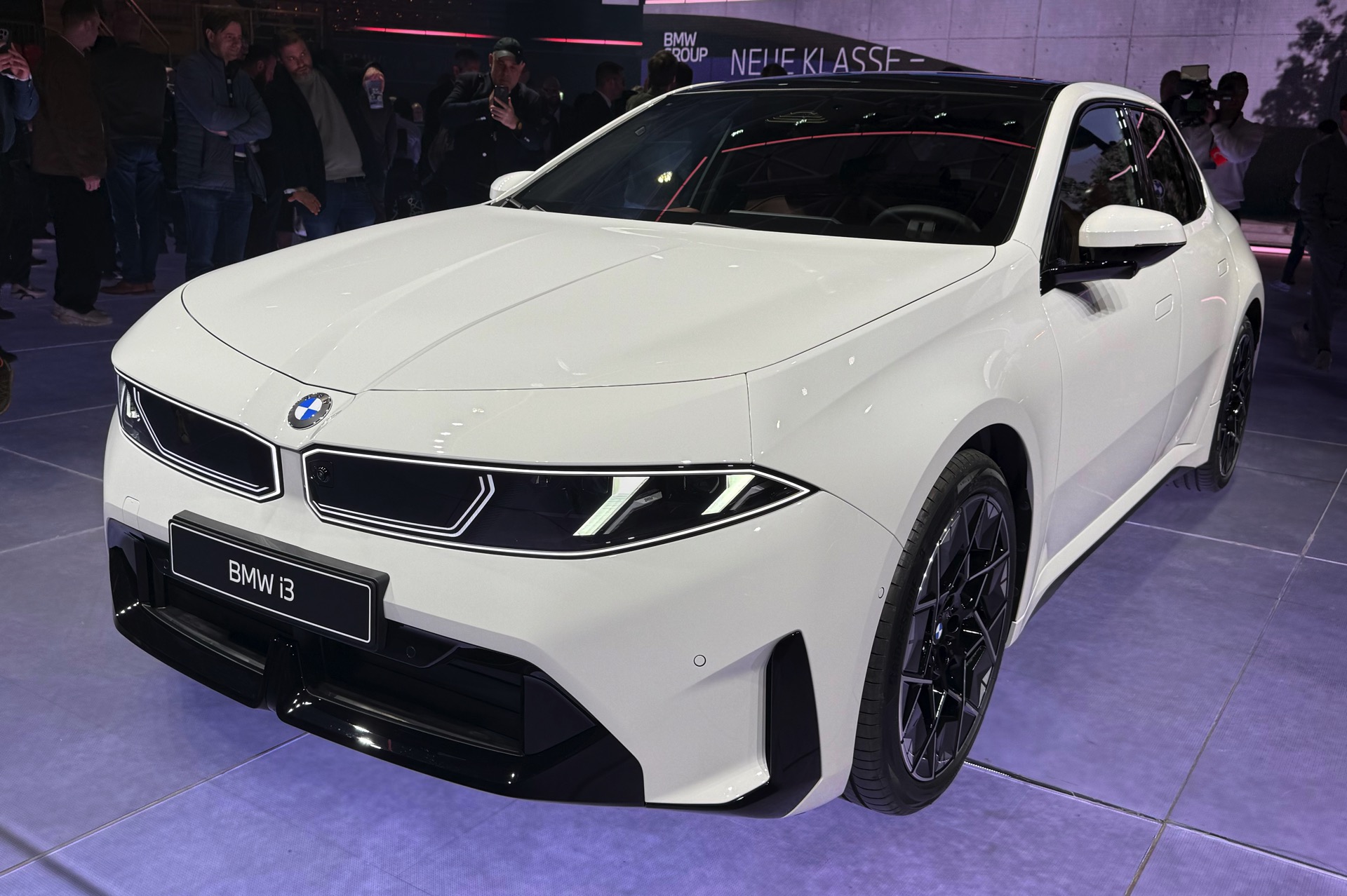 Bei der Weltpremiere des neuen BMW i3 (NA0) war die Neue Klasse im 3er-Format nicht nur in der Launchfarbe Le Castellet Blau zu sehen, sondern wurde auch erstmals in Weiß gezeigt. Unsere Live-Fotos aus dem BMW Park München zeigen den Elektro-3er mit M Sport-Paket und Lackierung in Alpinweiß, außerdem trägt er die 21 Zoll großen Aerodynamikräder im Styling 1067 M. Wie der i350-Schriftzug am Heck verrät, handelt es sich um die vom iX3 bekannte Antriebsvariante mit einer Systemleistung von 469 PS und 645 Newtonmeter Drehmoment, die den i3 50 xDrive in unter fünf Sekunden von 0 auf 100 km/h beschleunigen kann.