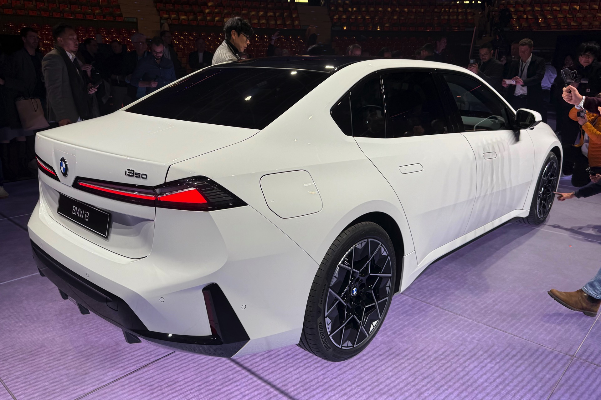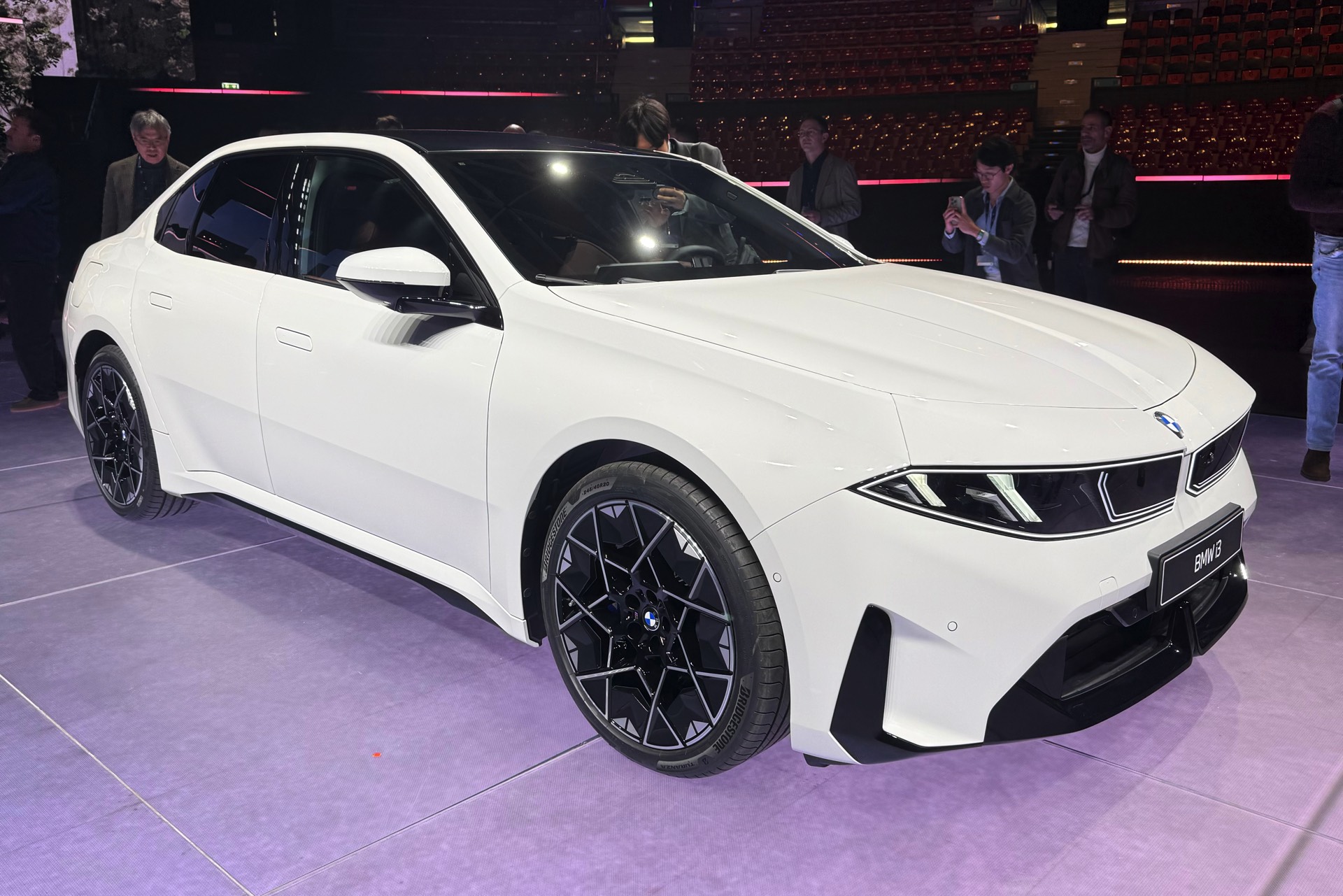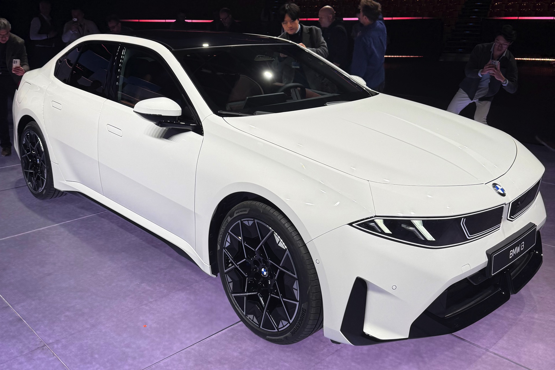 Bei der Weltpremiere des neuen BMW i3 (NA0) war die Neue Klasse im 3er-Format nicht nur in der Launchfarbe Le Castellet Blau zu sehen, sondern wurde auch erstmals in Weiß gezeigt. Unsere Live-Fotos aus dem BMW Park München zeigen den Elektro-3er mit M Sport-Paket und Lackierung in Alpinweiß, außerdem trägt er die 21 Zoll großen Aerodynamikräder im Styling 1067 M. Wie der i350-Schriftzug am Heck verrät, handelt es sich um die vom iX3 bekannte Antriebsvariante mit einer Systemleistung von 469 PS und 645 Newtonmeter Drehmoment, die den i3 50 xDrive in unter fünf Sekunden von 0 auf 100 km/h beschleunigen kann.