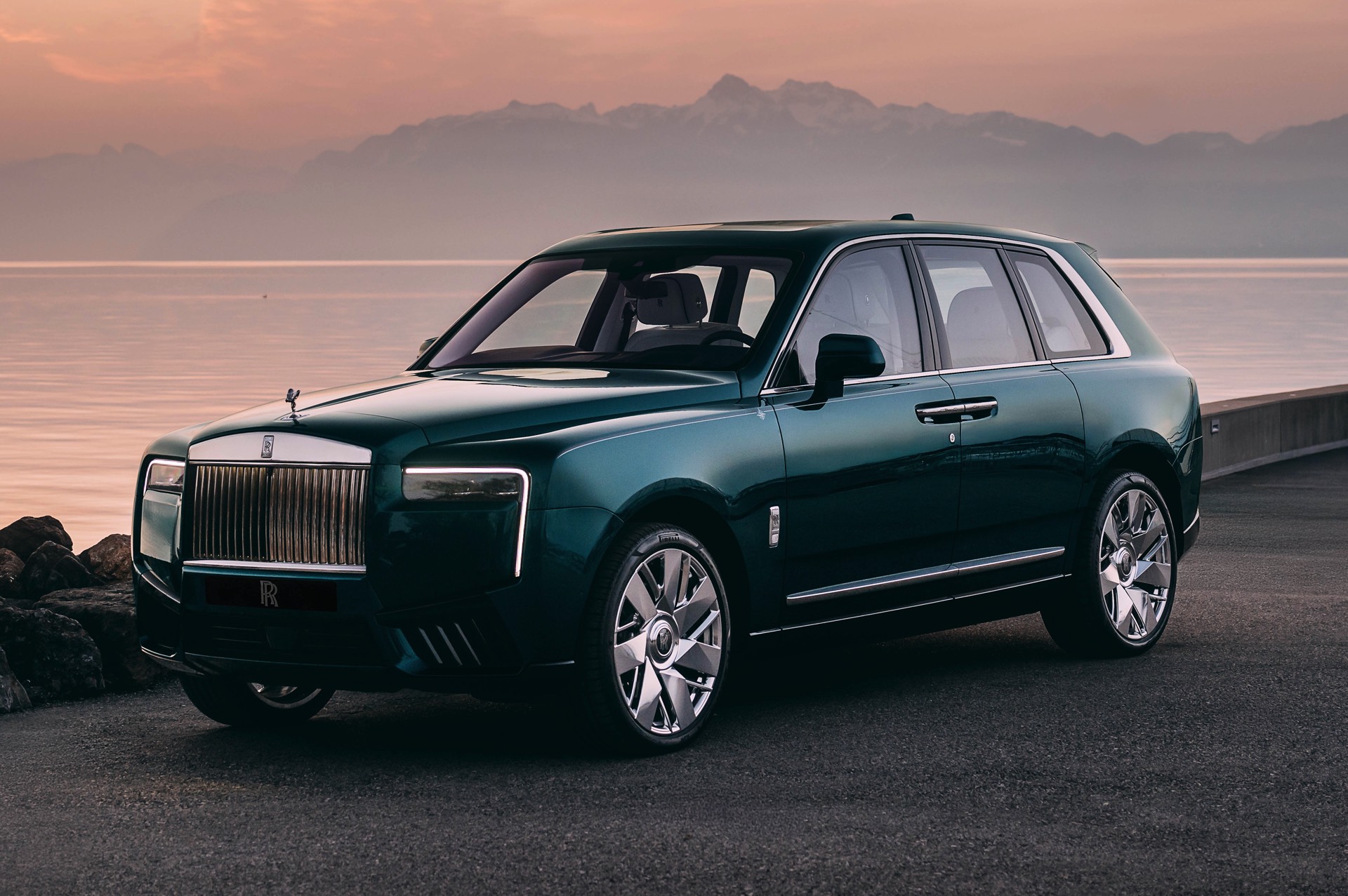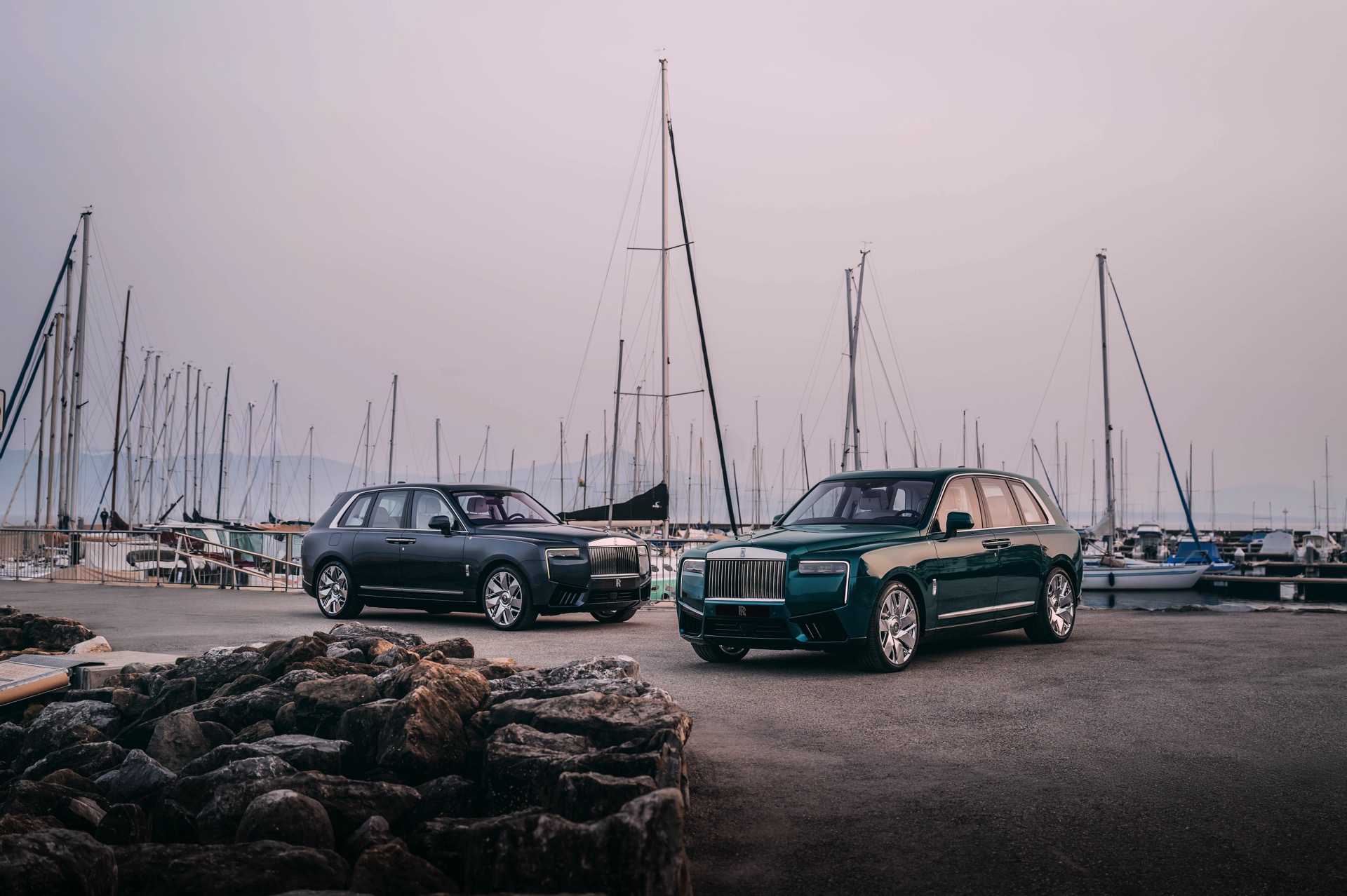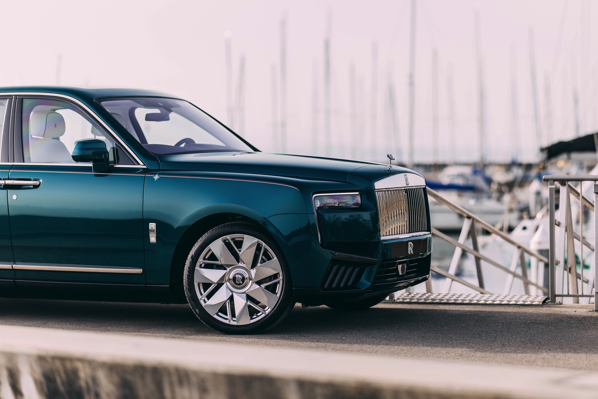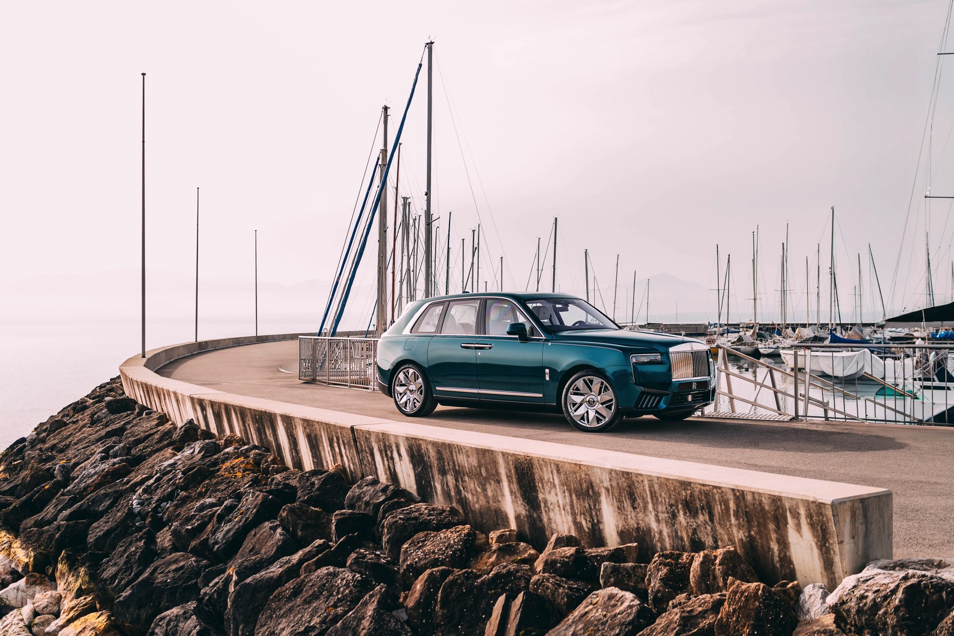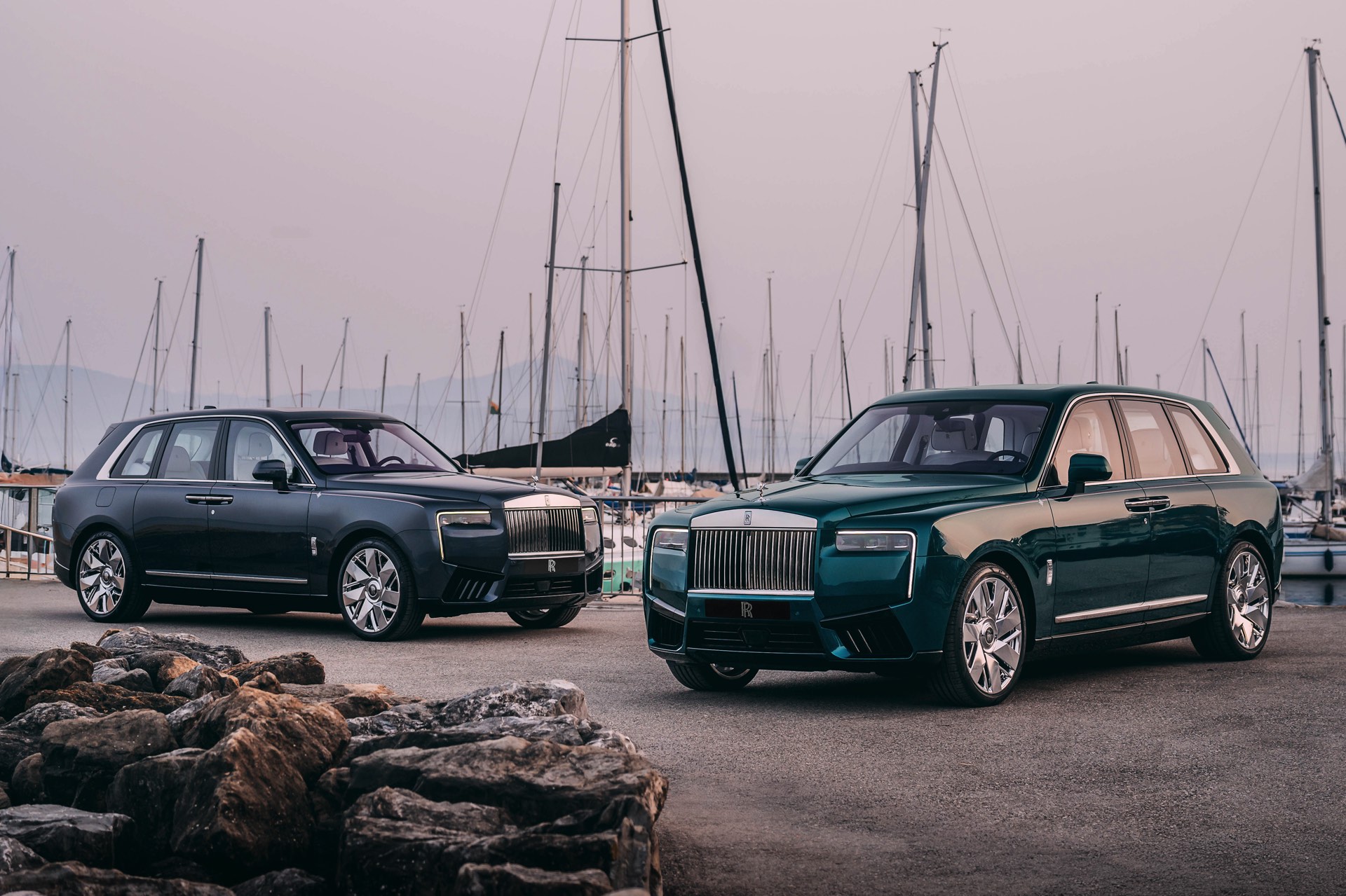 Der Rolls-Royce Cullinan North glänzt mit einer zweifarbigen Lackierung in Crystal und Light Blue und soll damit an die kälteren Gewässer des Nordens erinnern. Die wärmeren Temperaturen des Südens zeigt die Variante South mit Crystal und Arabian Blue IV, während East mit Dark Silk Teal an die mystischen Farben der Tiefsee erinnern soll. Abgerundet wird das Quartett mit dem Modell West, dessen Lackierung in Sapphire Gunmetal vom Ozeanhimmel an einem stürmischen Tag inspiriert ist. Alle vier Modelle kommen mit einer von Hand gezeichneten Twin-Coachline in Phoenix Red und Arctic White sowie einem Kompass-Motiv auf dem vorderen Kotflügel, bei dem die jeweils namensgebende Himmelsrichtung rot hervorgehoben ist. 22 Zoll große Leichtmetallräder sollen mit ihrem hochglanzpoliertem Finish an die metallisch glänzende Reling einer Yacht erinnern.
