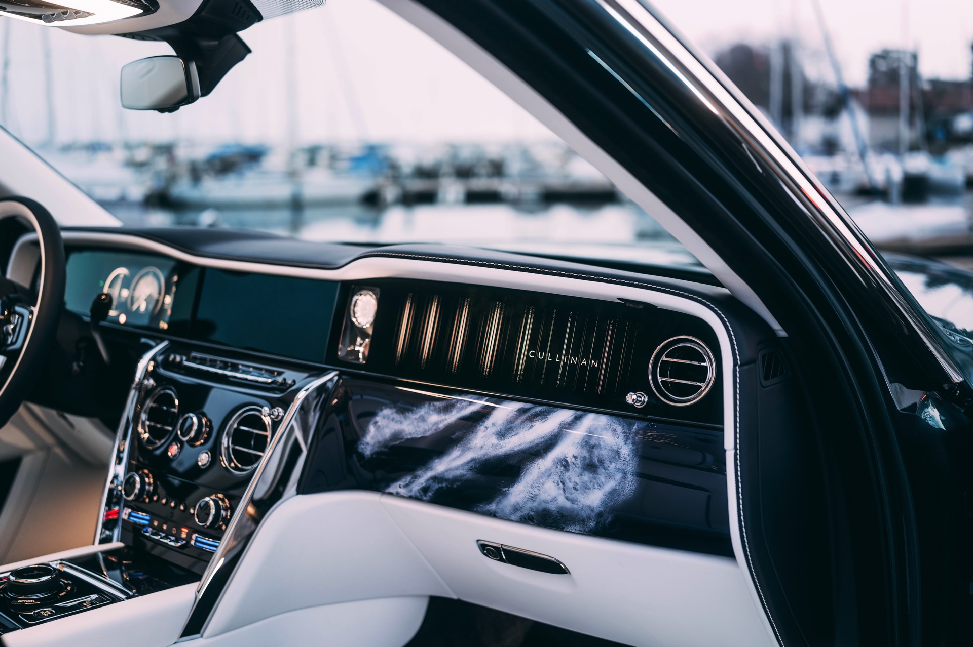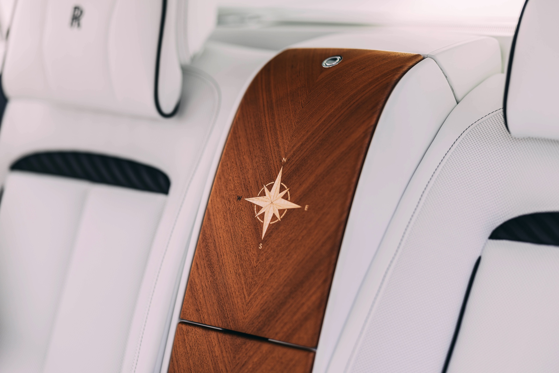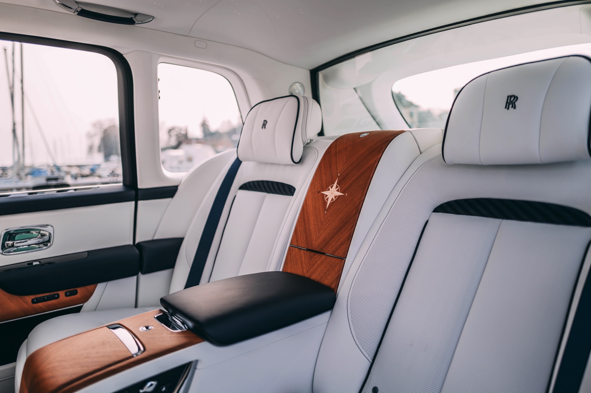 Fortgesetzt wird das Thema im Innenraum des Rolls-Royce Cullinan Yachting, dessen vier Varianten über eine Bicolor-Lederausstattung in Arctic White und Navy Blue mit jeweils passenden Kontrastnähten und gestickten Monogrammen in den Kopfstützen verfügen. Die Interieurleisten und viele andere Elemente sind in offenporigem Teak-Holz ausgeführt, wobei ein aus 40 Einzelteilen bestehendes, in aufwändiger Handarbeit eingearbeitetes Kompass-Motiv in der Wasserfall-Fläche zwischen den Fond-Sitzen als besonderes Highlight fungiert.