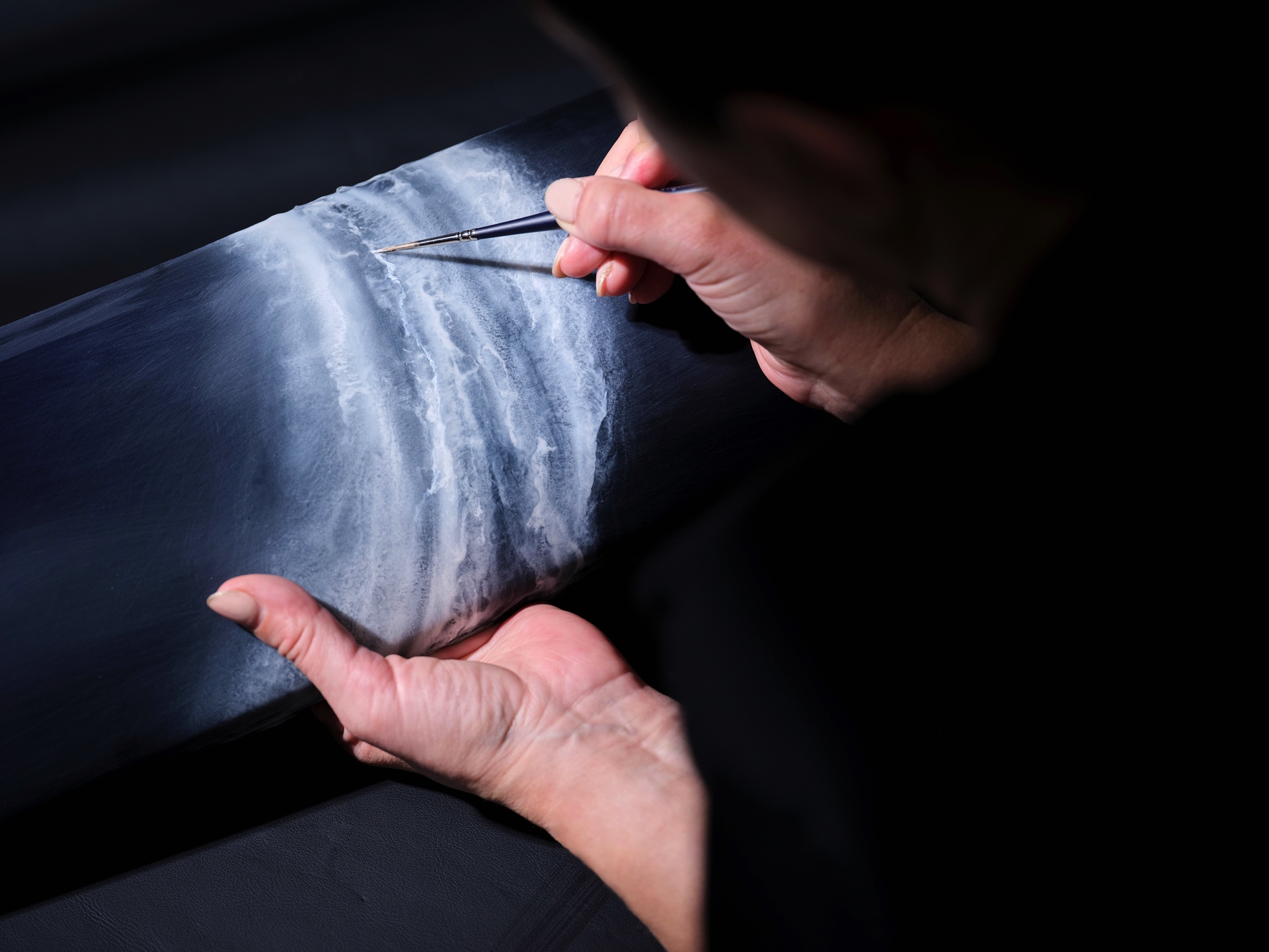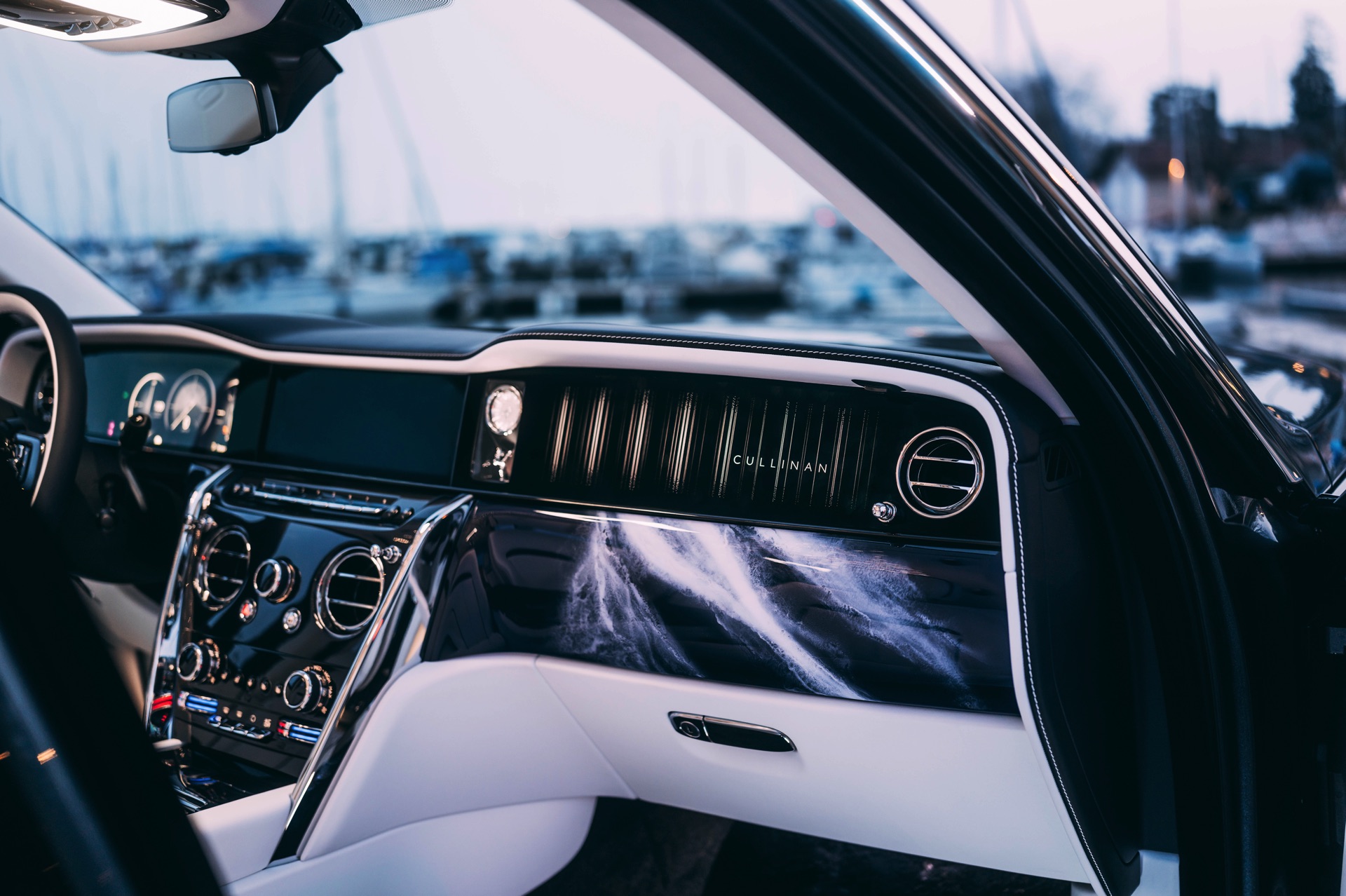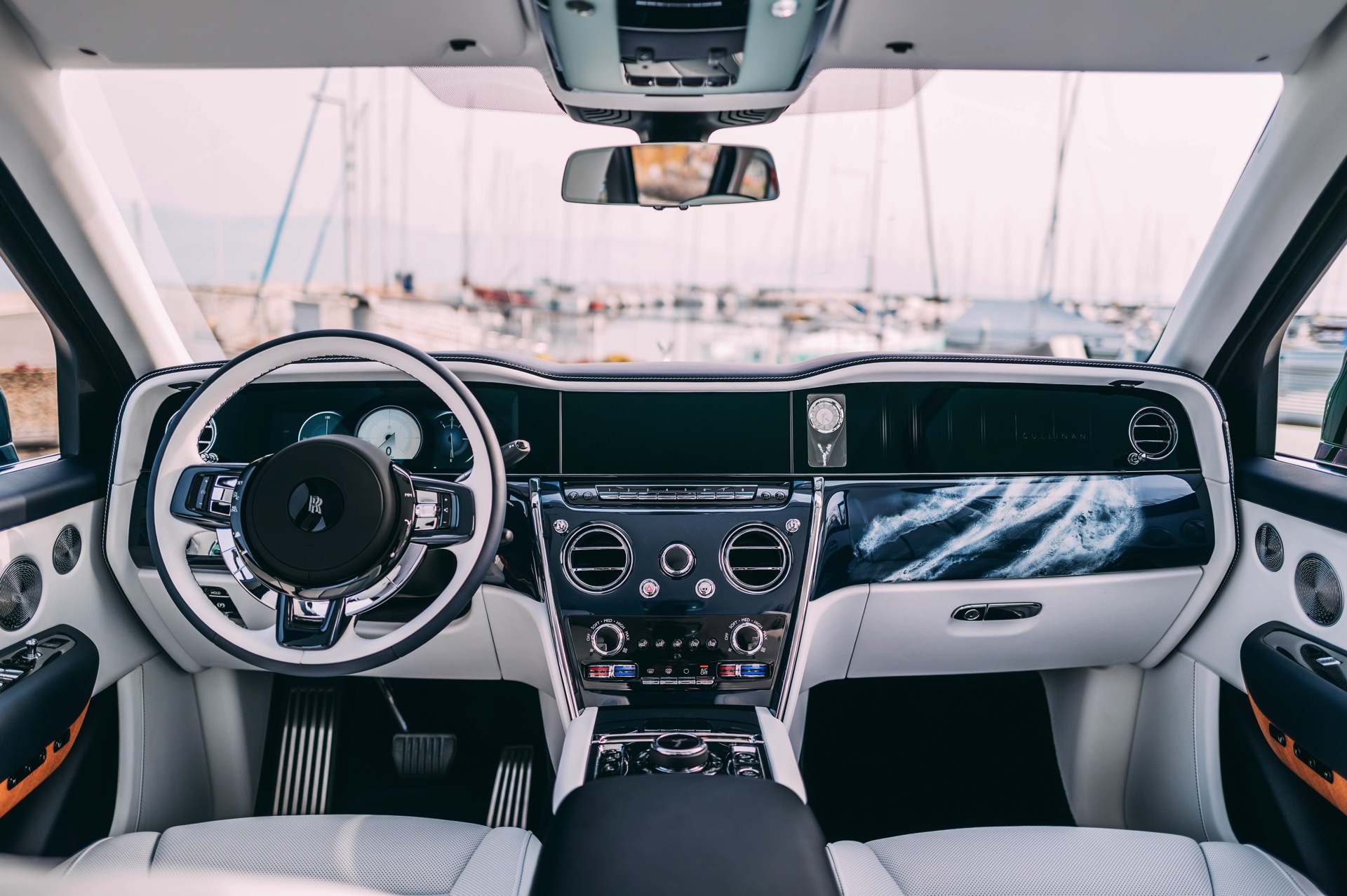 Fortgesetzt wird das Thema im Innenraum des Rolls-Royce Cullinan Yachting, dessen vier Varianten über eine Bicolor-Lederausstattung in Arctic White und Navy Blue mit jeweils passenden Kontrastnähten und gestickten Monogrammen in den Kopfstützen verfügen. Die Interieurleisten und viele andere Elemente sind in offenporigem Teak-Holz ausgeführt, wobei ein aus 40 Einzelteilen bestehendes, in aufwändiger Handarbeit eingearbeitetes Kompass-Motiv in der Wasserfall-Fläche zwischen den Fond-Sitzen als besonderes Highlight fungiert.