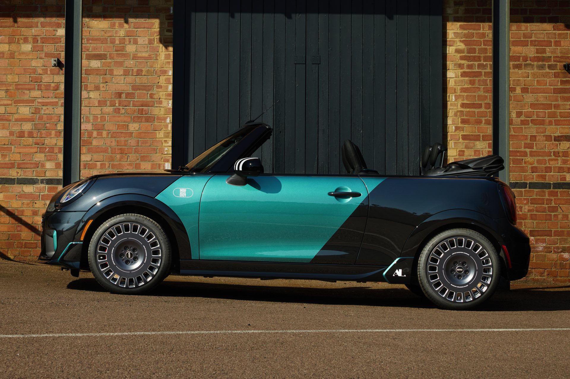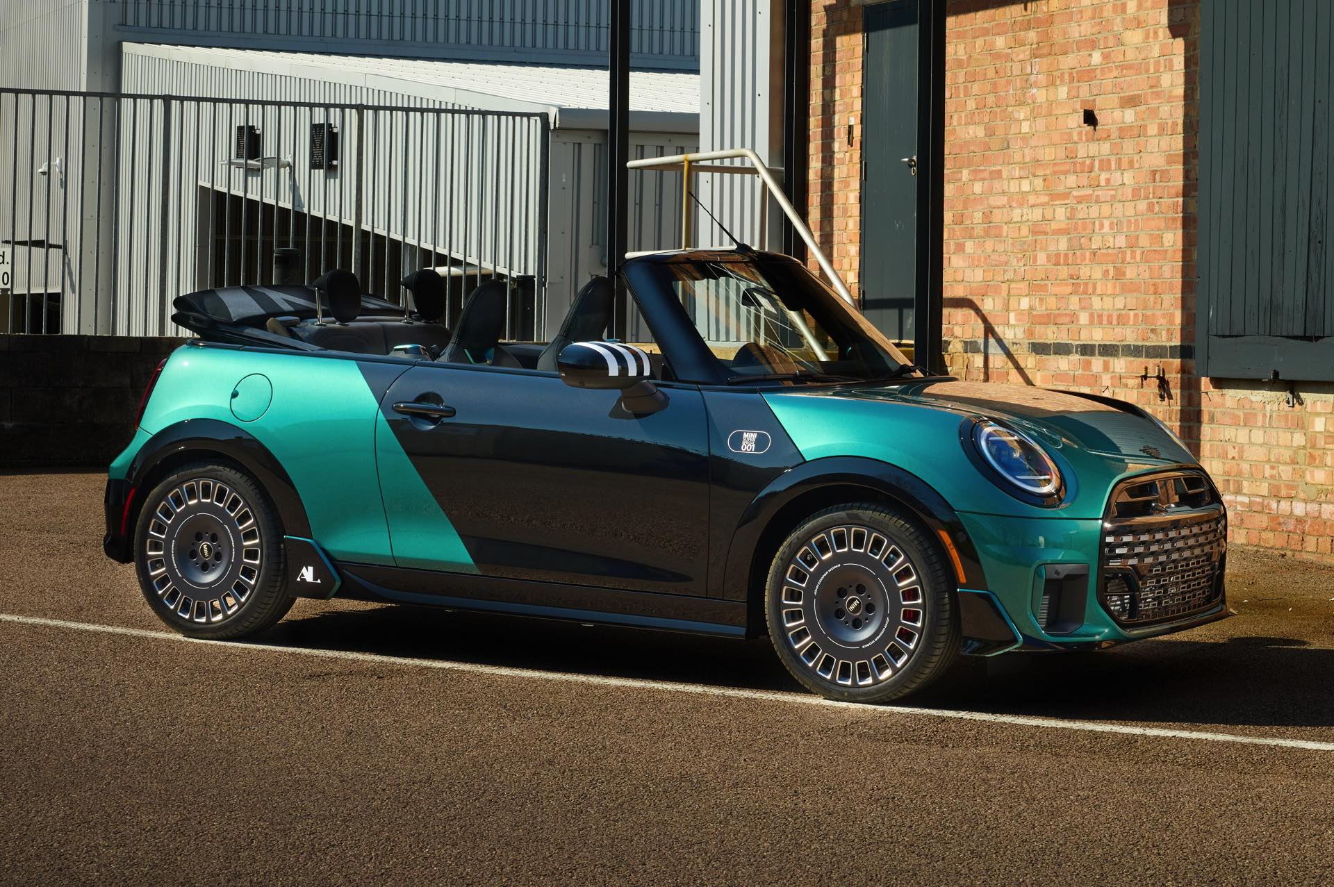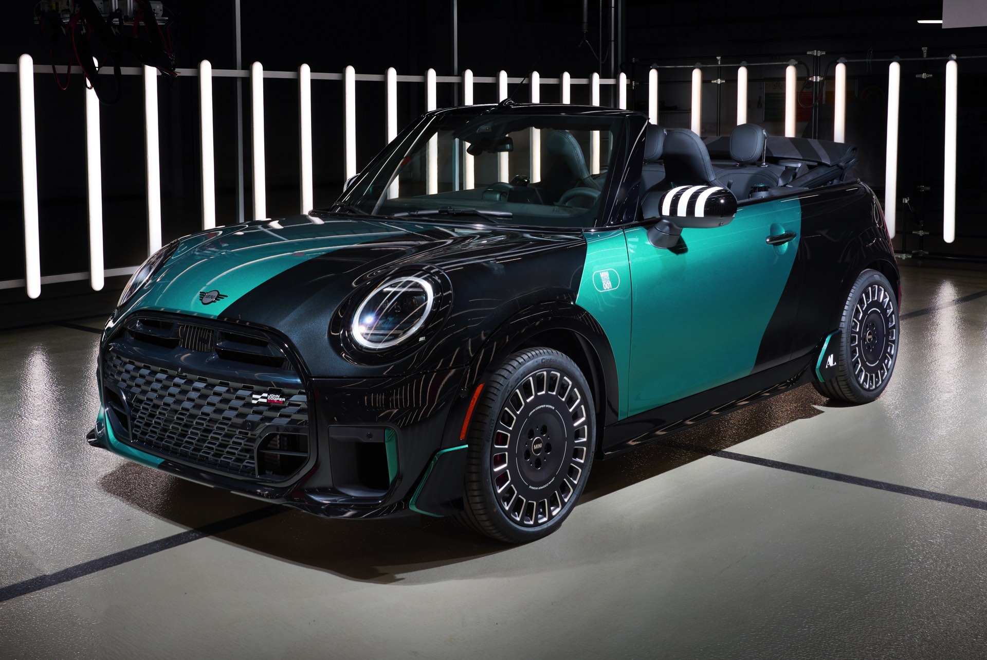 Ein besonderer MINI-Kunde in den USA darf sich schon bald über ein einzigartiges Fahrzeug in der Garage freuen: Das MINI.01 Cabrio auf Basis des aktuellen John Cooper Works-F67 zeigt, was auch im Werk Oxford in Sachen Individualisierung möglich ist. Unumstrittenes Highlight des besonderen Kleinwagens ist eine neue Interpretation der Two-Tone-Lackierung, die wir ab Werk vor allem von Luxus-Automobilen wie Rolls-Royce und BMW 7er kennen. Anders als in diesen Fällen verläuft die Grenze zwischen den beiden Farben beim MINI.01 vertikal, sodass ein Bicolor-Auftritt mit je nach Perspektive ganz anderer Wirkung entsteht: Auf der Fahrerseite glänzt die Front des Cabrios in Midnight Black, die Beifahrerseite ist in einem individuellen Metallic-Grün lackiert. Während am Heck die gleiche Farbenlehre gilt, findet in der Seitenansicht noch ein sehenswerter Wechsel der beiden Lackierungen statt und sorgt endgültig für einen unverwechselbaren Look.