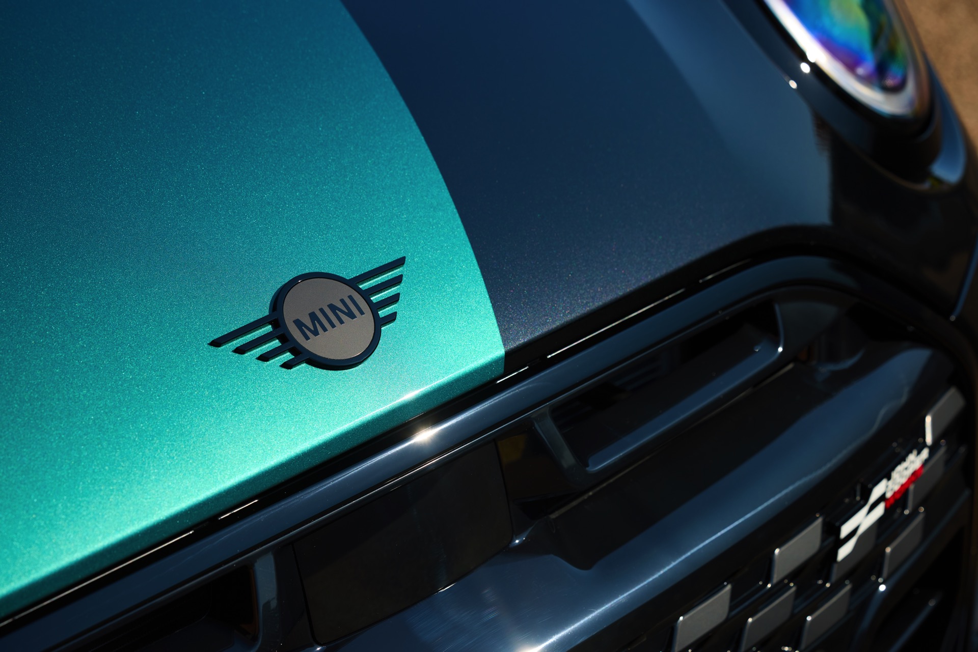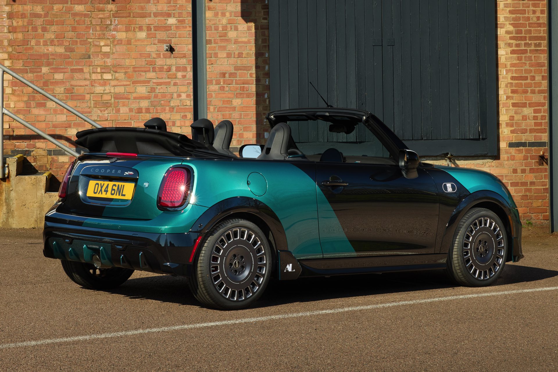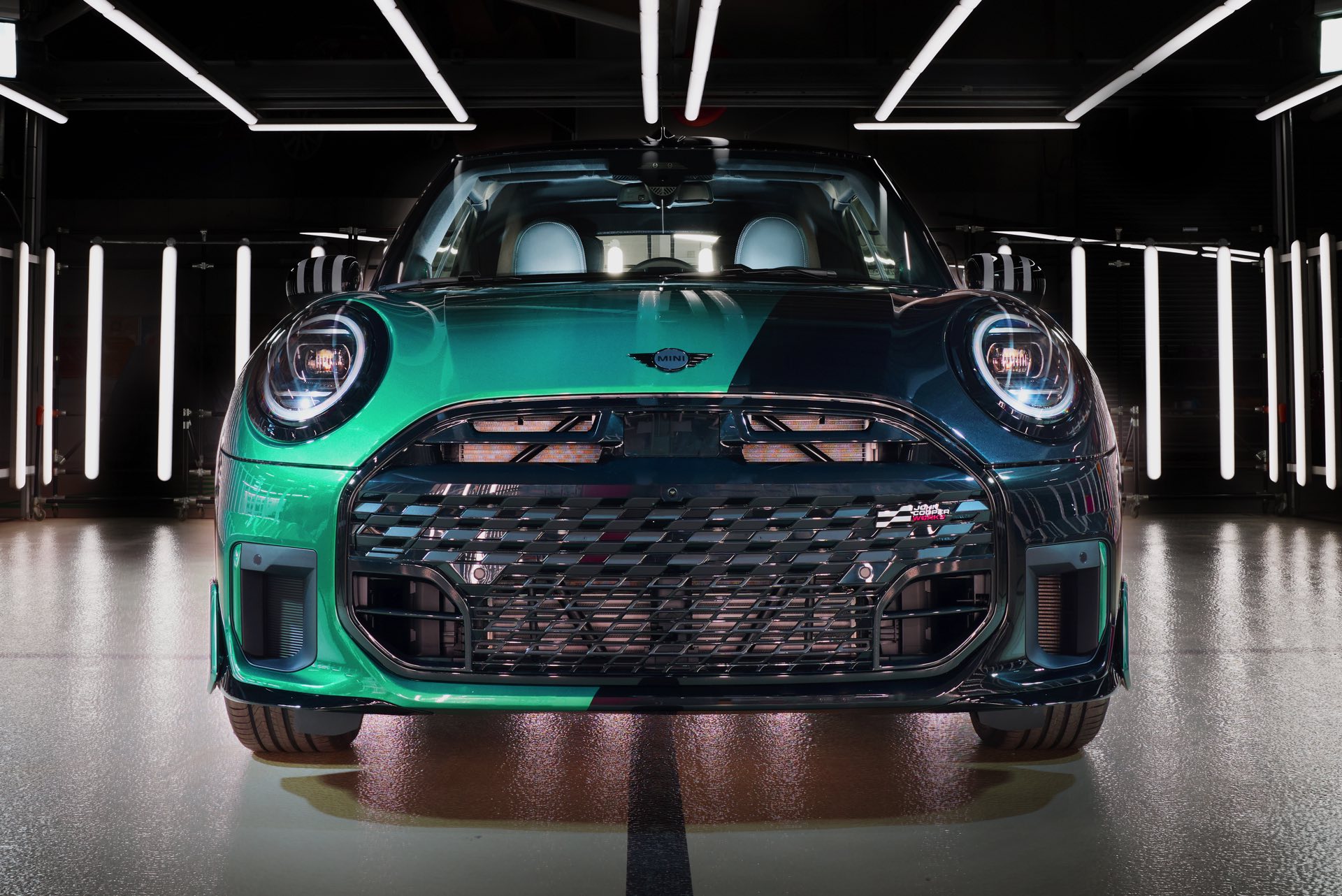 Ein besonderer MINI-Kunde in den USA darf sich schon bald über ein einzigartiges Fahrzeug in der Garage freuen: Das MINI.01 Cabrio auf Basis des aktuellen John Cooper Works-F67 zeigt, was auch im Werk Oxford in Sachen Individualisierung möglich ist. Unumstrittenes Highlight des besonderen Kleinwagens ist eine neue Interpretation der Two-Tone-Lackierung, die wir ab Werk vor allem von Luxus-Automobilen wie Rolls-Royce und BMW 7er kennen. Anders als in diesen Fällen verläuft die Grenze zwischen den beiden Farben beim MINI.01 vertikal, sodass ein Bicolor-Auftritt mit je nach Perspektive ganz anderer Wirkung entsteht: Auf der Fahrerseite glänzt die Front des Cabrios in Midnight Black, die Beifahrerseite ist in einem individuellen Metallic-Grün lackiert. Während am Heck die gleiche Farbenlehre gilt, findet in der Seitenansicht noch ein sehenswerter Wechsel der beiden Lackierungen statt und sorgt endgültig für einen unverwechselbaren Look.