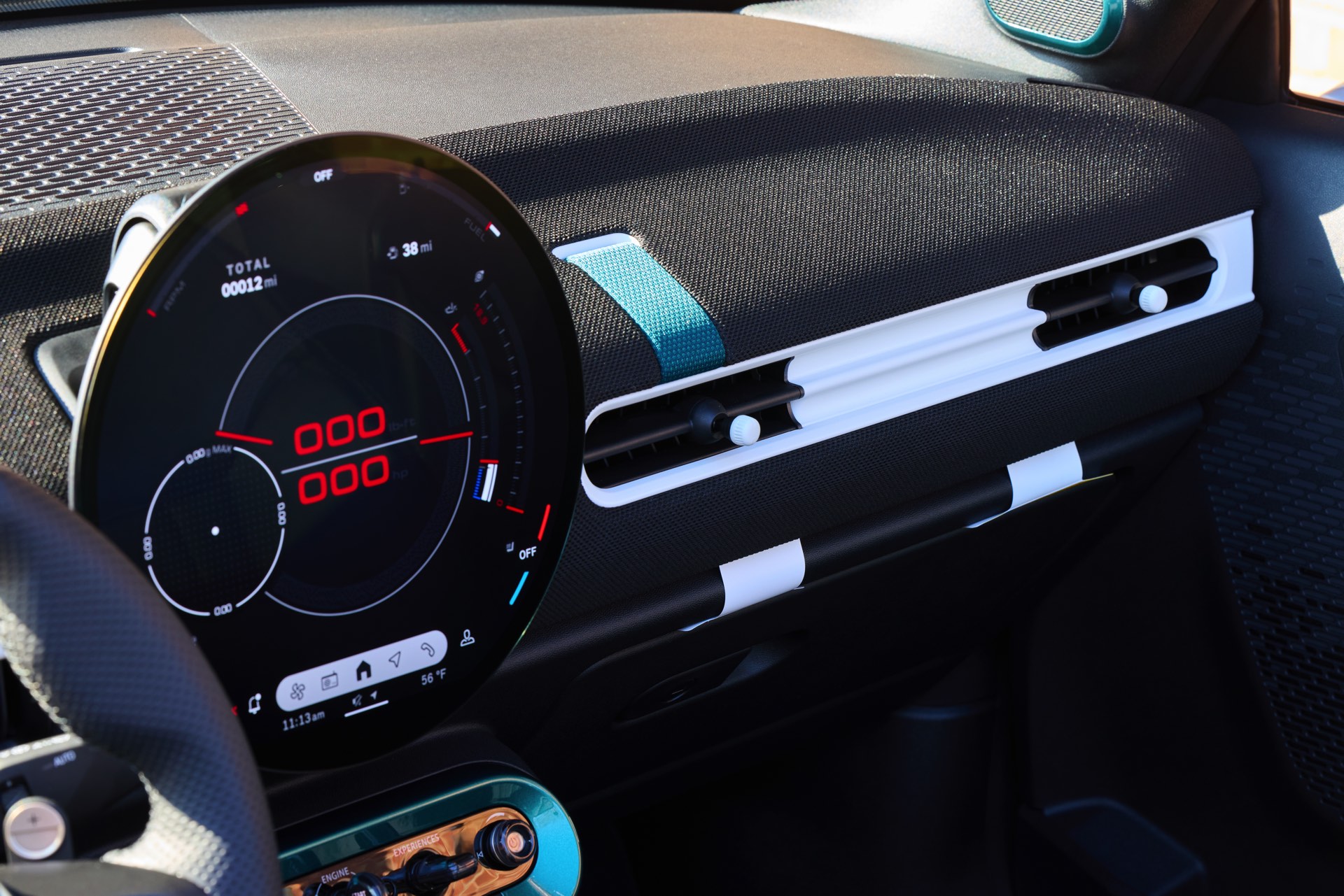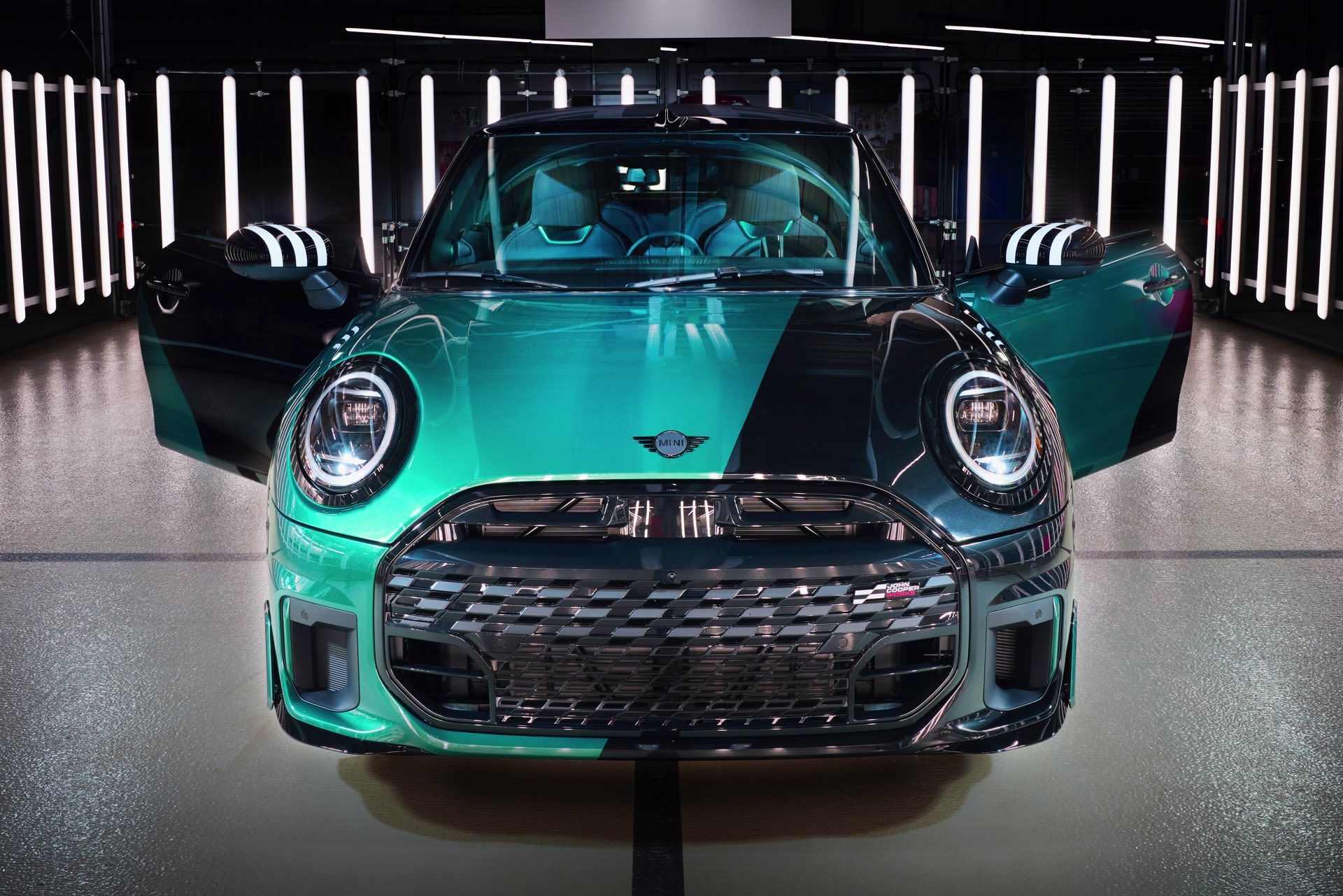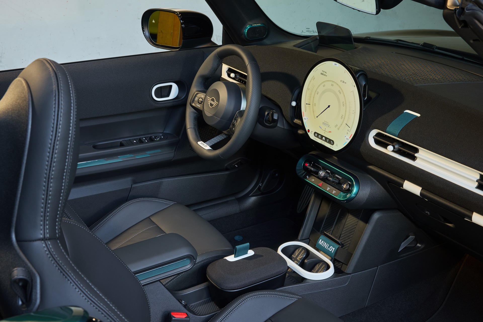 Auch im Innenraum greifen viele lackierte Details das einzigartige Metallic-Grün des Exterieurs wieder auf, angefangen von den „MINI Super Special .01“-Einstiegsleisten bis hin zur Einfassung der wichtigsten Schalter und Knöpfe unterhalb des Centre-Speedo. Am Lenkrad und vor den Cupholdern weisen gestickte MINI.01-Schriftzüge auf den individuellen Anspruch des Unikats hin. Sowohl auf den Sitzen als auch auf dem Aero-Flap vor den Hinterrädern weisen die Buchstaben ‘AL’ dezent auf den Besitzer hin, der ein langjähriger Kunde und absoluter MINI-Fan sein soll.