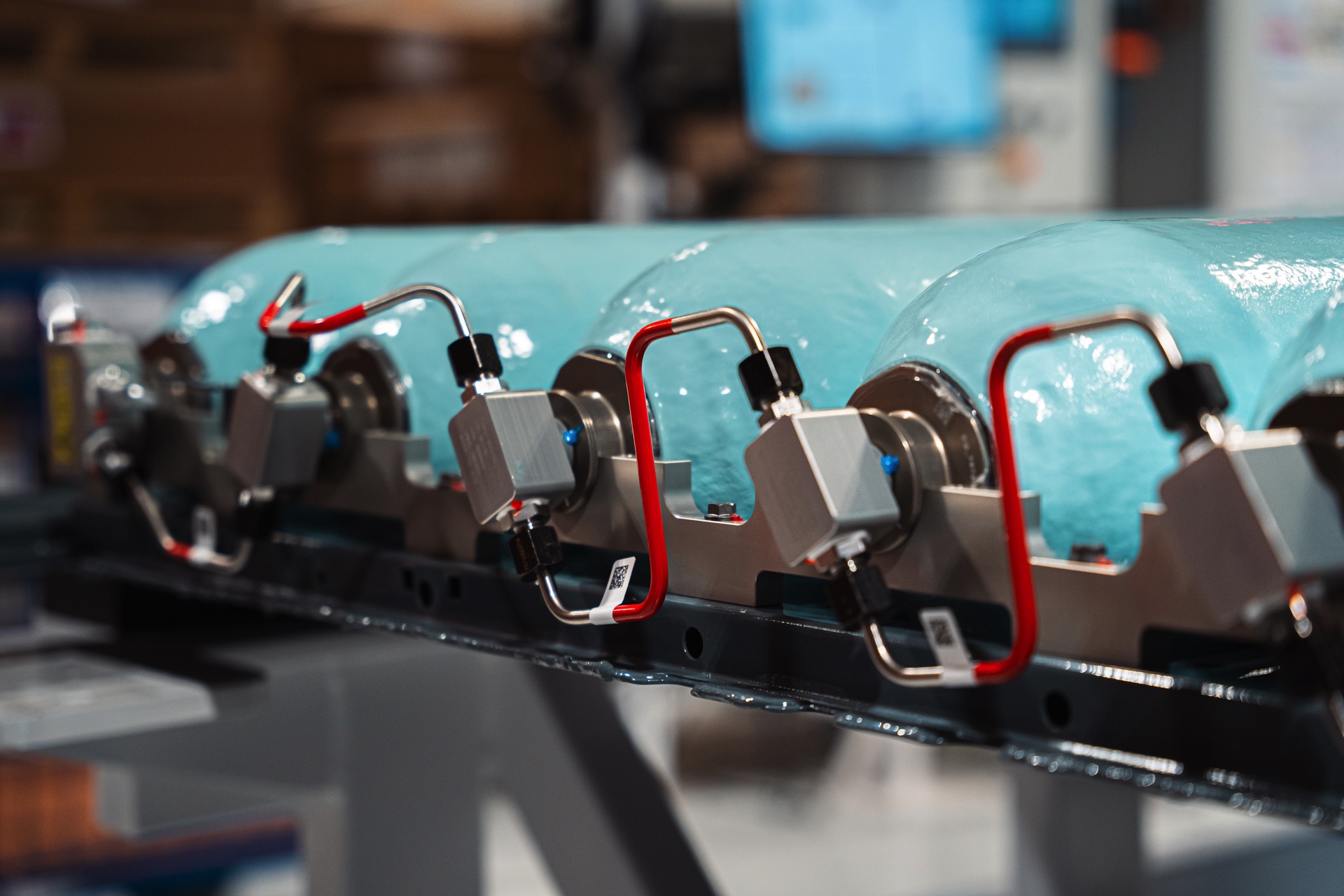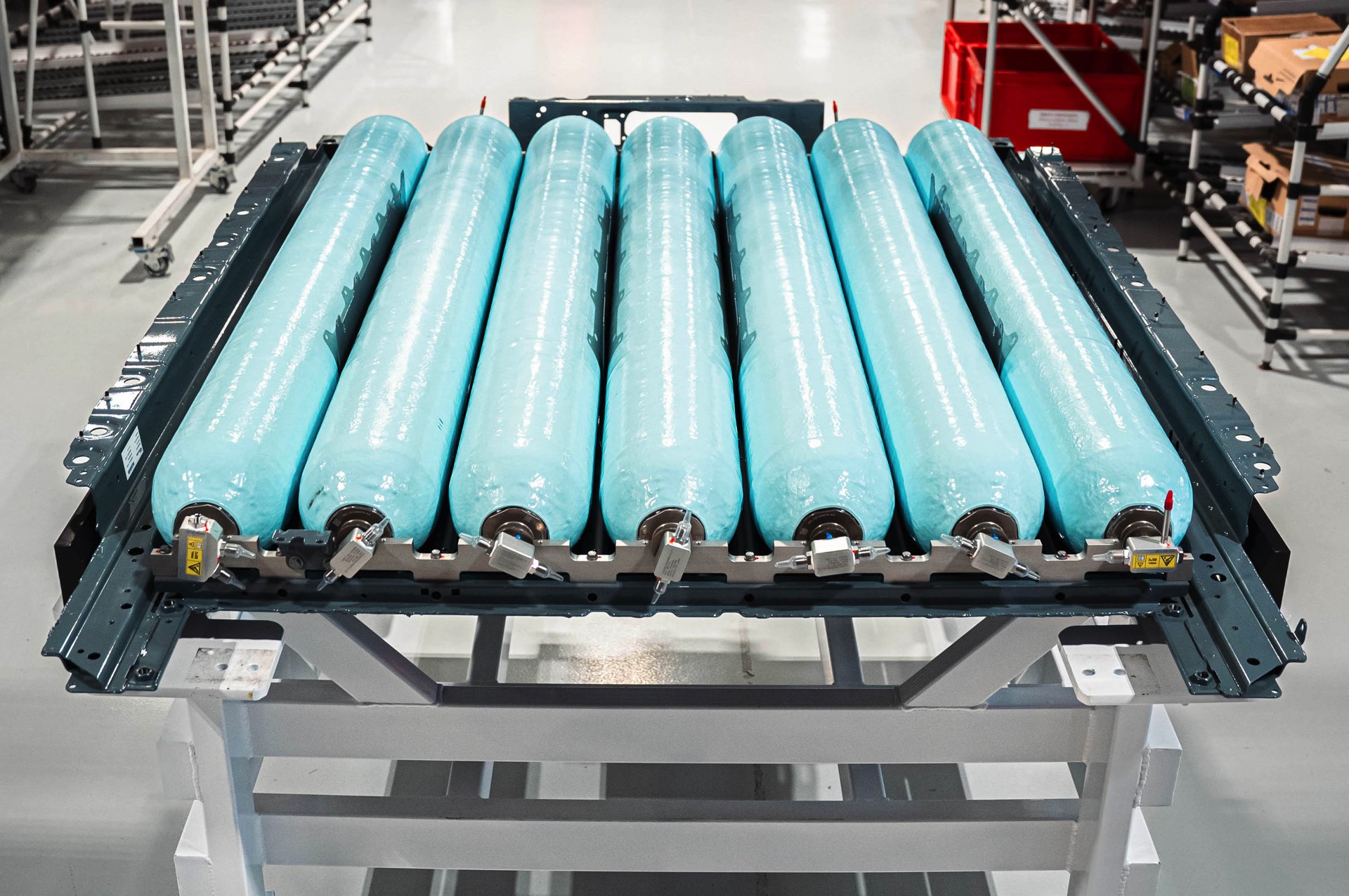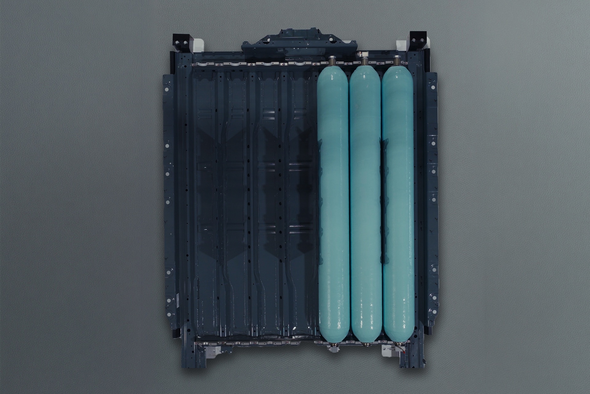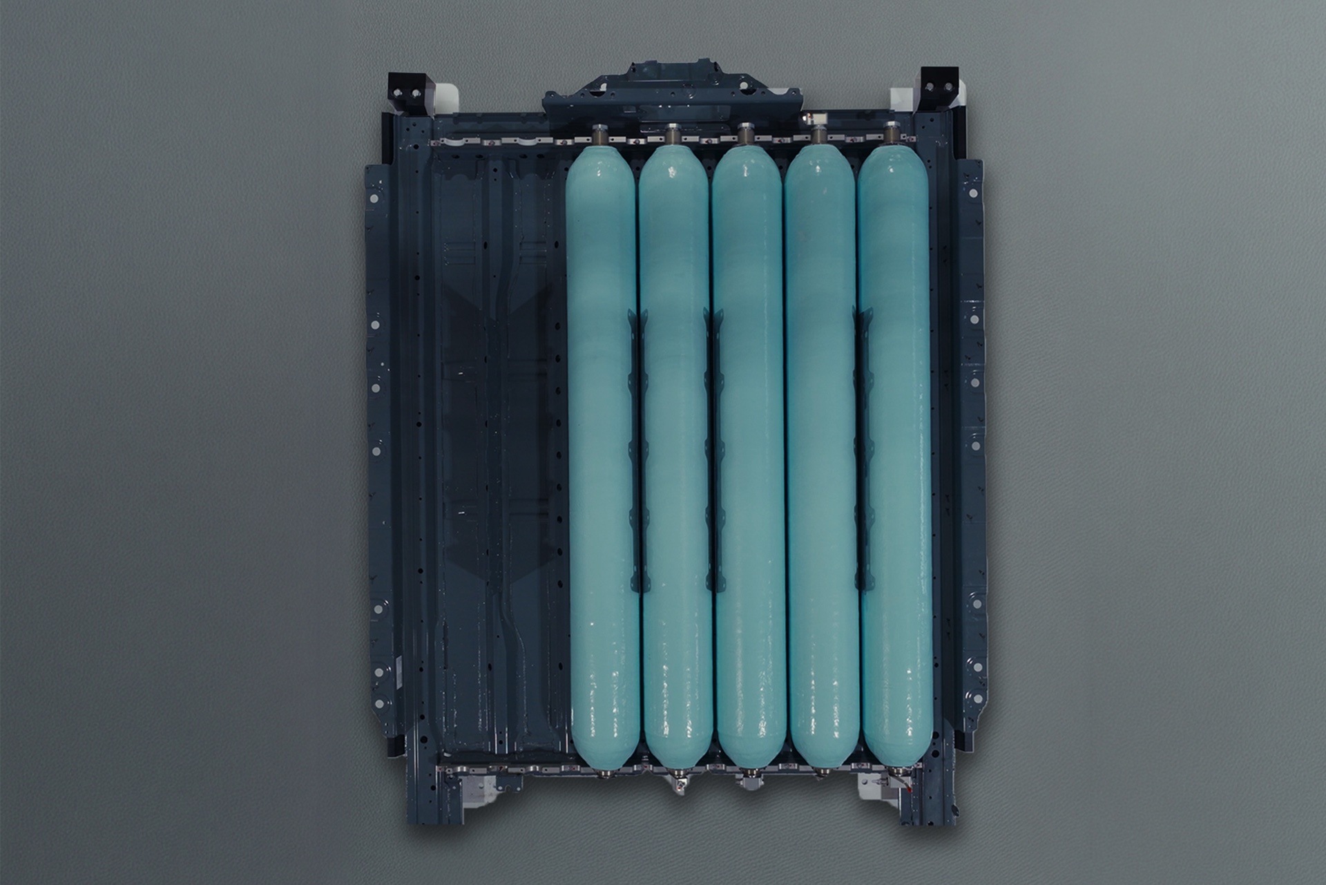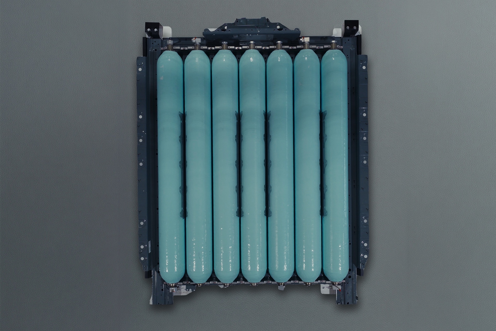 Die sieben Hochdrucktanks bestehen aus kohlefaser-verstärktem Verbundmaterial, sind parallel geschaltet und in einen robusten Metallrahmen eingebettet. Die Behälter bilden so eine durch mehrere Patente geschützte Einheit, die über ein zentrales Hauptventil gesteuert werden kann.