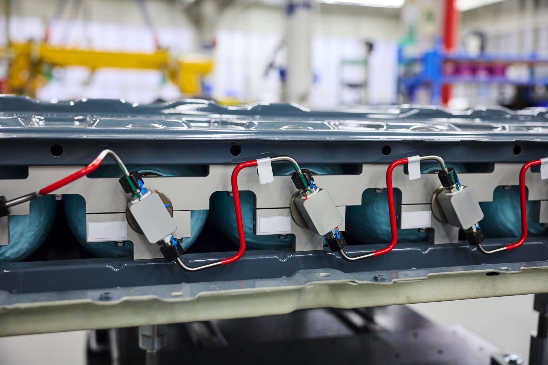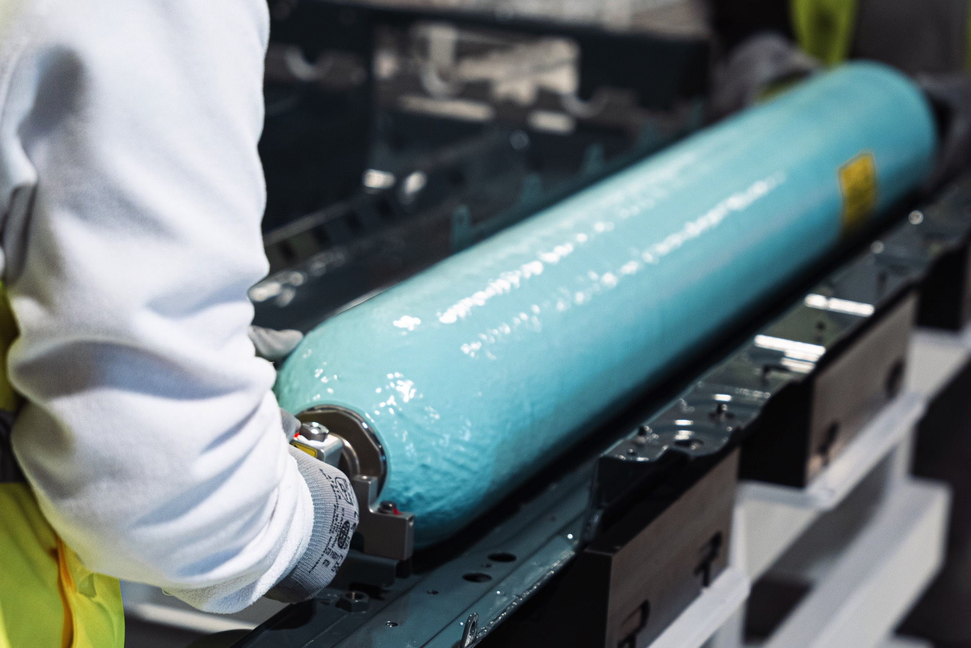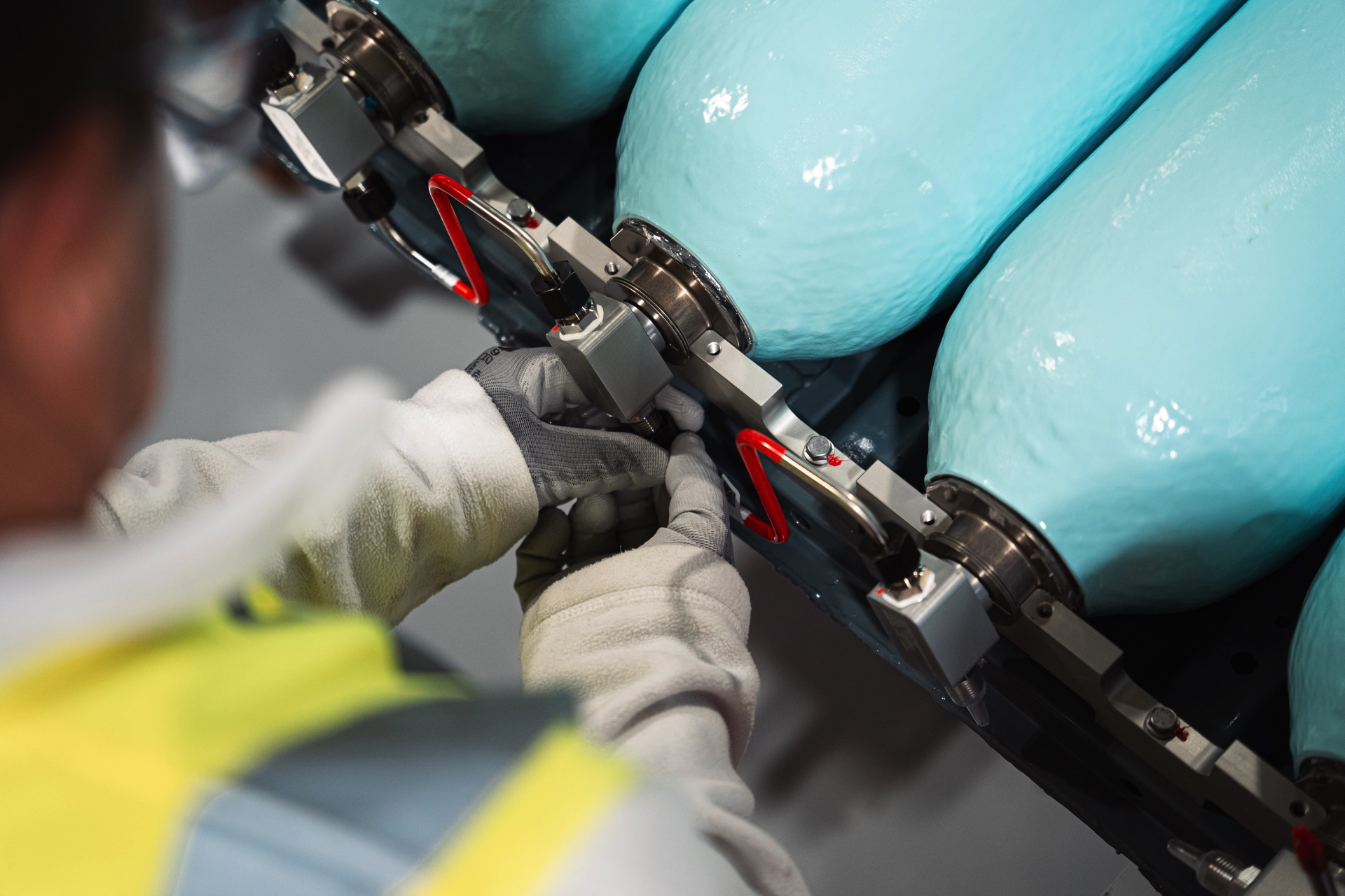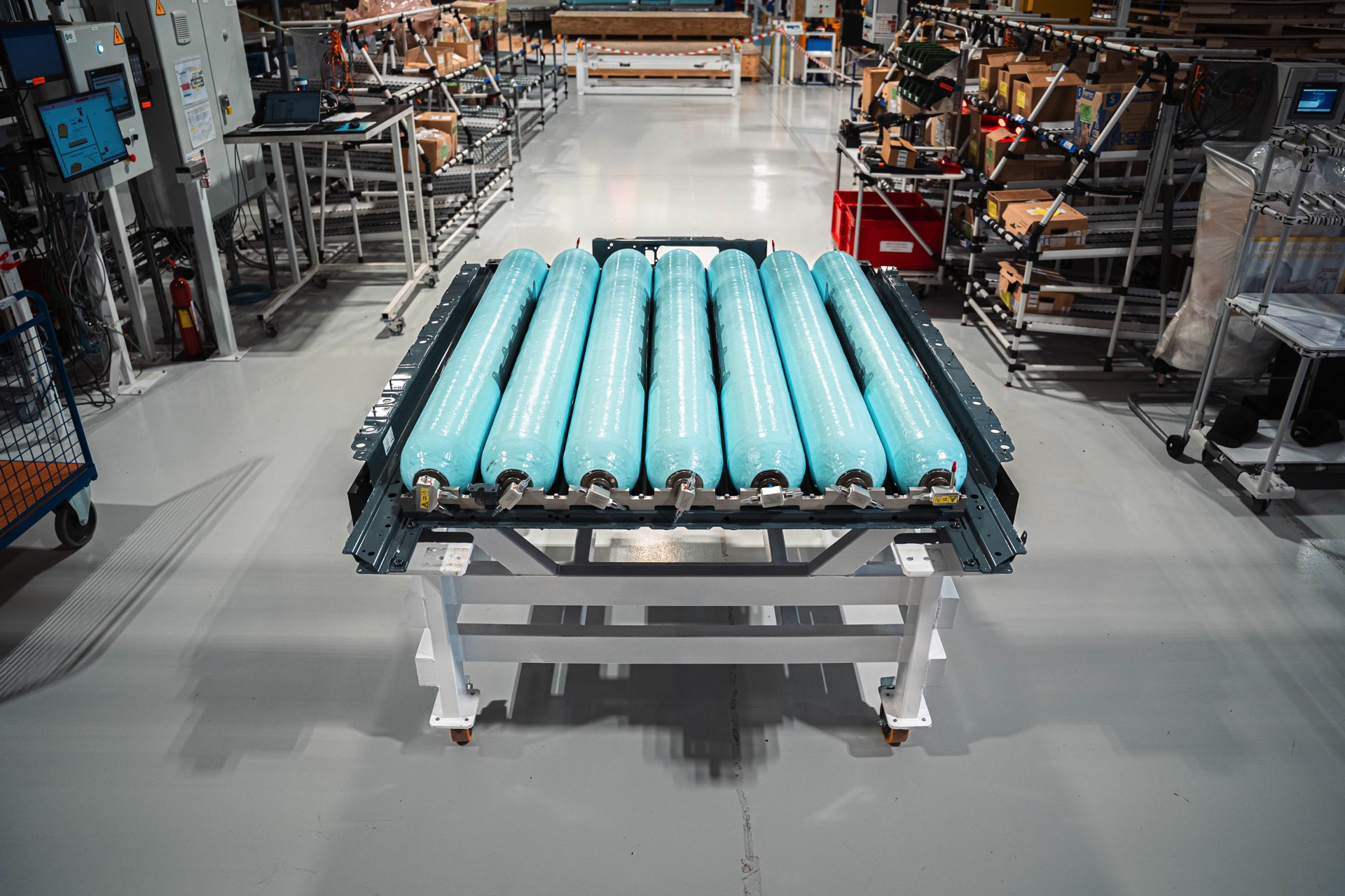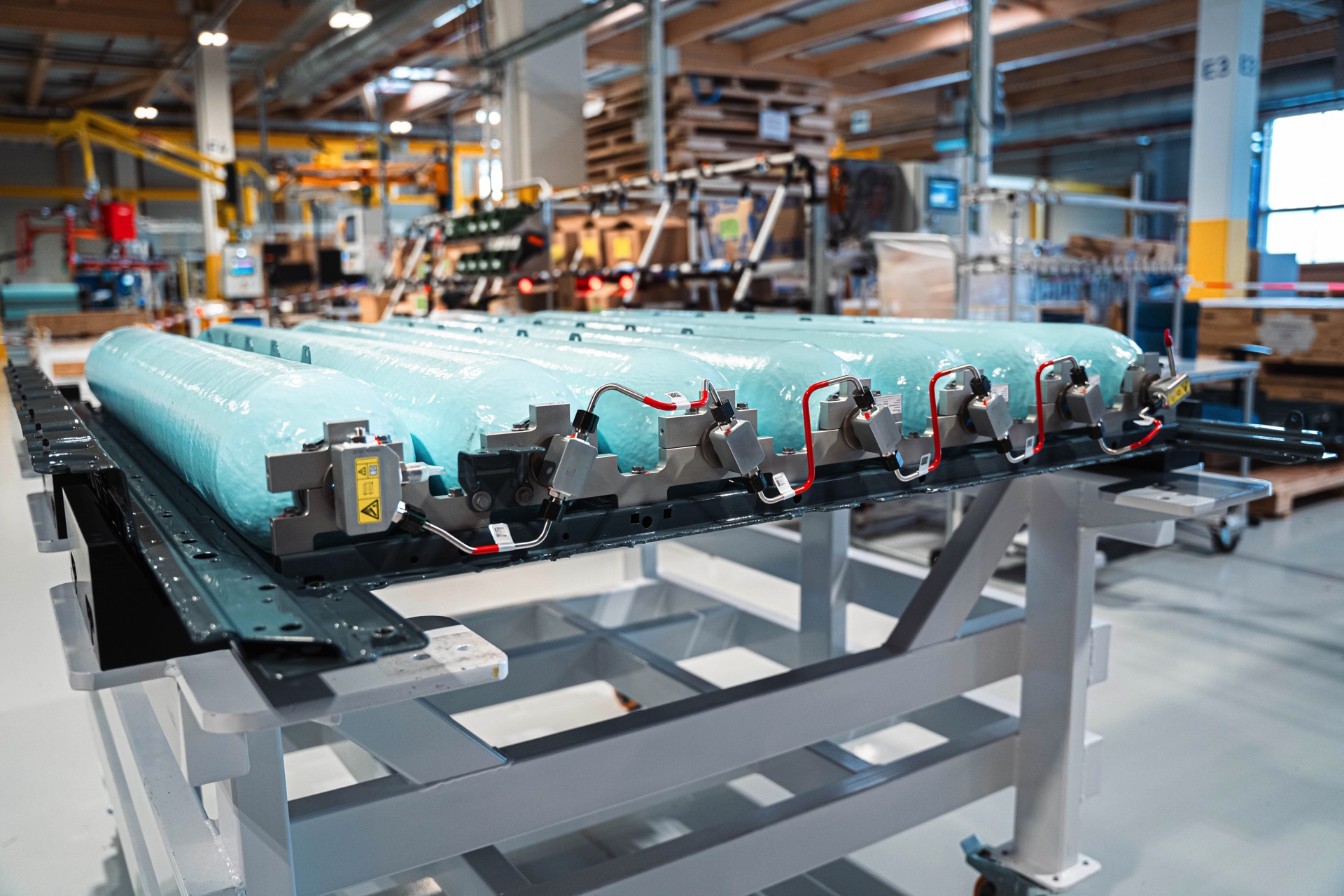 Die sieben Hochdrucktanks bestehen aus kohlefaser-verstärktem Verbundmaterial, sind parallel geschaltet und in einen robusten Metallrahmen eingebettet. Die Behälter bilden so eine durch mehrere Patente geschützte Einheit, die über ein zentrales Hauptventil gesteuert werden kann.