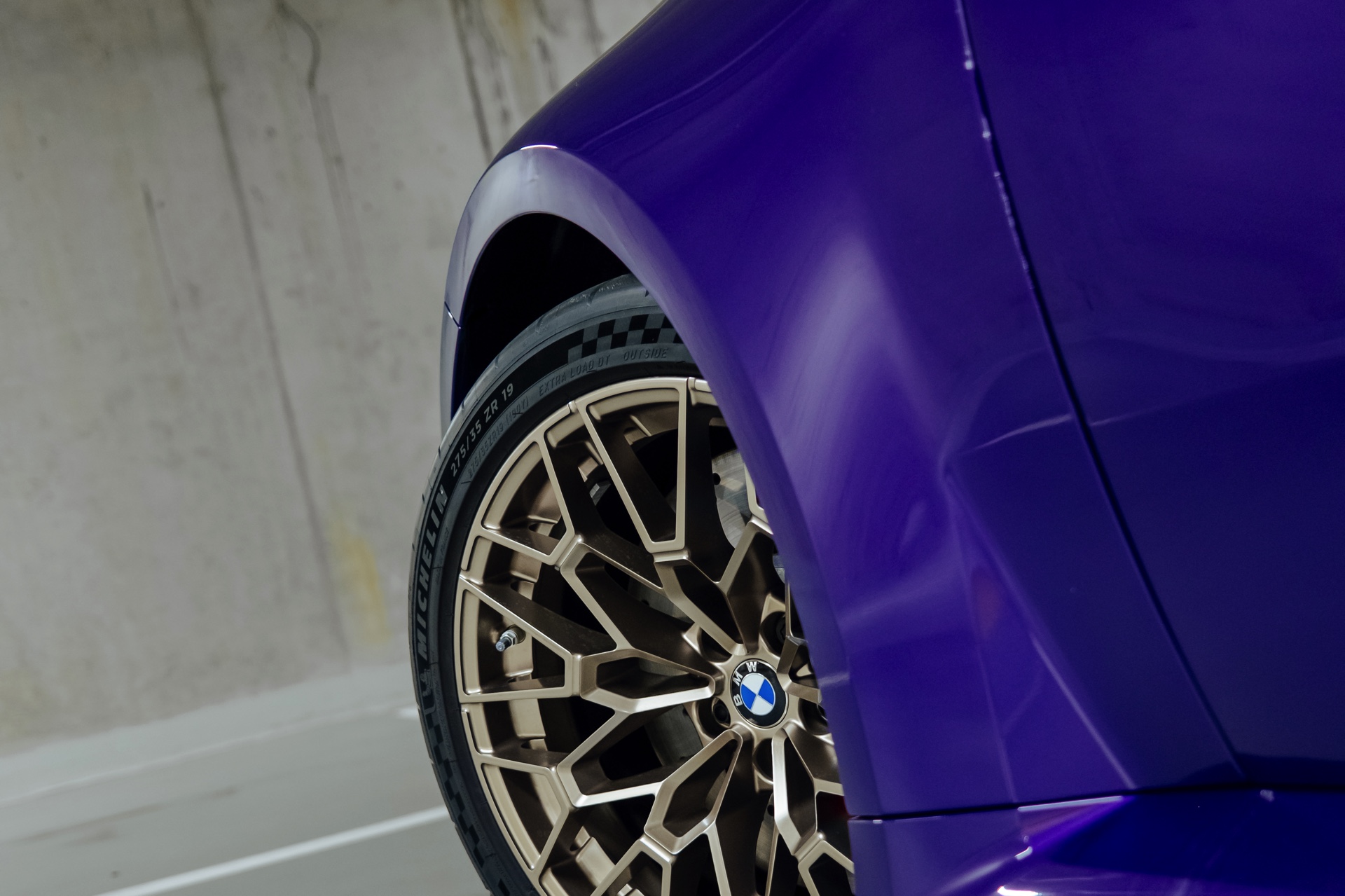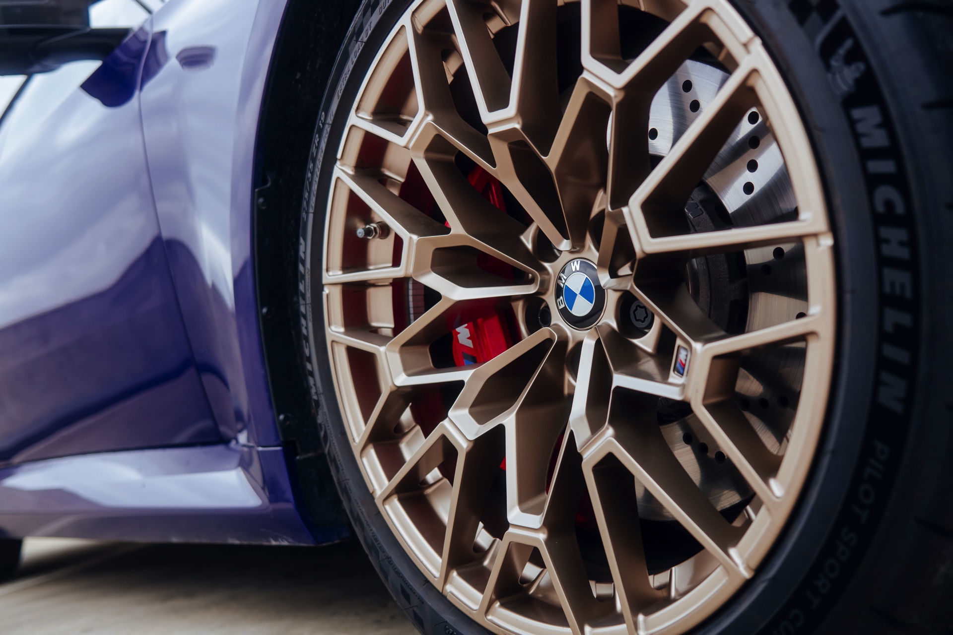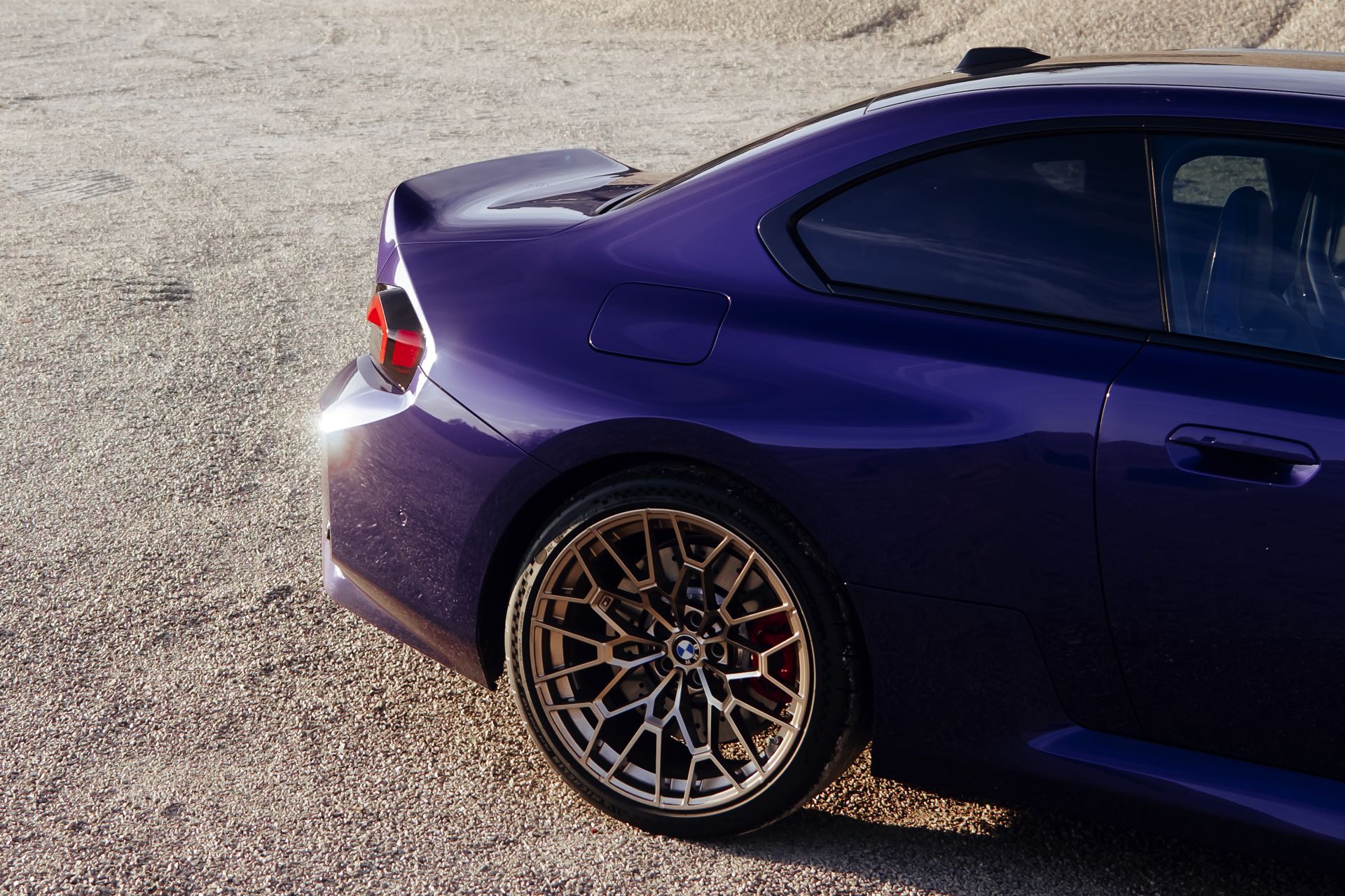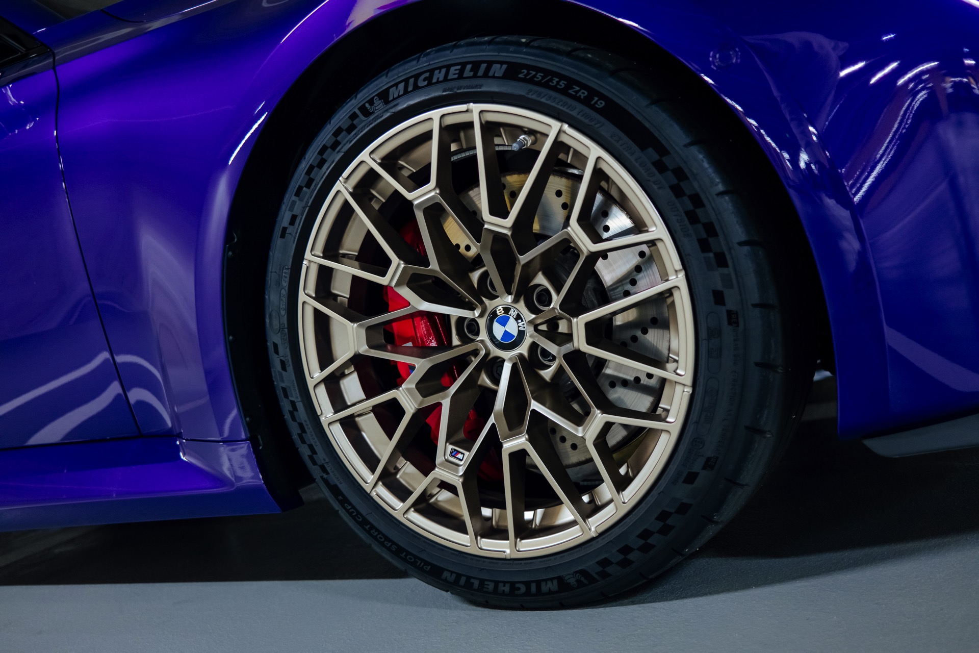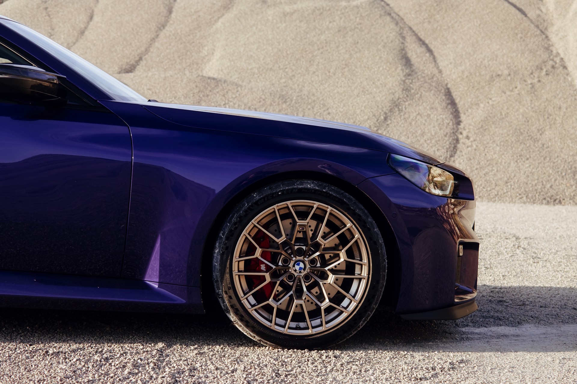 Neben Velvet Blue hat der BMW M2 CS (G87 LCI) noch eine Vielzahl weiterer Besonderheiten, die allesamt vom Bürzel am Heck überragt werden: Die CS-spezifische Heckklappe mit integriertem Spoiler ist ein absoluter Hingucker, der das Topmodell aus vielen Perspektiven unverwechselbar macht. Kaum weniger auffällig sind die in Gold-Bronze lackierten Felgen im Design Sternspeiche 827 M, die vorne 19 Zoll und hinten sogar 20 Zoll groß sind. Auf den Fotos sind die Felgen vorn mit 275 und hinten mit 285 Millimeter breiten Sportreifen vom Typ Michelin Pilot Sport Cup 2 bezogen, je nach persönlicher Präferenz stehen aber auch andere Reifen ab Werk zur Wahl.