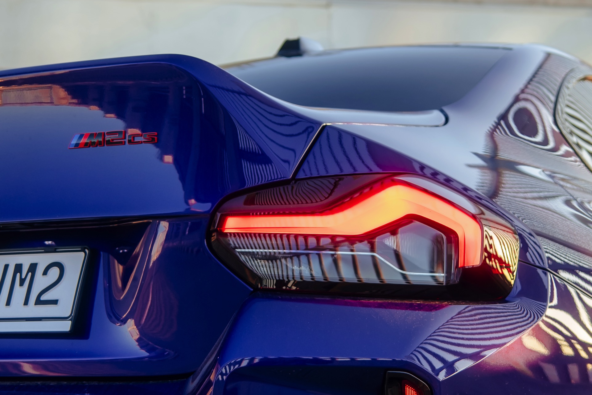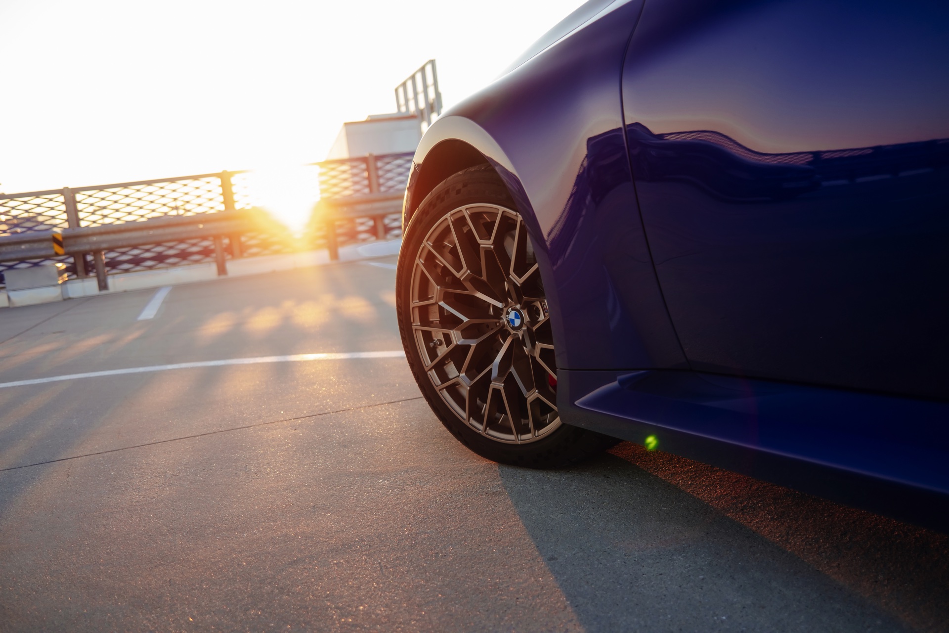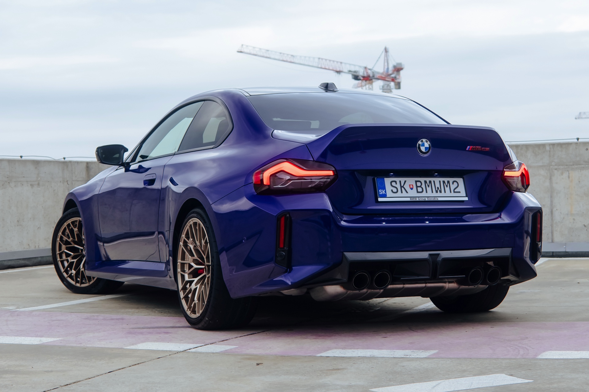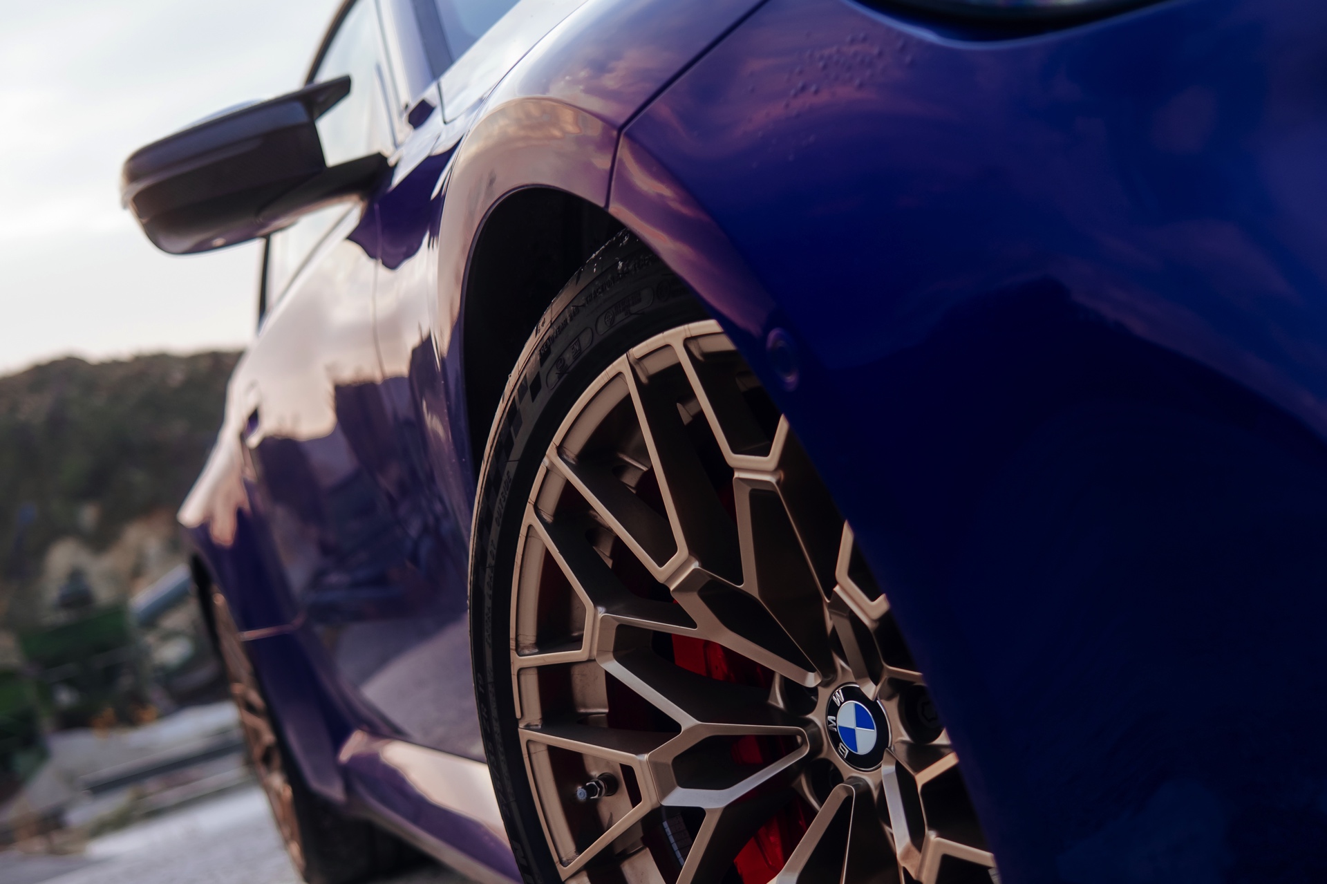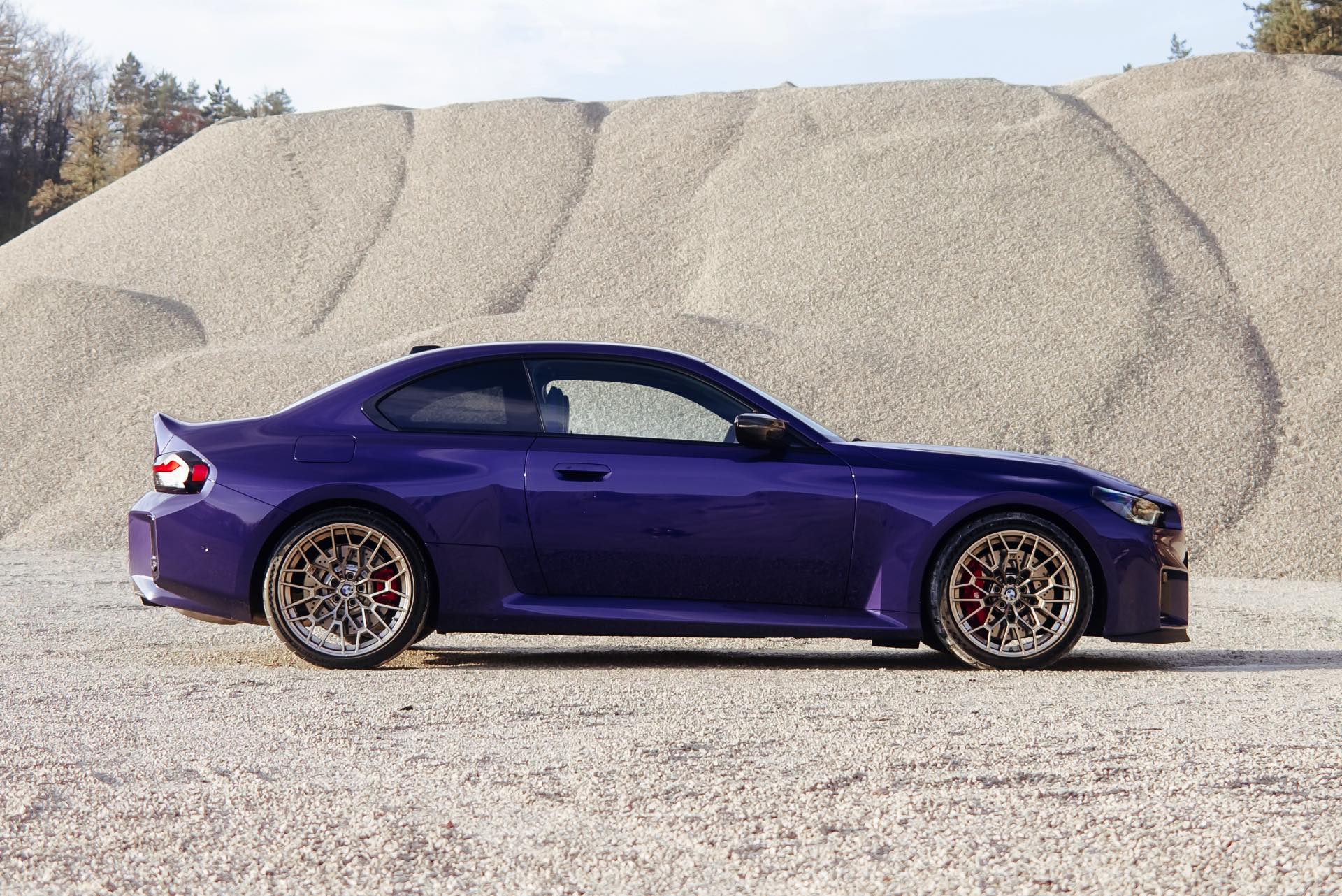 Neben Velvet Blue hat der BMW M2 CS (G87 LCI) noch eine Vielzahl weiterer Besonderheiten, die allesamt vom Bürzel am Heck überragt werden: Die CS-spezifische Heckklappe mit integriertem Spoiler ist ein absoluter Hingucker, der das Topmodell aus vielen Perspektiven unverwechselbar macht. Kaum weniger auffällig sind die in Gold-Bronze lackierten Felgen im Design Sternspeiche 827 M, die vorne 19 Zoll und hinten sogar 20 Zoll groß sind. Auf den Fotos sind die Felgen vorn mit 275 und hinten mit 285 Millimeter breiten Sportreifen vom Typ Michelin Pilot Sport Cup 2 bezogen, je nach persönlicher Präferenz stehen aber auch andere Reifen ab Werk zur Wahl.