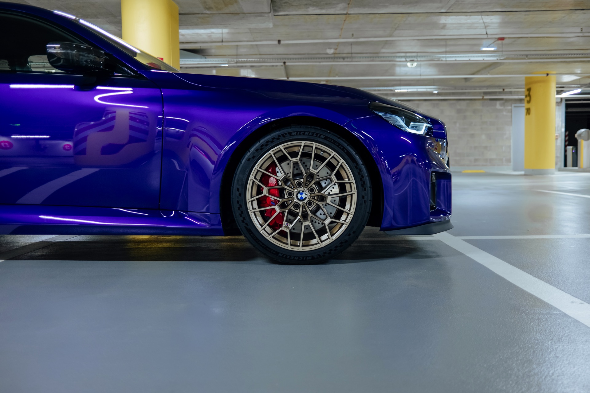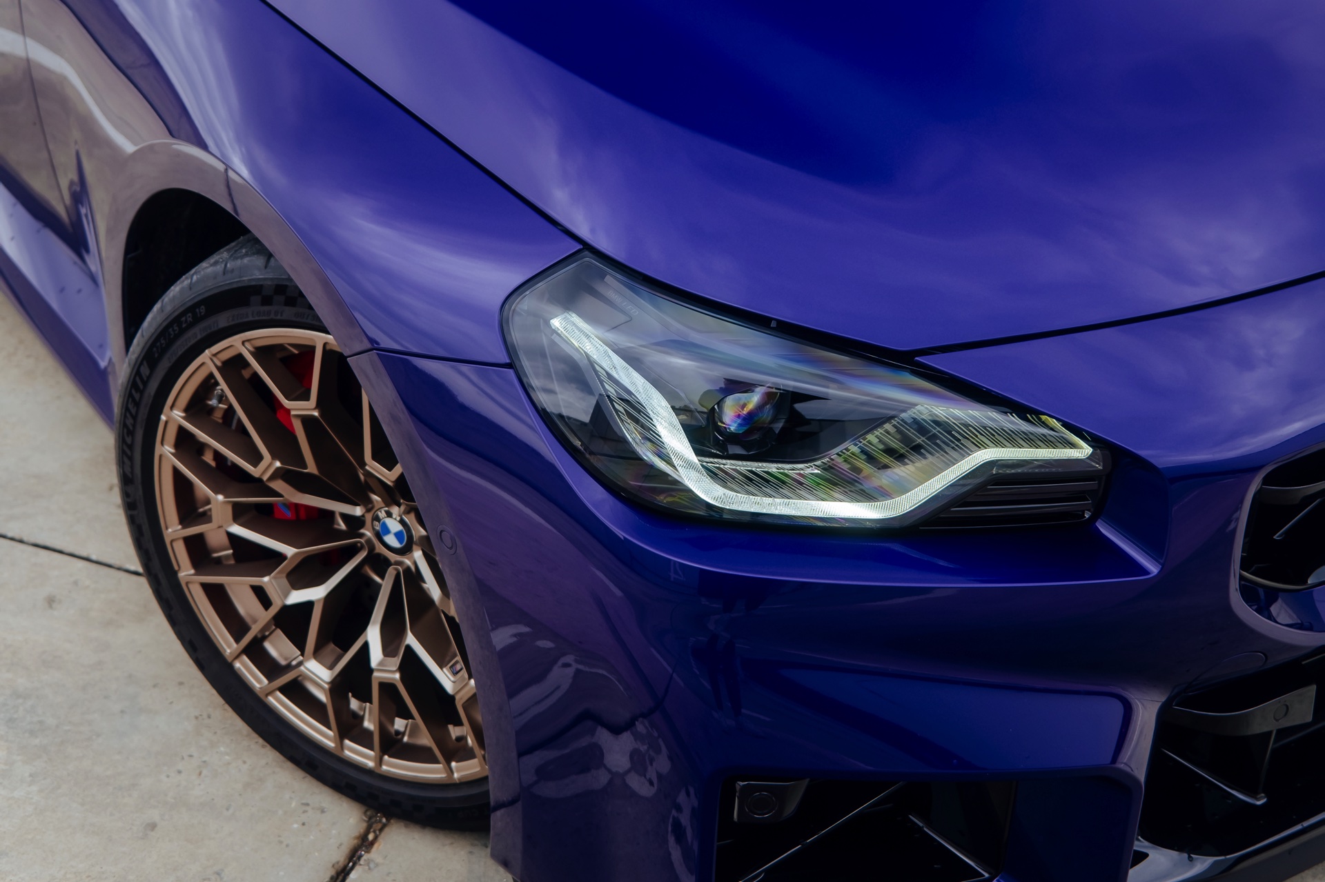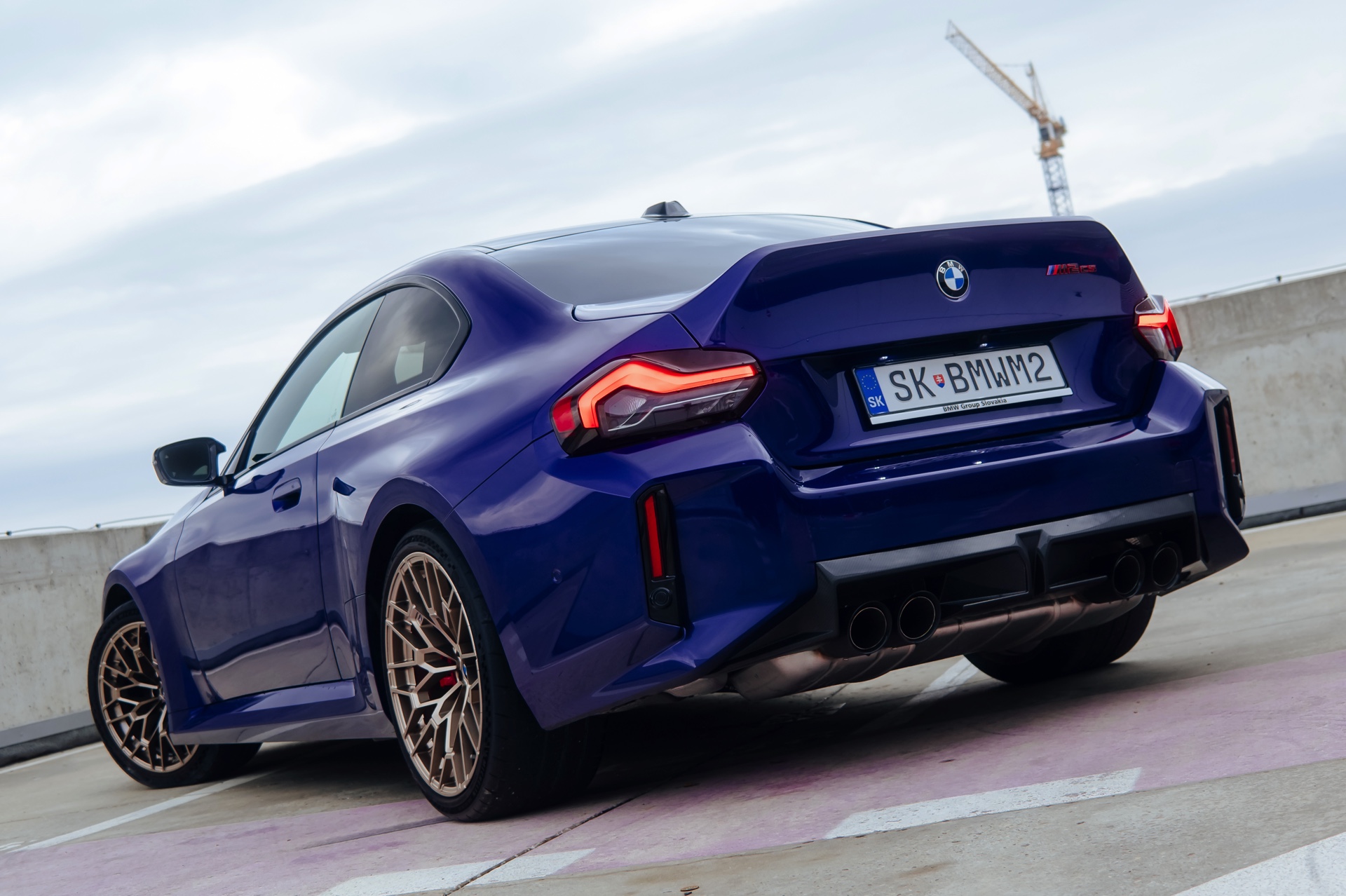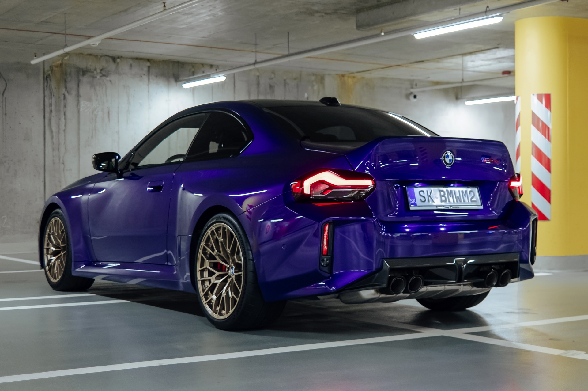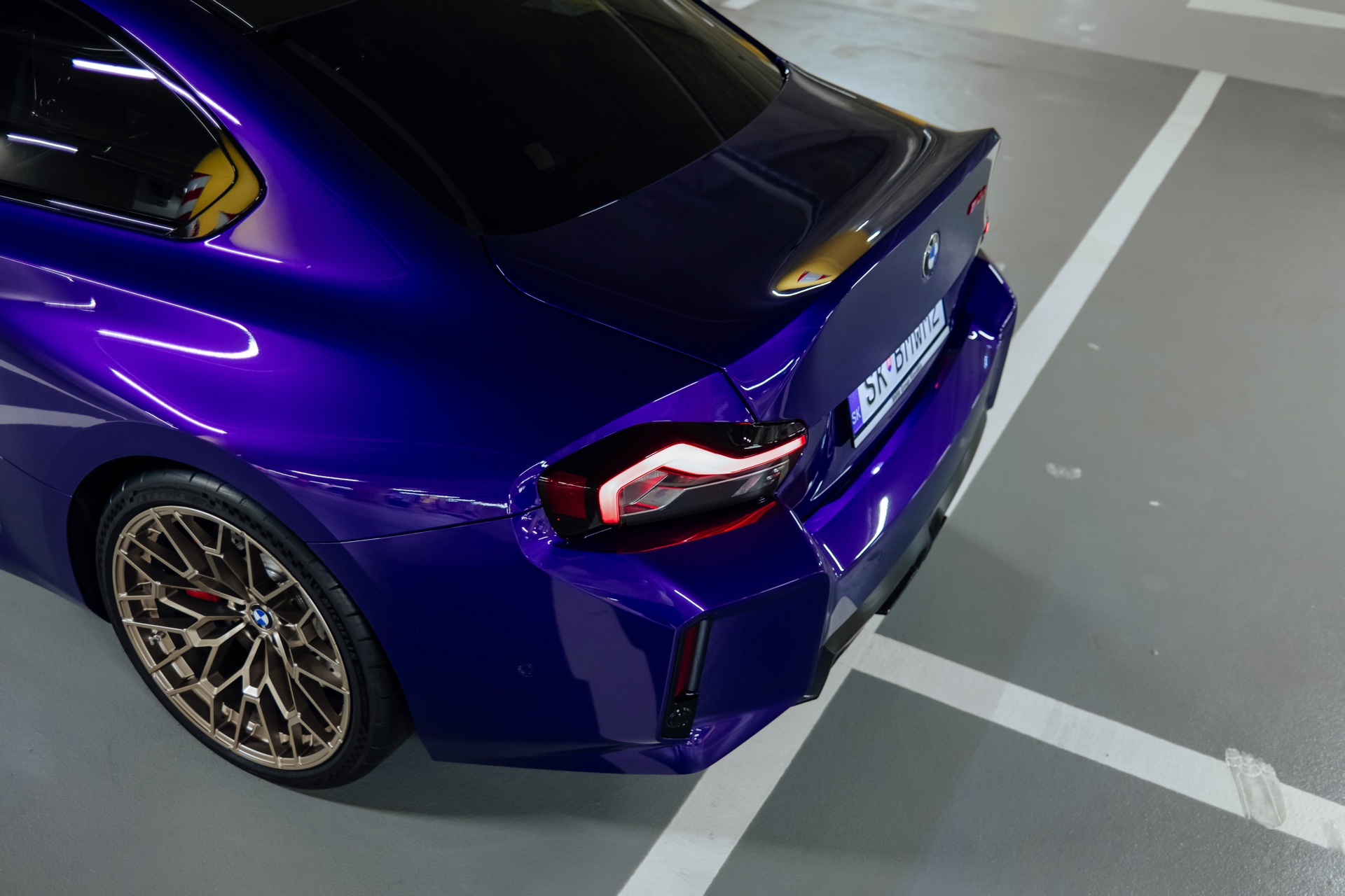 Neben Velvet Blue hat der BMW M2 CS (G87 LCI) noch eine Vielzahl weiterer Besonderheiten, die allesamt vom Bürzel am Heck überragt werden: Die CS-spezifische Heckklappe mit integriertem Spoiler ist ein absoluter Hingucker, der das Topmodell aus vielen Perspektiven unverwechselbar macht. Kaum weniger auffällig sind die in Gold-Bronze lackierten Felgen im Design Sternspeiche 827 M, die vorne 19 Zoll und hinten sogar 20 Zoll groß sind. Auf den Fotos sind die Felgen vorn mit 275 und hinten mit 285 Millimeter breiten Sportreifen vom Typ Michelin Pilot Sport Cup 2 bezogen, je nach persönlicher Präferenz stehen aber auch andere Reifen ab Werk zur Wahl.