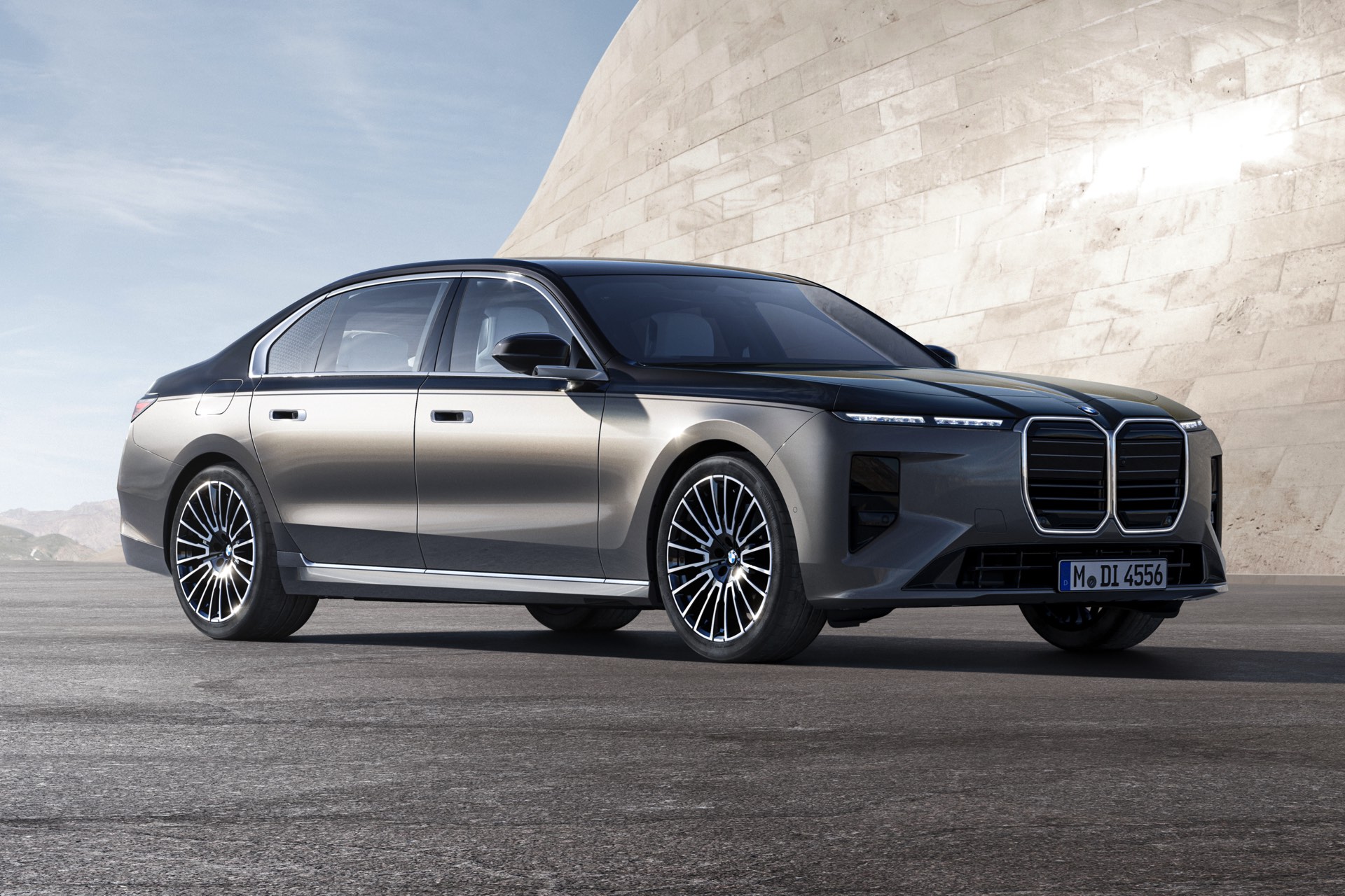 Gleich die ersten Fotos zeigen das BMW 7er Facelift (G70 LCI) mit einer BMW Individual Two-Tone-Lackierung, die einen noch spezielleren Auftritt garantiert. In der Seitenansicht sehen wir eine erste Variante der nun ab Werk bis zu 22 Zoll großen Felgen, die auch die großen Radhäuser der fast 5,40 Meter langen Limousine souverän ausfüllen. Kein Zweifel: Verwechslungen mit kleineren Baureihen wie dem 5er sind bei BMW auch weiterhin ausgeschlossen, das Topmodell zelebriert seinen eigenständigen Look und trägt den Luxus-Anspruch selbstbewusst nach außen: