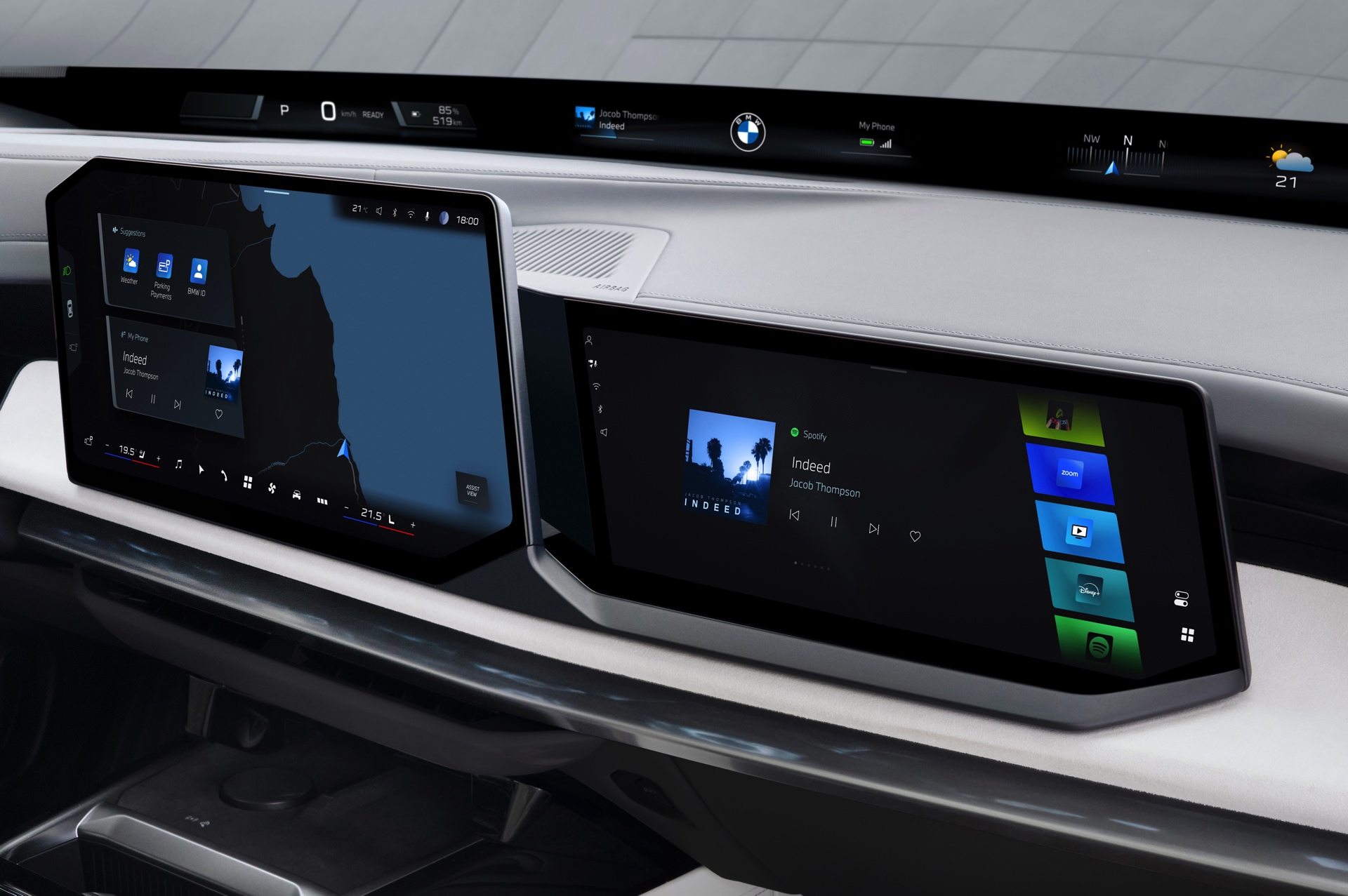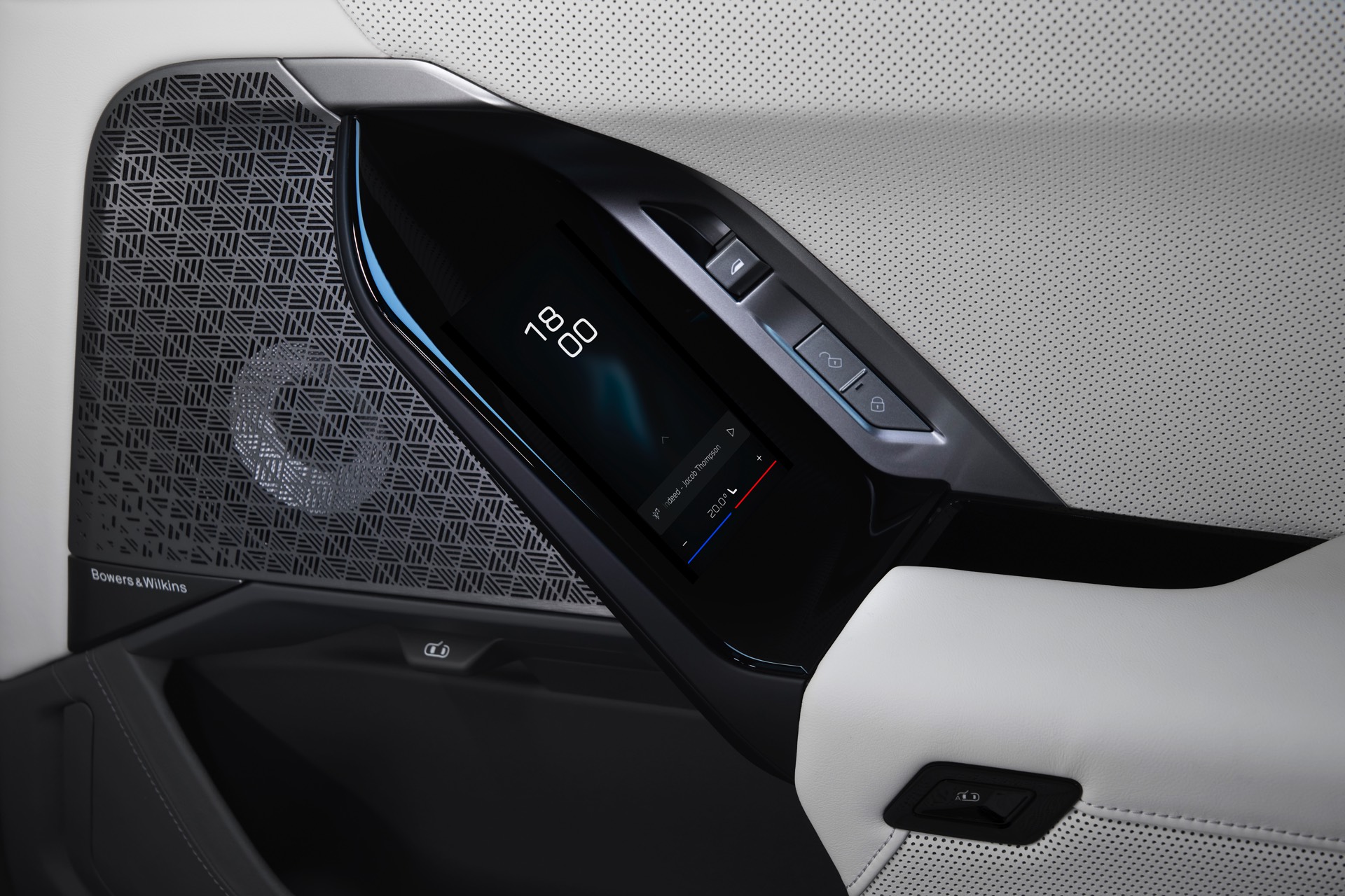 Das Zusatz-Display für den Beifahrer misst rund 14 Zoll und ist damit sichtbar kleiner als das knapp 18 Zoll große Haupt-Display, das auch im BMW 7er vom Panoramic Vision Display am Fuß der Frontscheibe und von einem Head-up-Display für den Fahrer flankiert wird. Mit der in den Innenspiegel integrierten Kamera, die auch die Aufmerksamkeit des Fahrers bei der Nutzung von aus dem iX3 bekannten Features wie Autobahn-Assistent und Symbiotic Drive überwacht, wird eine Ablenkung des Fahrers durch das Beifahrer-Display weitgehend ausgeschlossen.
